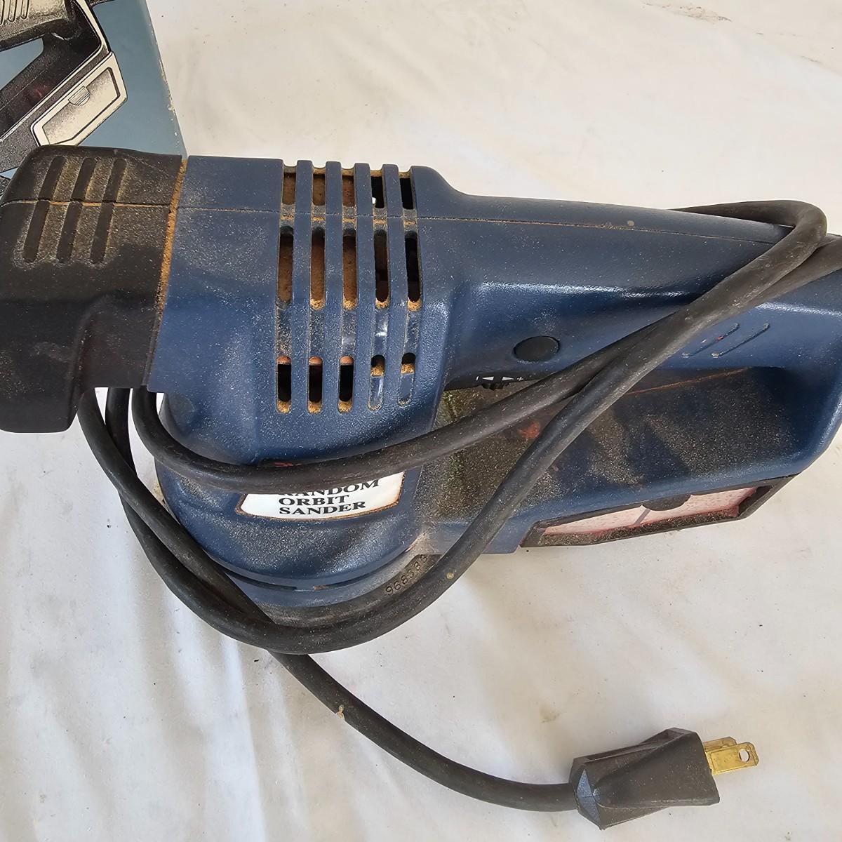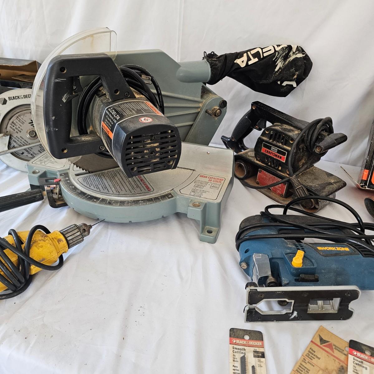 A drill, two sanders, circular saw, cordless drill, chop saw and more. Delta 10" miter saw with extra blades, Ryobi orbital sander, Craftsman belt sander and 7" circular saw. DeWalt 3/8" hand drill. Work zone jigsaw with extra blades. All tools powered on when plugged in. Most items used. See photos for details. Local pickup only.