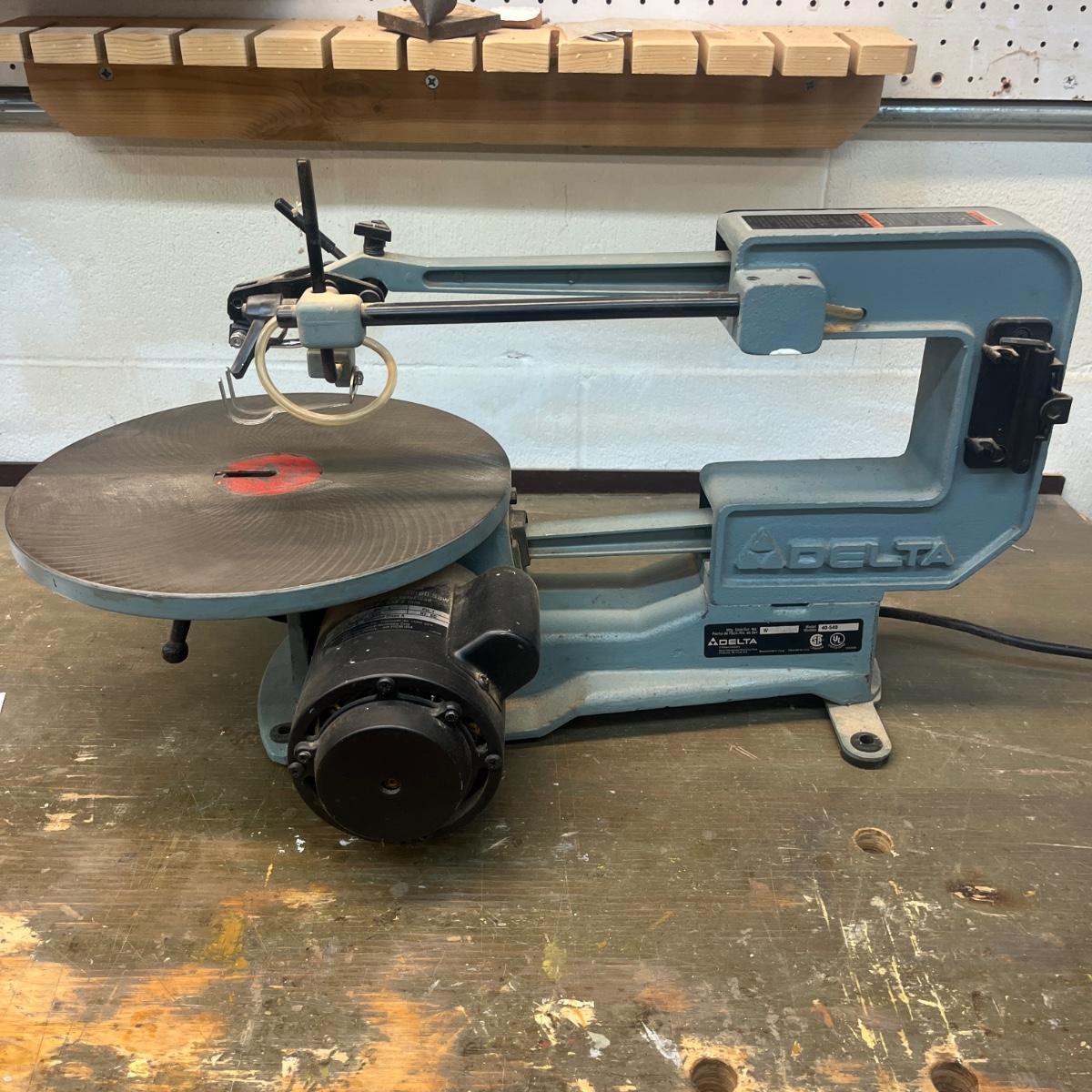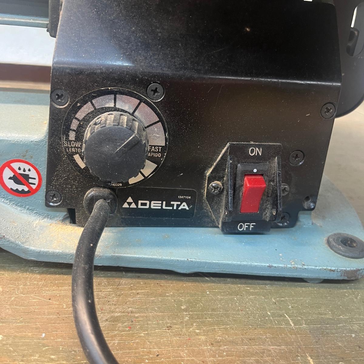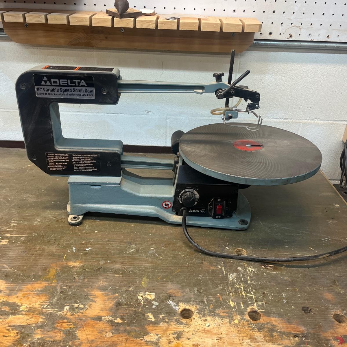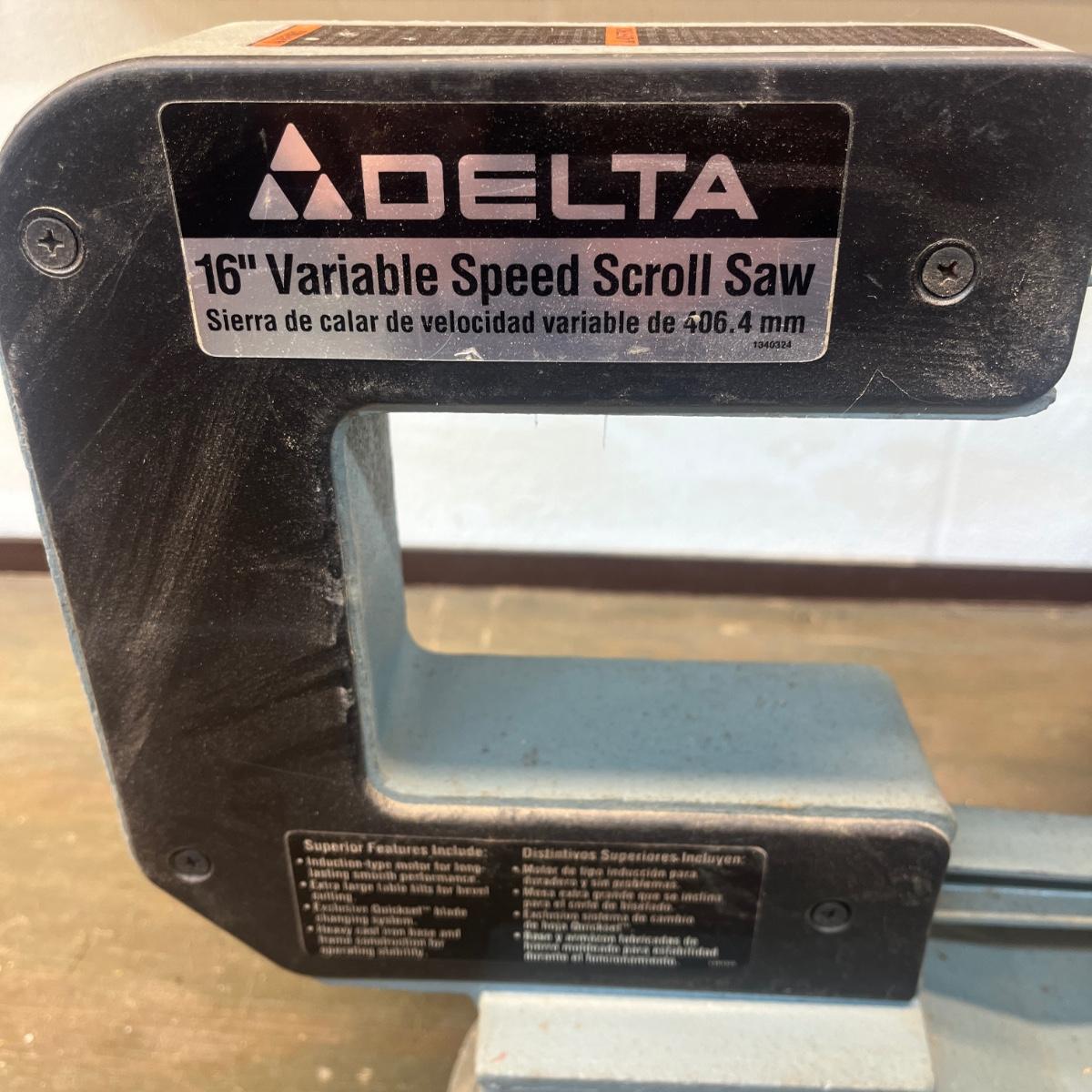 This Delta 16” variable speed scroll powered on when plugged in and measures 12” x 24” x 12”H. Also includes a small selection of blades.