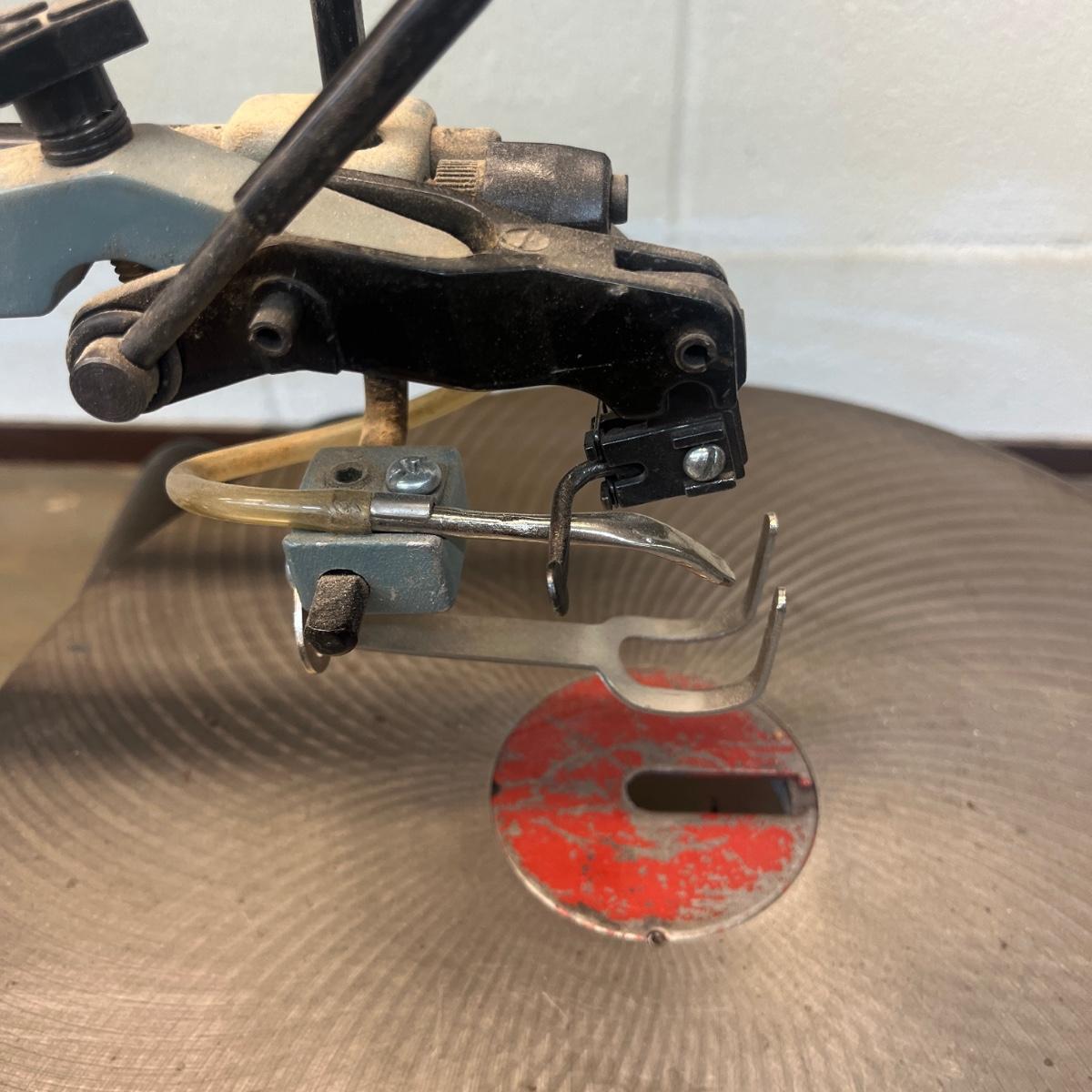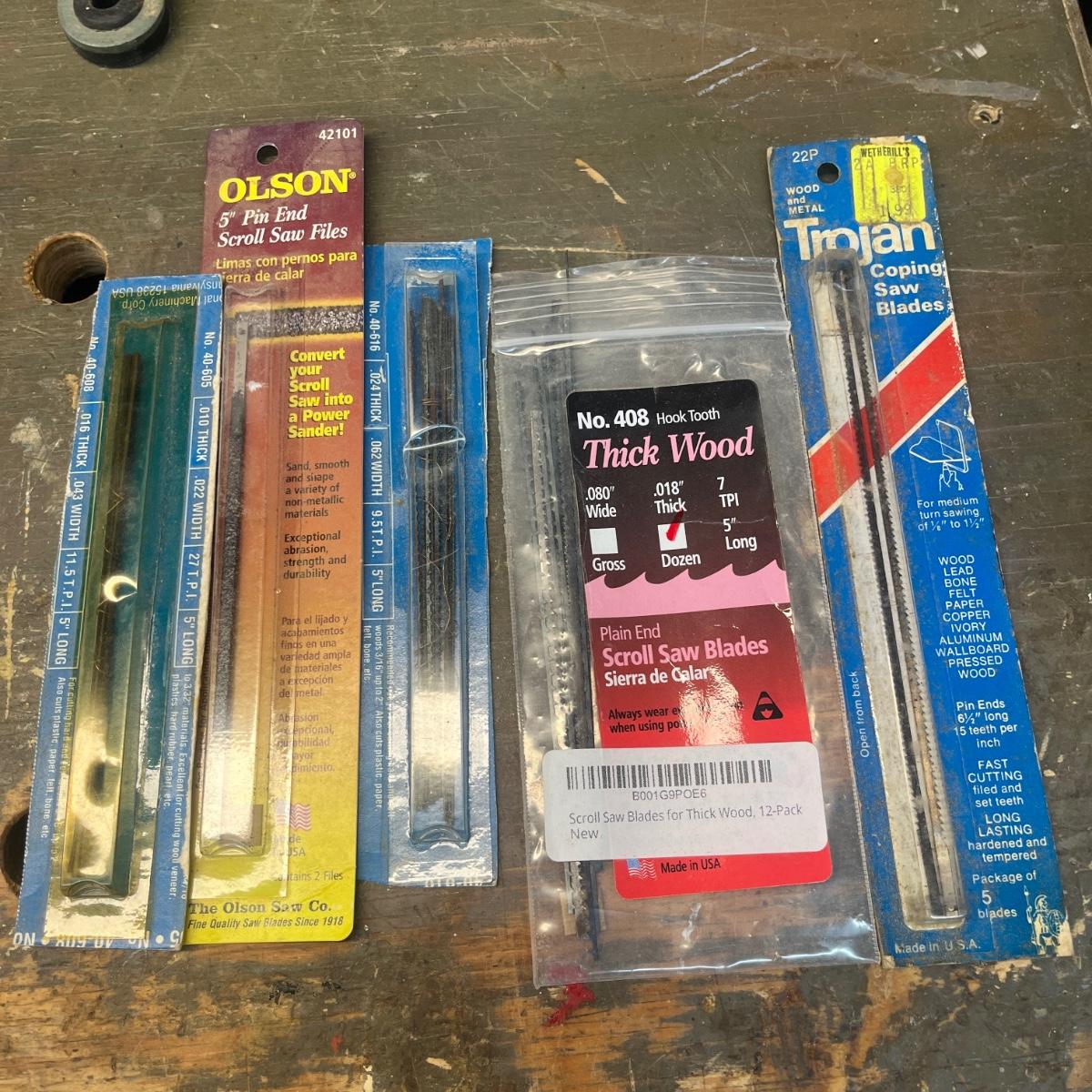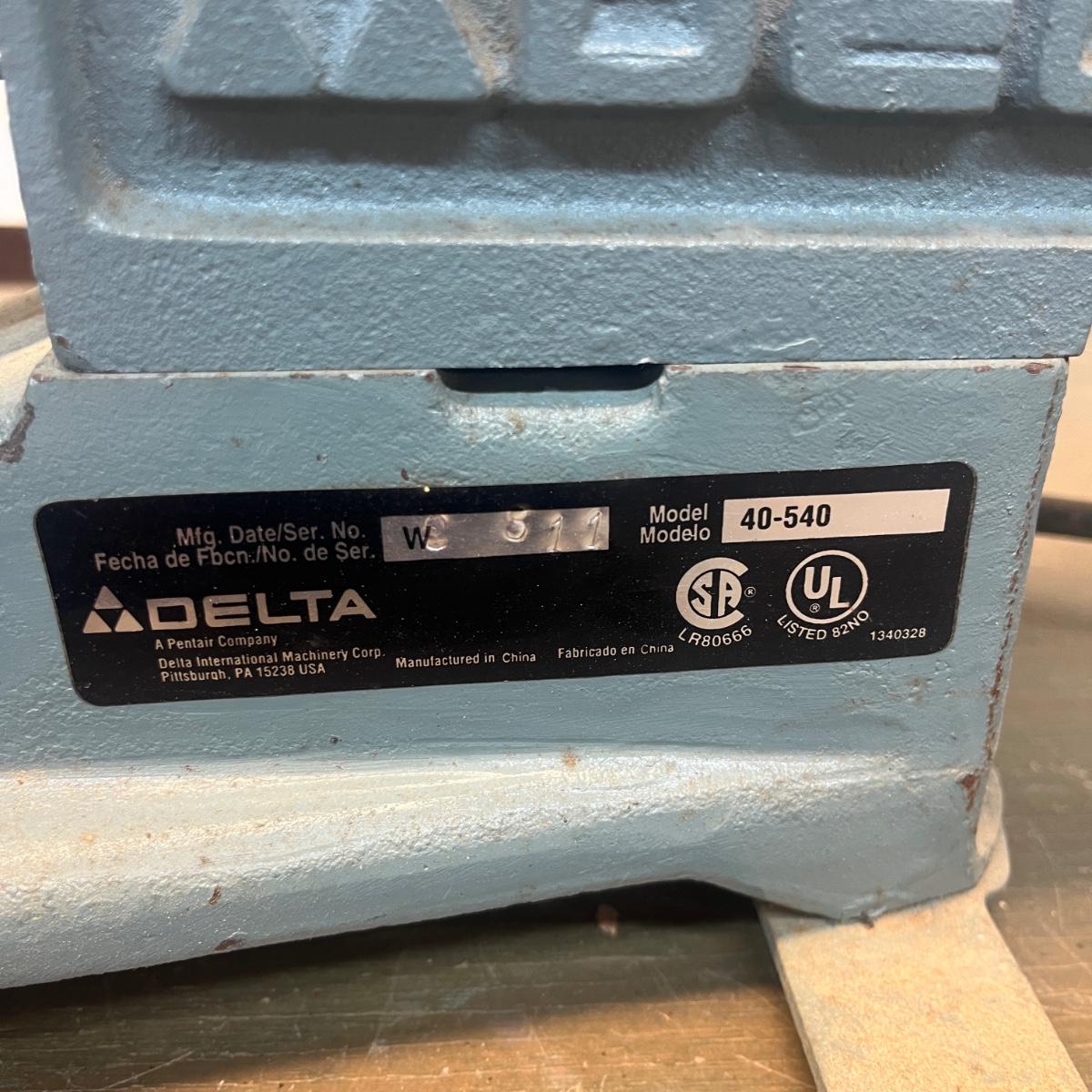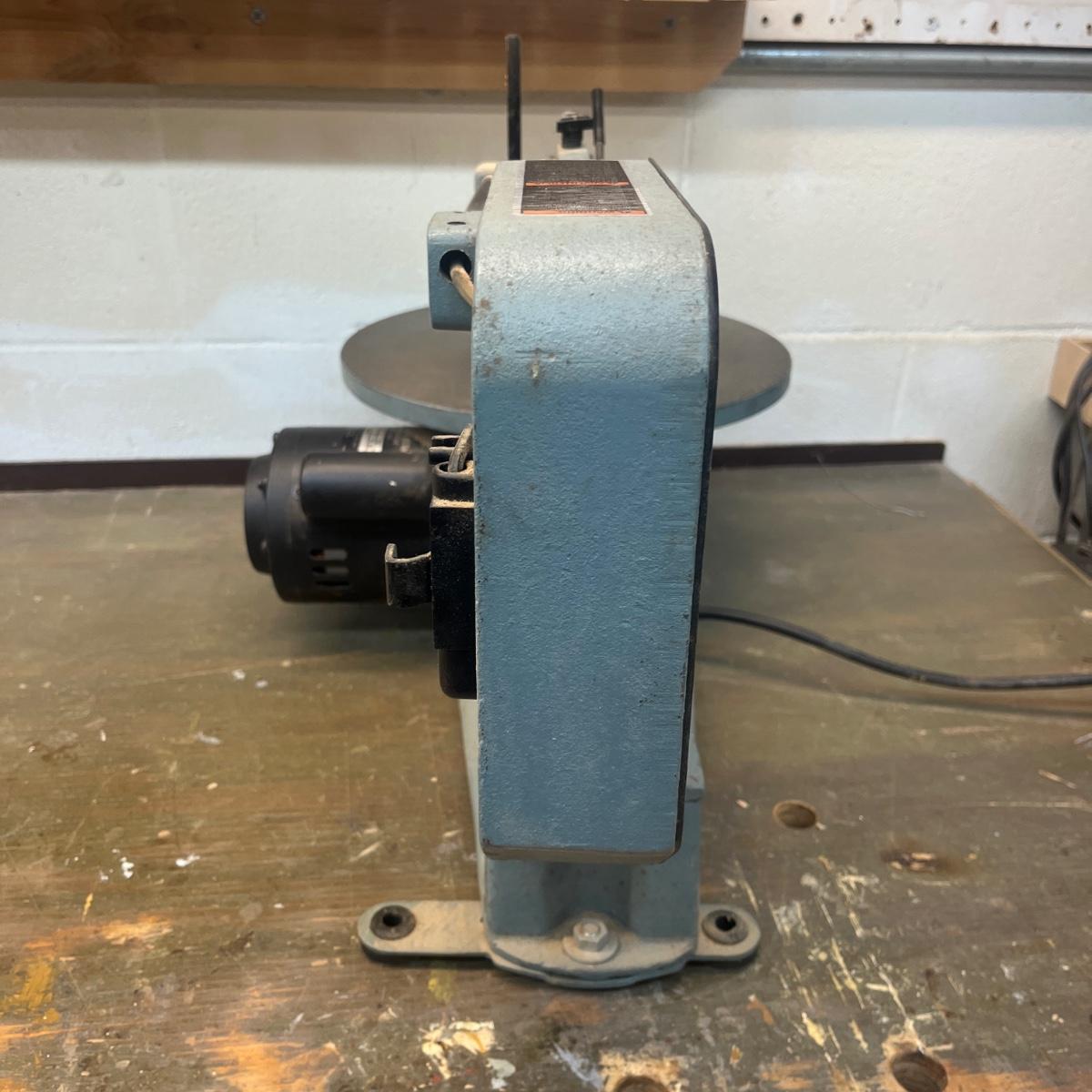 This Delta 16” variable speed scroll powered on when plugged in and measures 12” x 24” x 12”H. Also includes a small selection of blades.