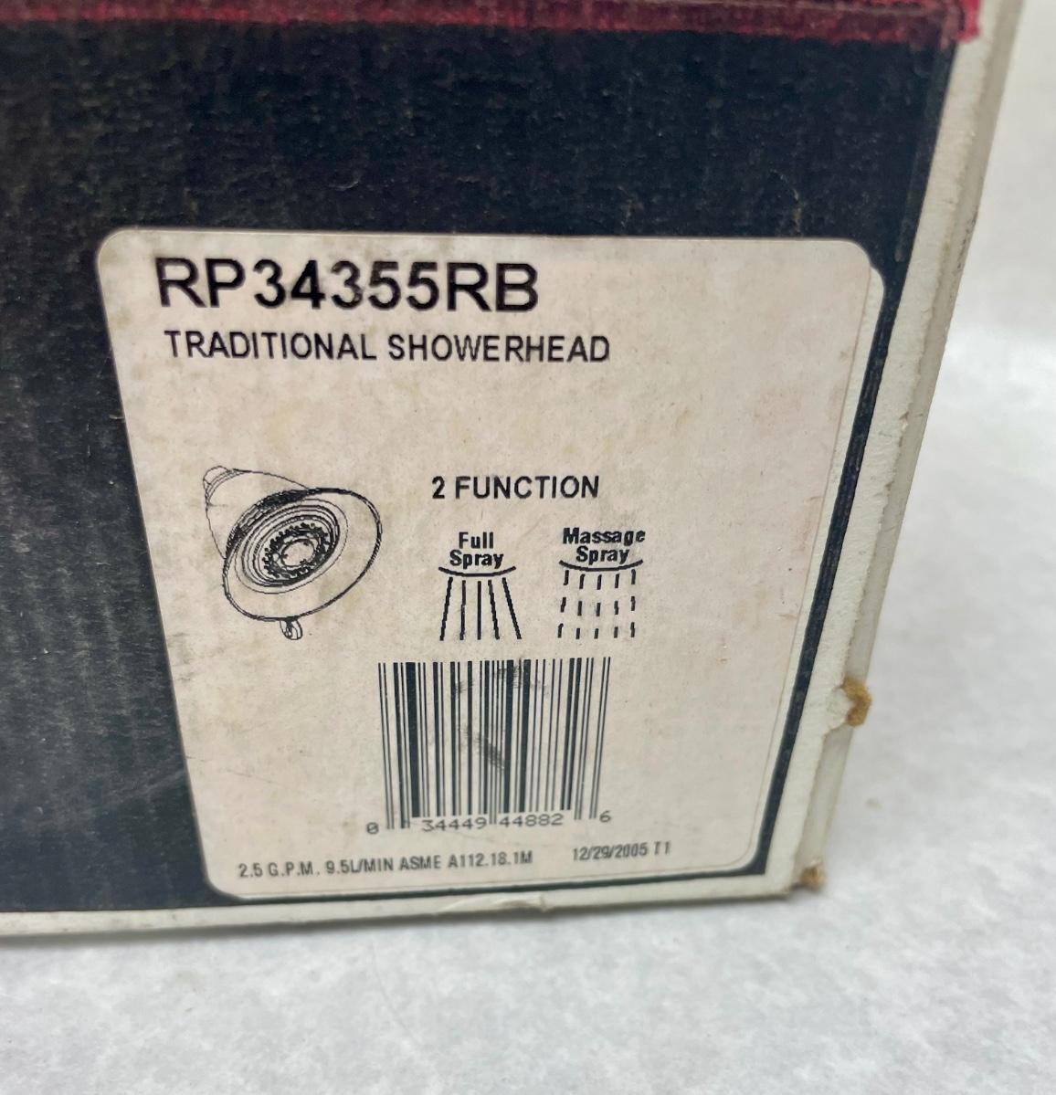 Model RP34355RB, Rubbed Bronze color. 2-function shower head: massage spray, and full spray. Inc lures installation instructions.