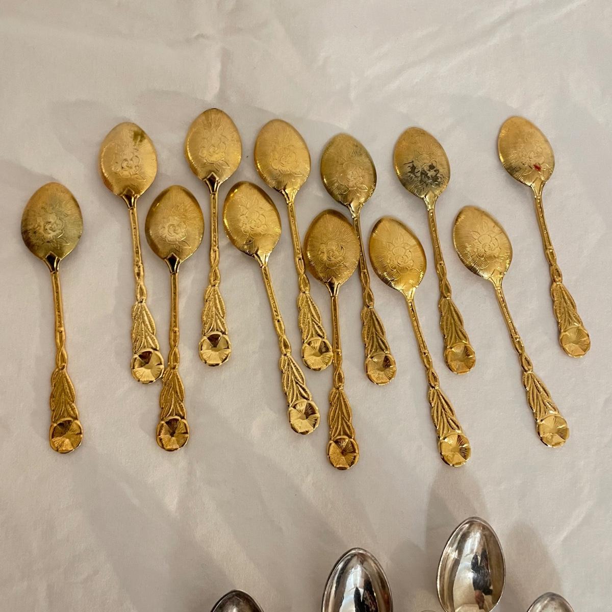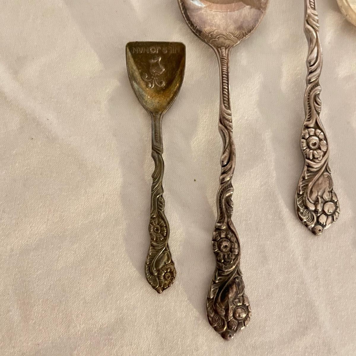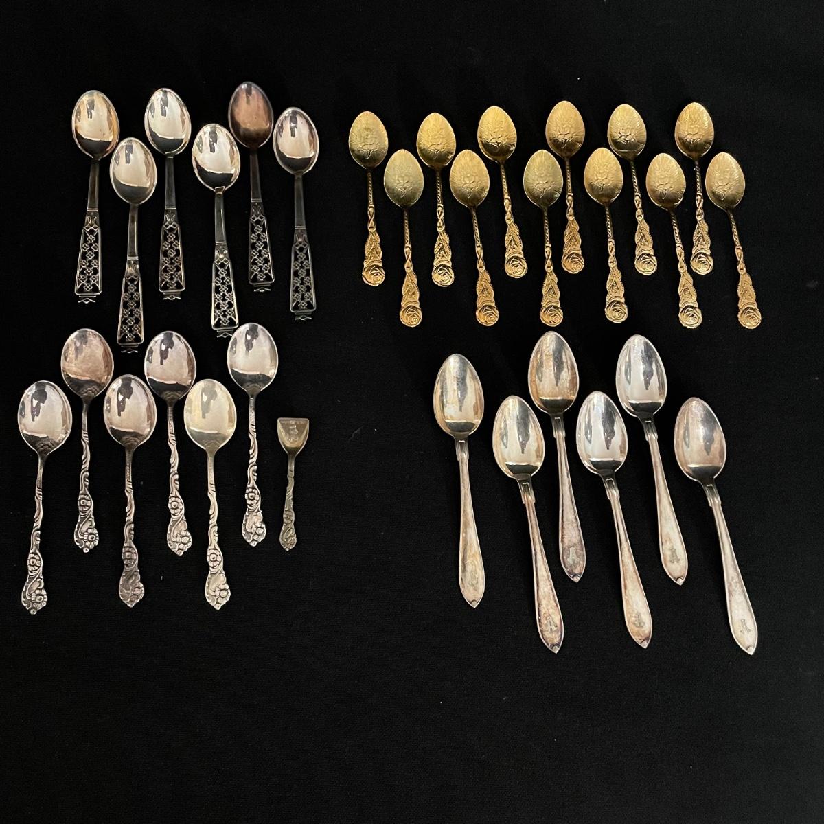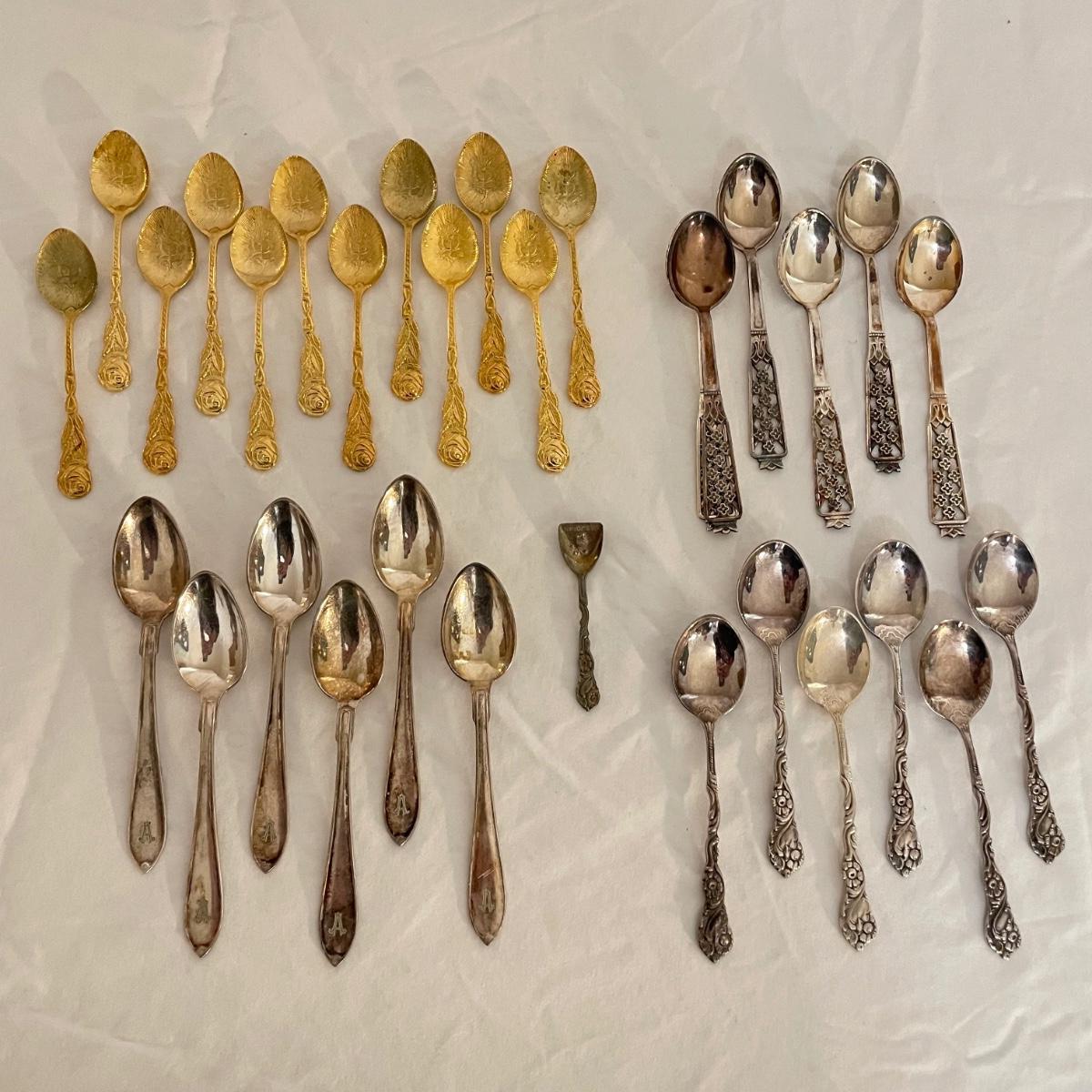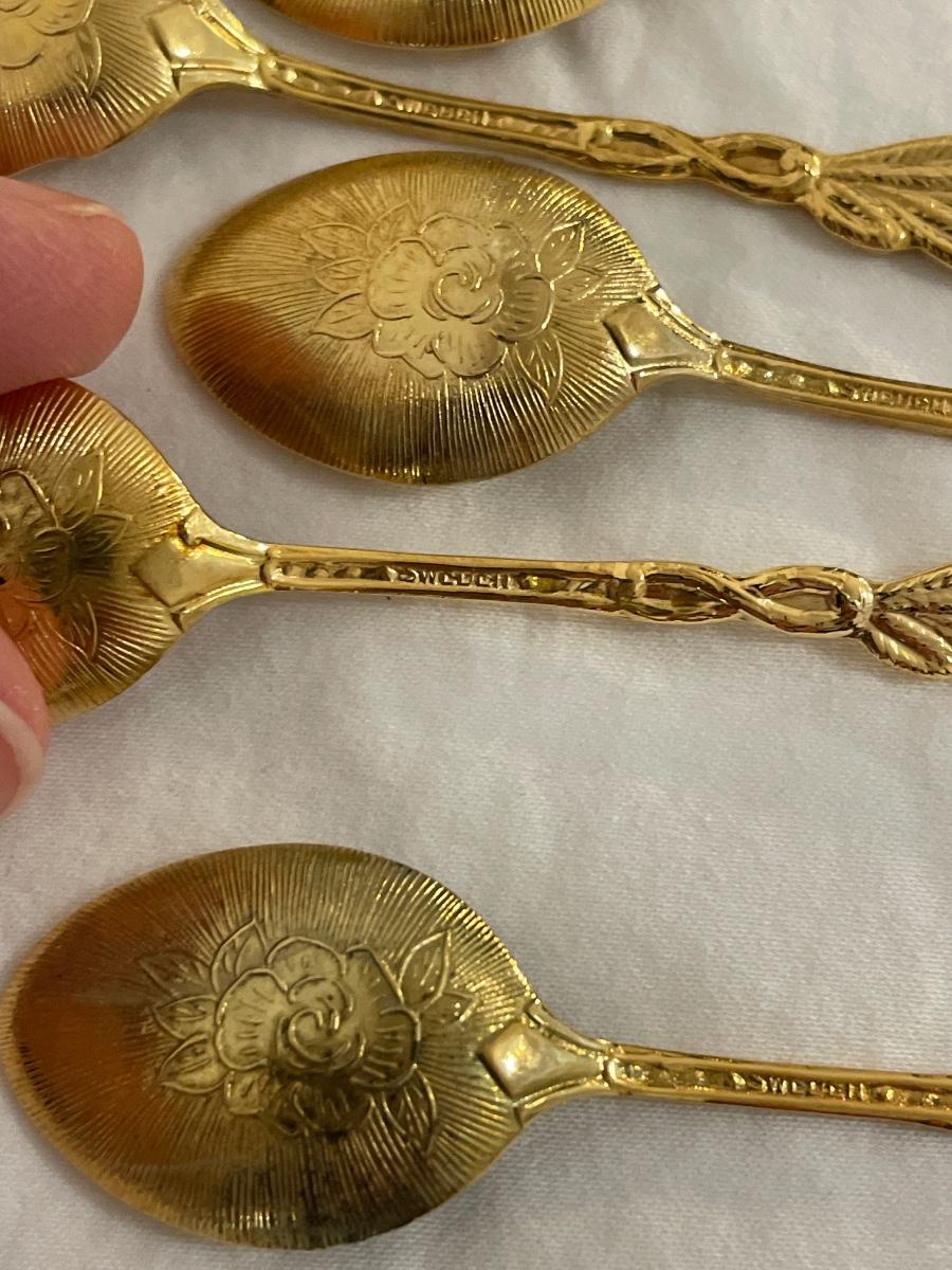 Four sets of old-world-style demitasse spoons each with their own unique markings. There is a tiny scoop by Nils Johan that matches five ornate floral spoons with different markings. A couple of the gold colored spoons show some patina or discoloration. The longest spoons are engraved with “A”, they are 4.25”. See images. Shipping available.