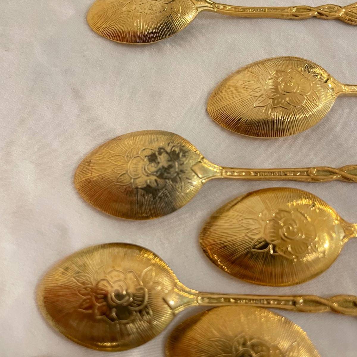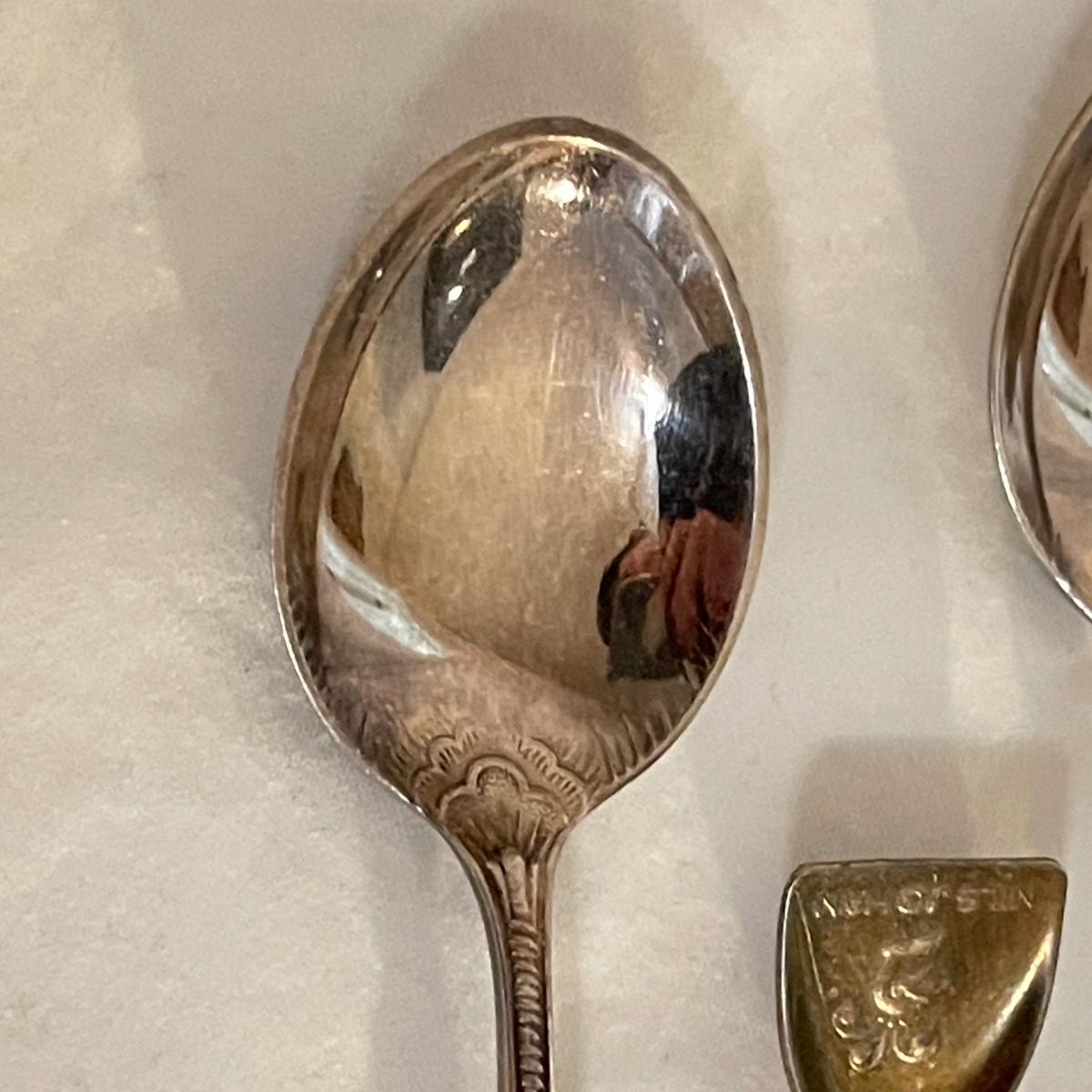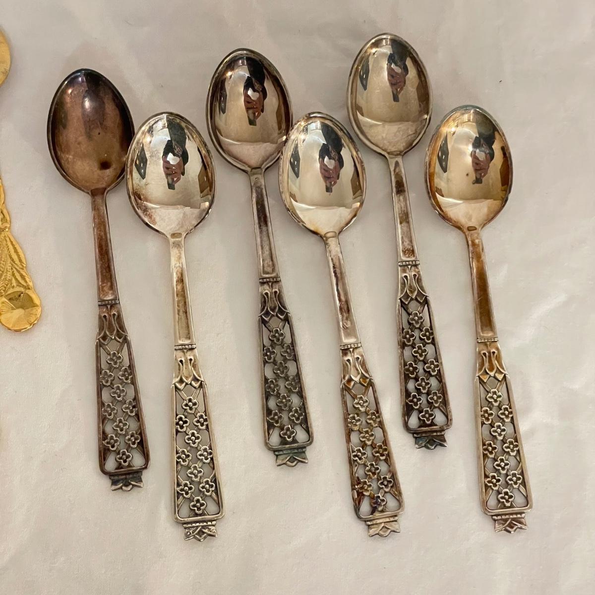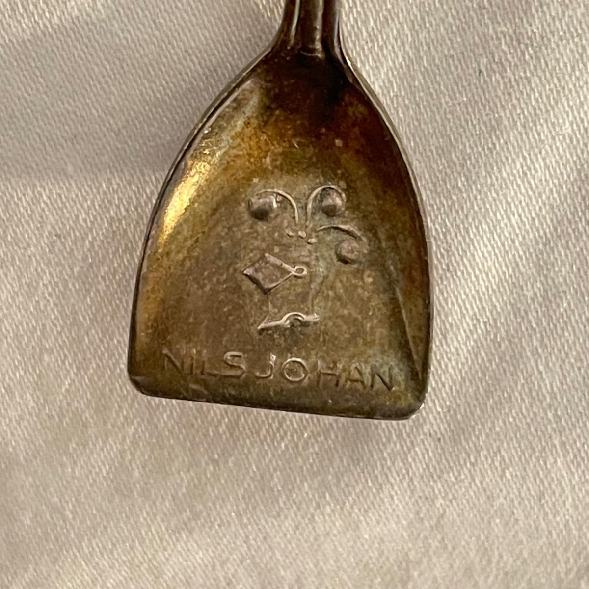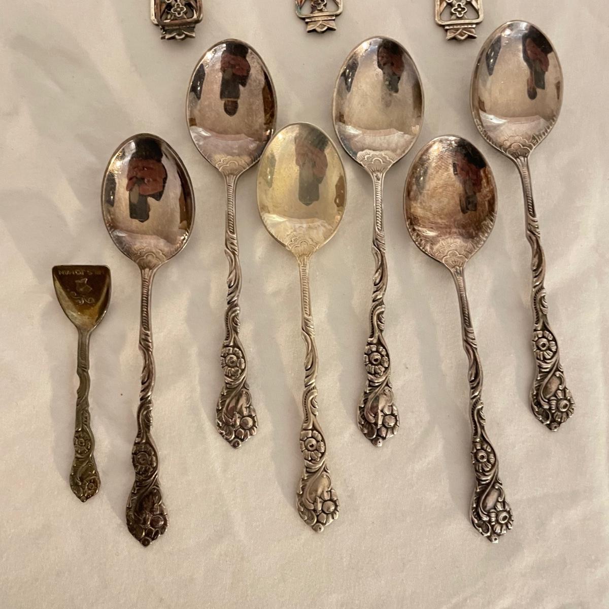 Four sets of old-world-style demitasse spoons each with their own unique markings. There is a tiny scoop by Nils Johan that matches five ornate floral spoons with different markings. A couple of the gold colored spoons show some patina or discoloration. The longest spoons are engraved with “A”, they are 4.25”. See images. Shipping available.