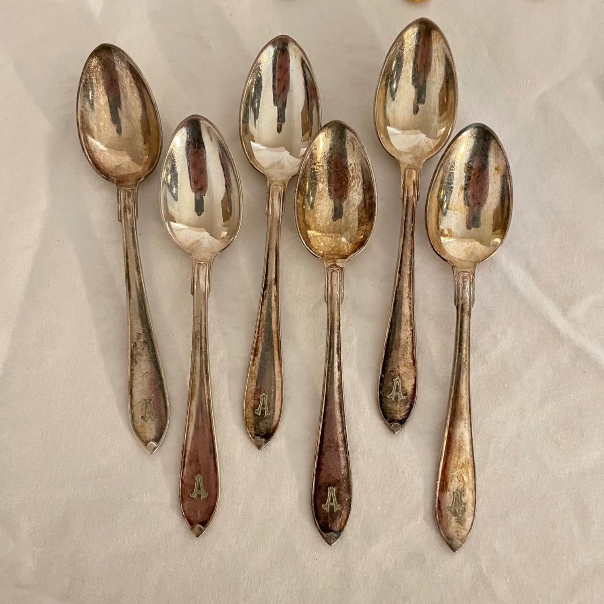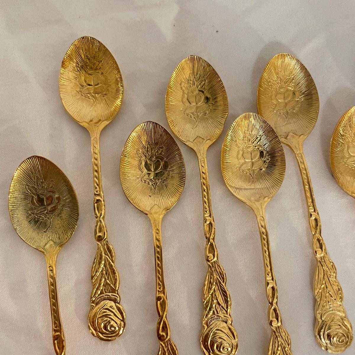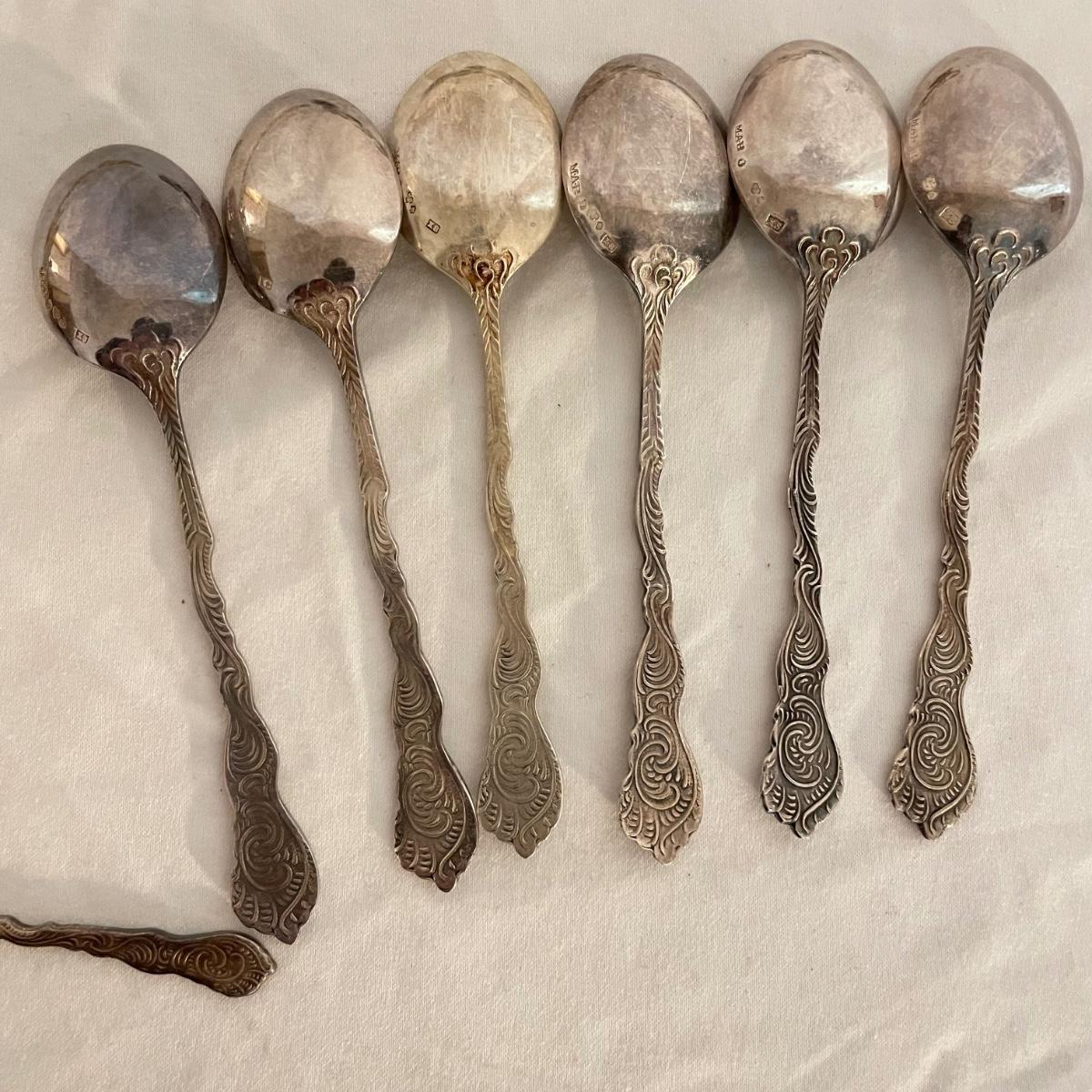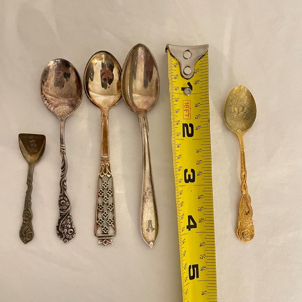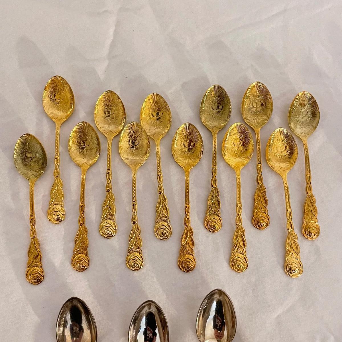 Four sets of old-world-style demitasse spoons each with their own unique markings. There is a tiny scoop by Nils Johan that matches five ornate floral spoons with different markings. A couple of the gold colored spoons show some patina or discoloration. The longest spoons are engraved with “A”, they are 4.25”. See images. Shipping available.