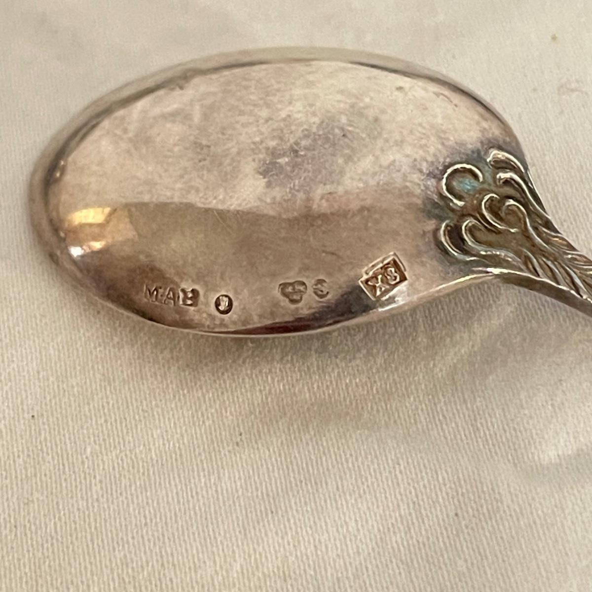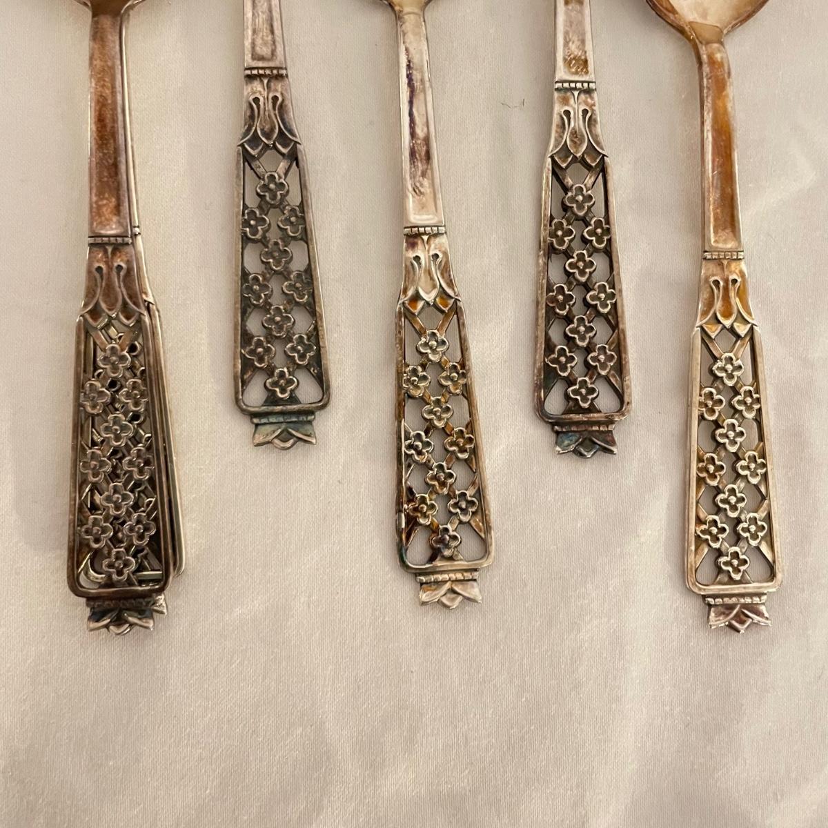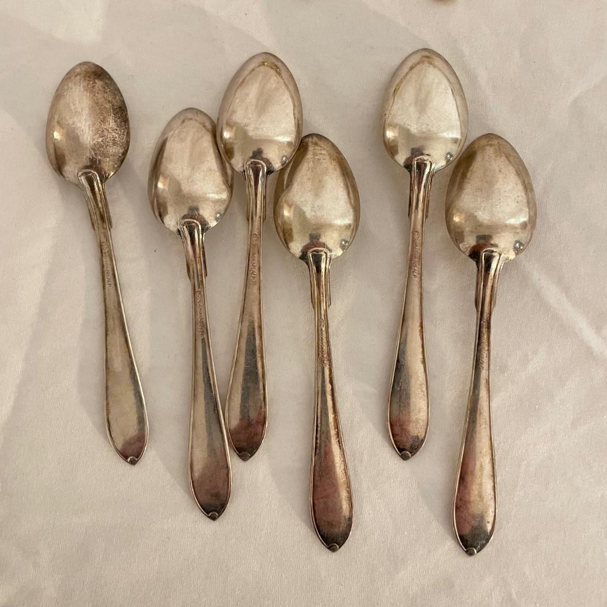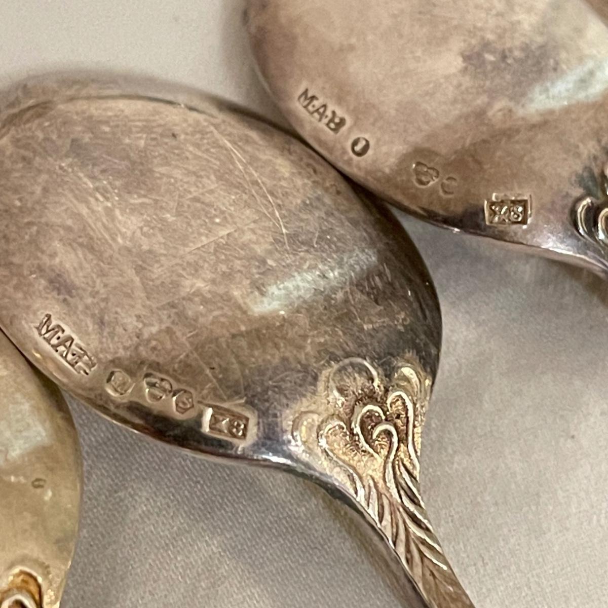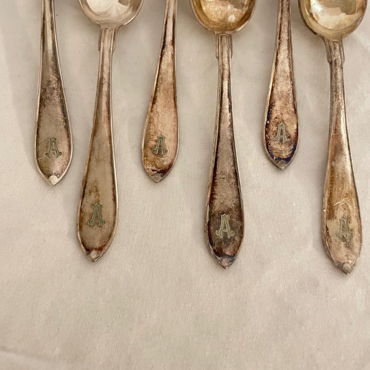 Four sets of old-world-style demitasse spoons each with their own unique markings. There is a tiny scoop by Nils Johan that matches five ornate floral spoons with different markings. A couple of the gold colored spoons show some patina or discoloration. The longest spoons are engraved with “A”, they are 4.25”. See images. Shipping available.