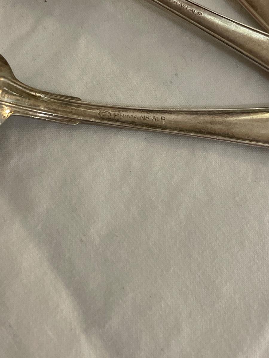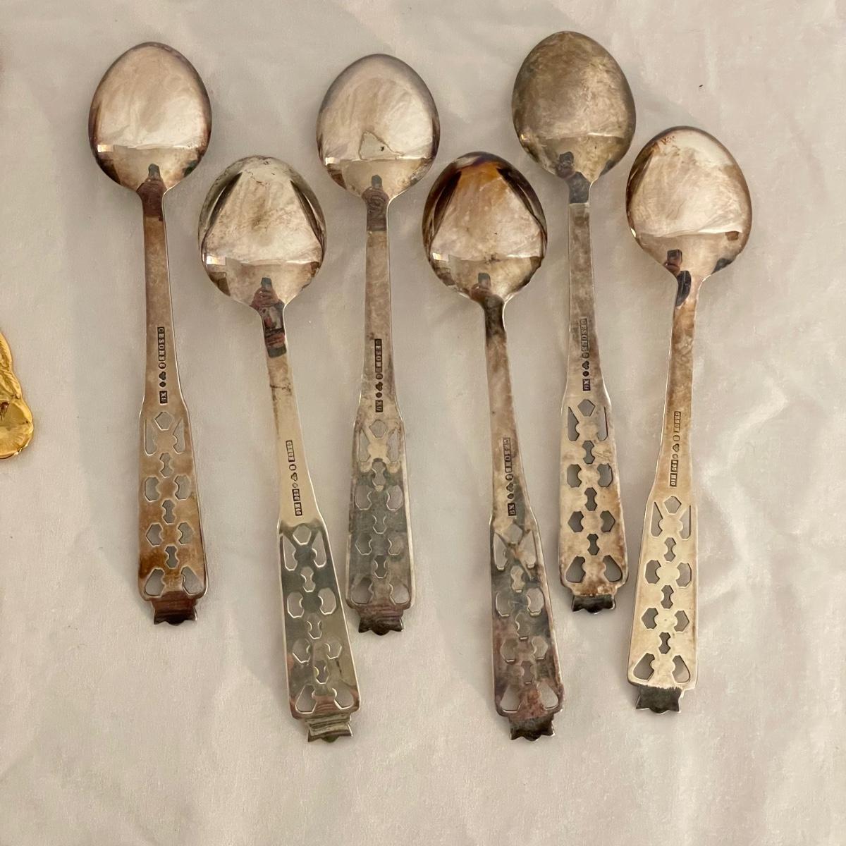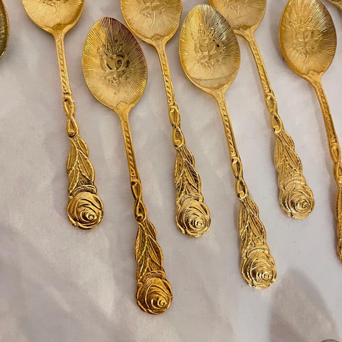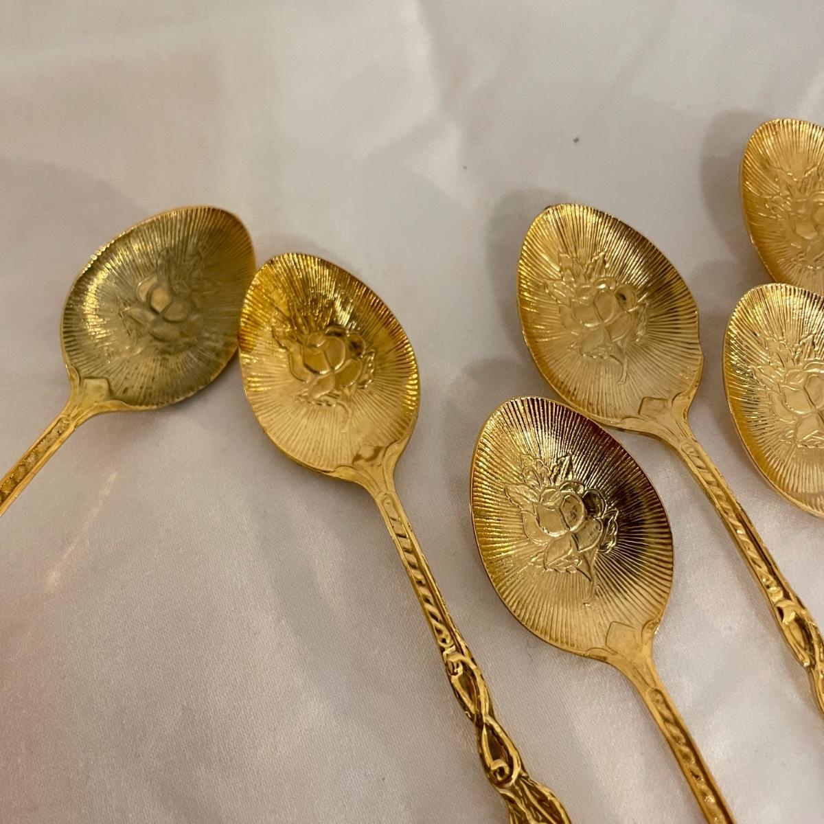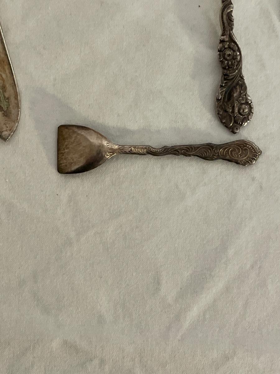 Four sets of old-world-style demitasse spoons each with their own unique markings. There is a tiny scoop by Nils Johan that matches five ornate floral spoons with different markings. A couple of the gold colored spoons show some patina or discoloration. The longest spoons are engraved with “A”, they are 4.25”. See images. Shipping available.
