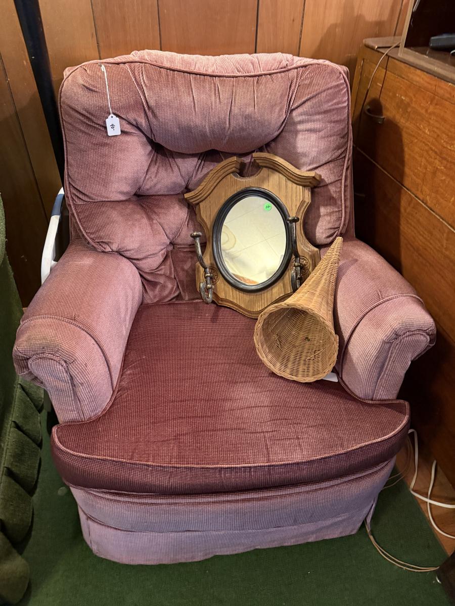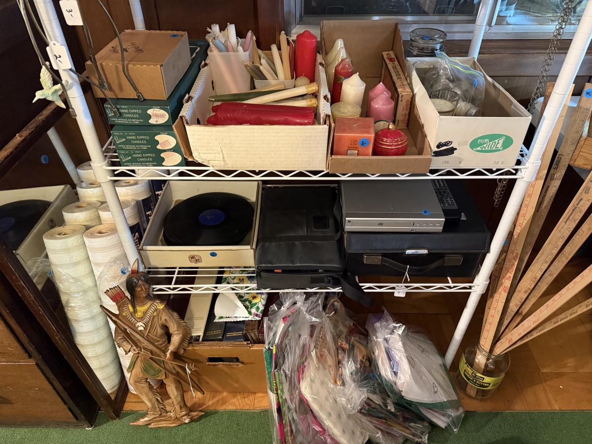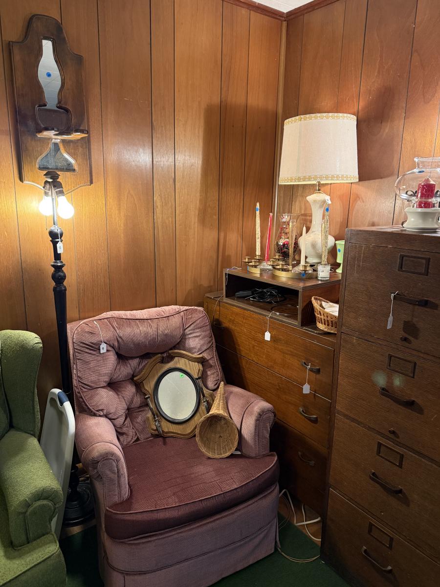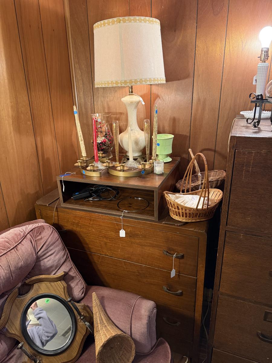 Upholstered chair, lamps, candles, wood file cabinet, metal cabinet, ephemera, dishes, vases, decor, wall paper, ribbon, baskets, mirror, railroad memorabilia, local advertising items, metal art, records, 8Track, cassettes, etc