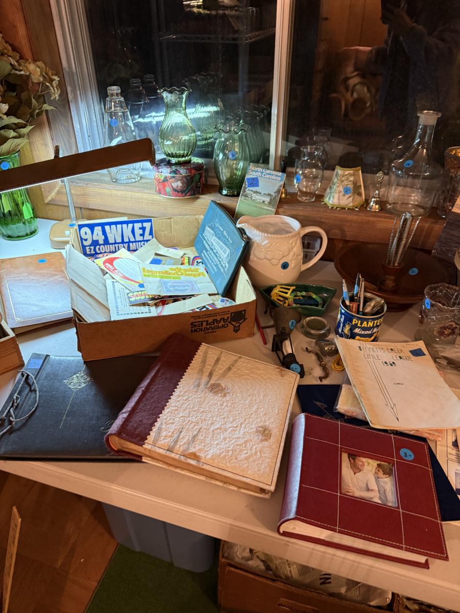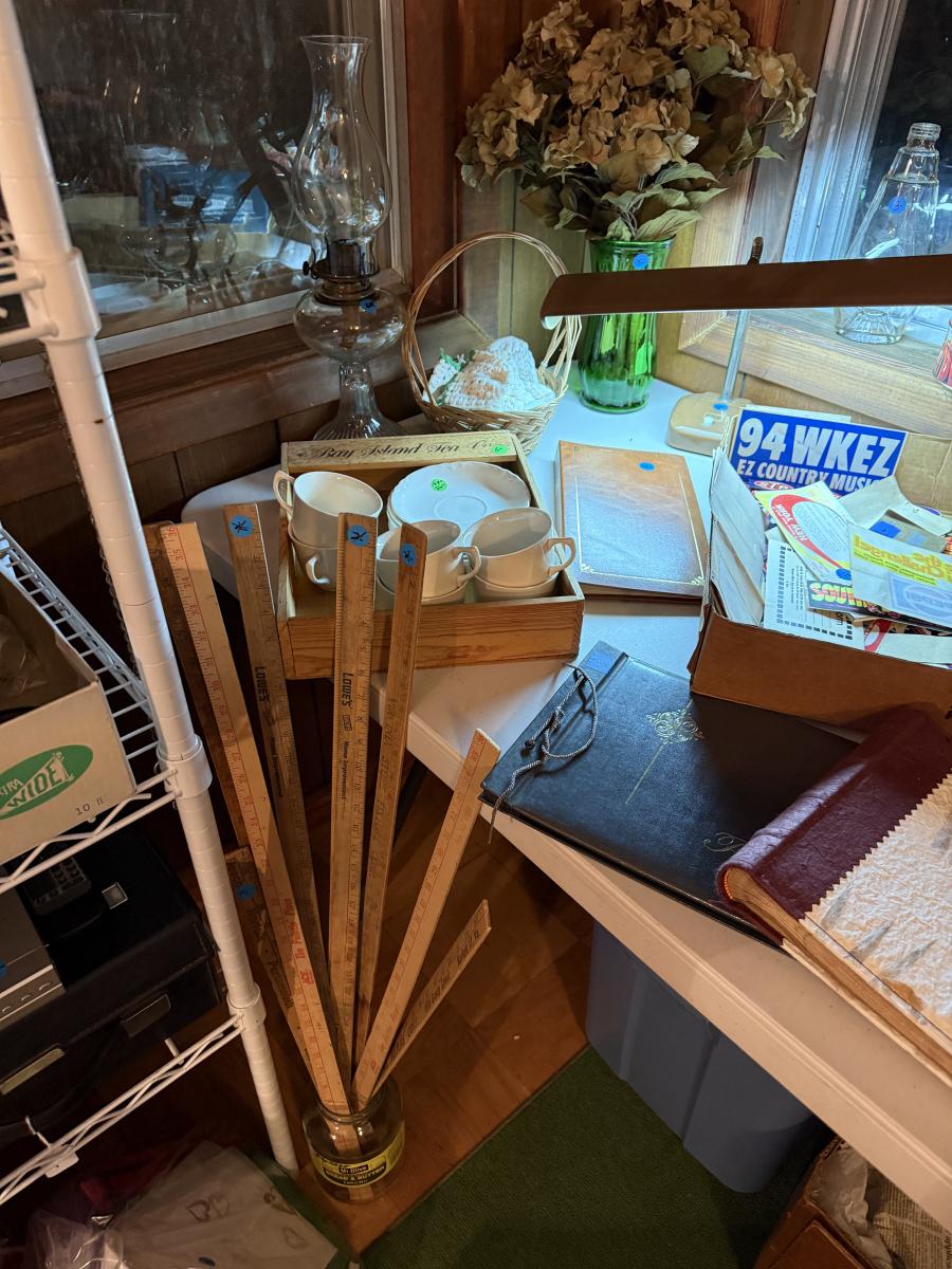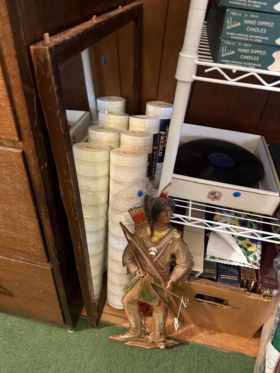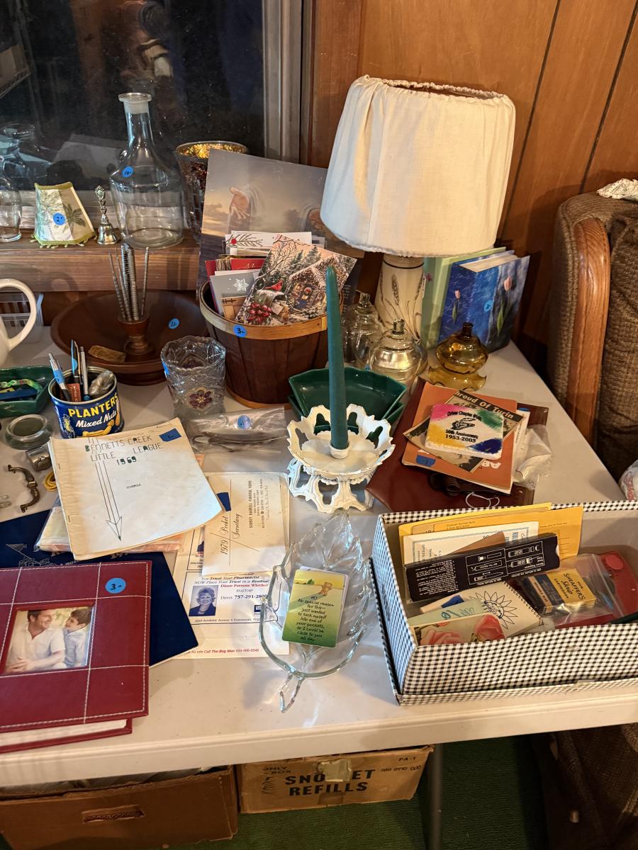 Upholstered chair, lamps, candles, wood file cabinet, metal cabinet, ephemera, dishes, vases, decor, wall paper, ribbon, baskets, mirror, railroad memorabilia, local advertising items, metal art, records, 8Track, cassettes, etc