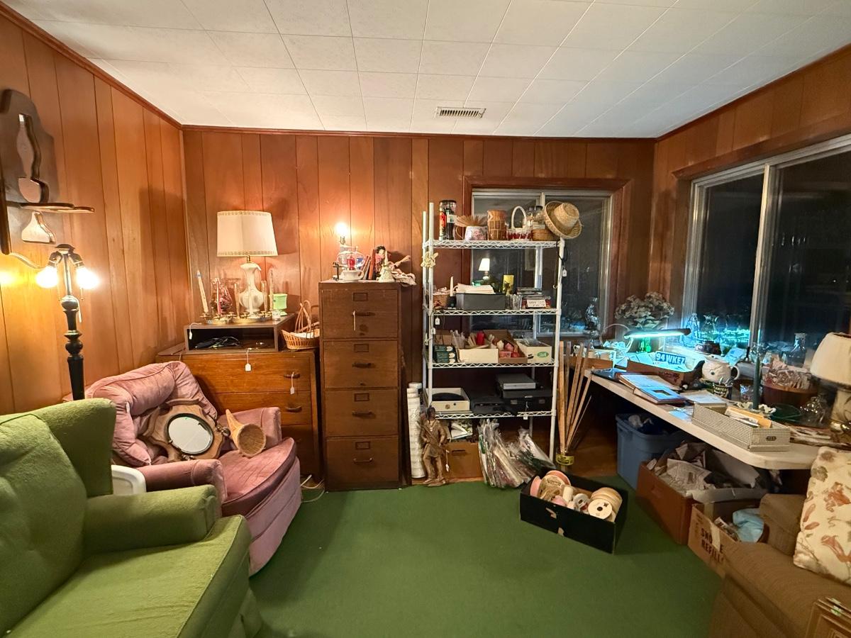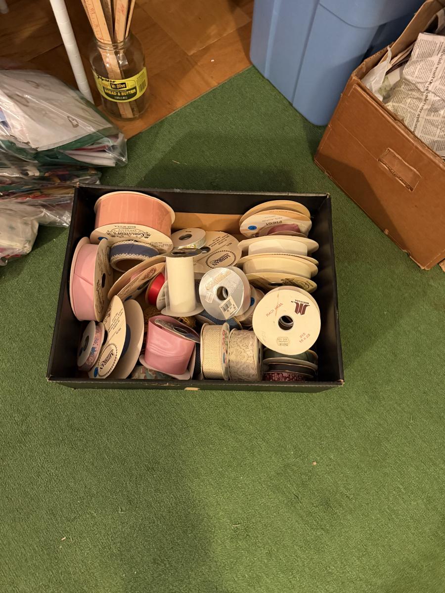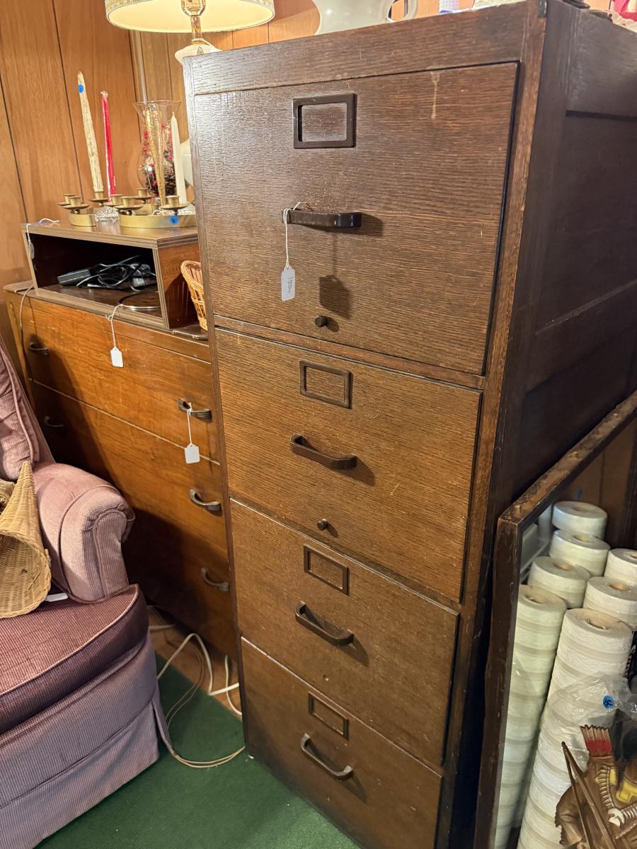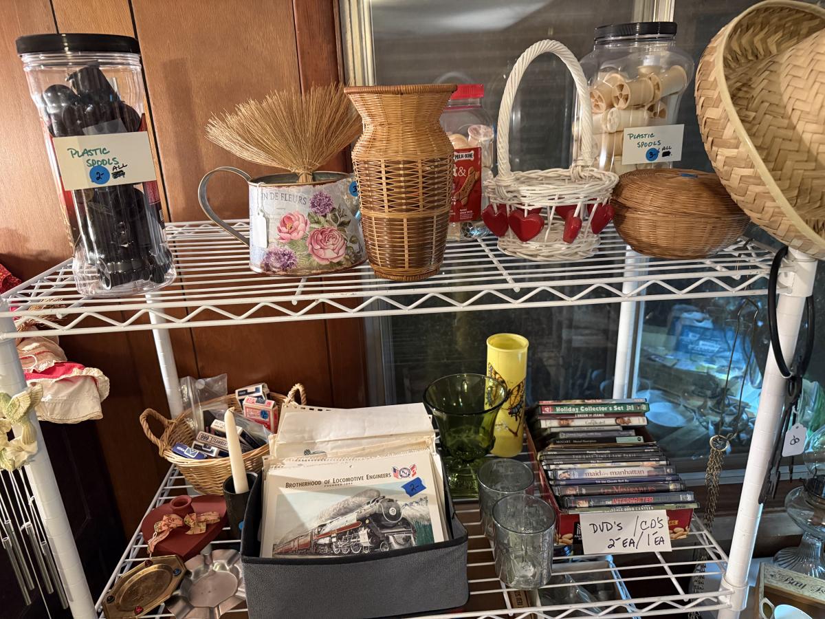 Upholstered chair, lamps, candles, wood file cabinet, metal cabinet, ephemera, dishes, vases, decor, wall paper, ribbon, baskets, mirror, railroad memorabilia, local advertising items, metal art, records, 8Track, cassettes, etc