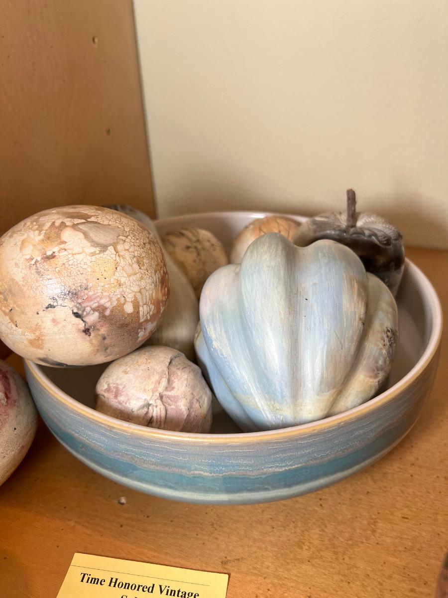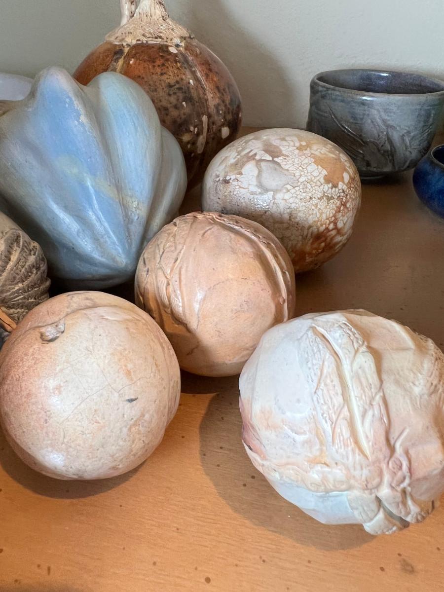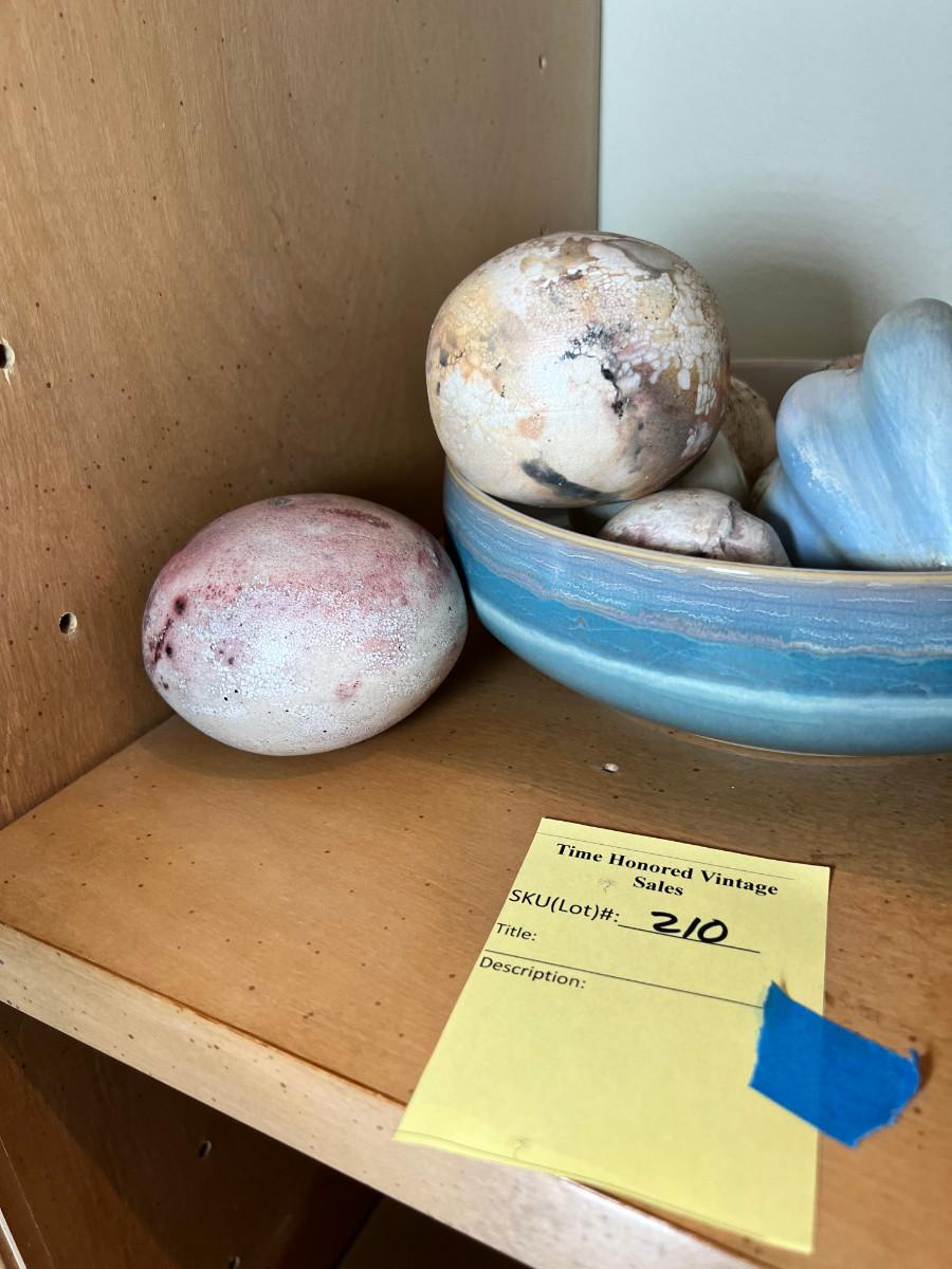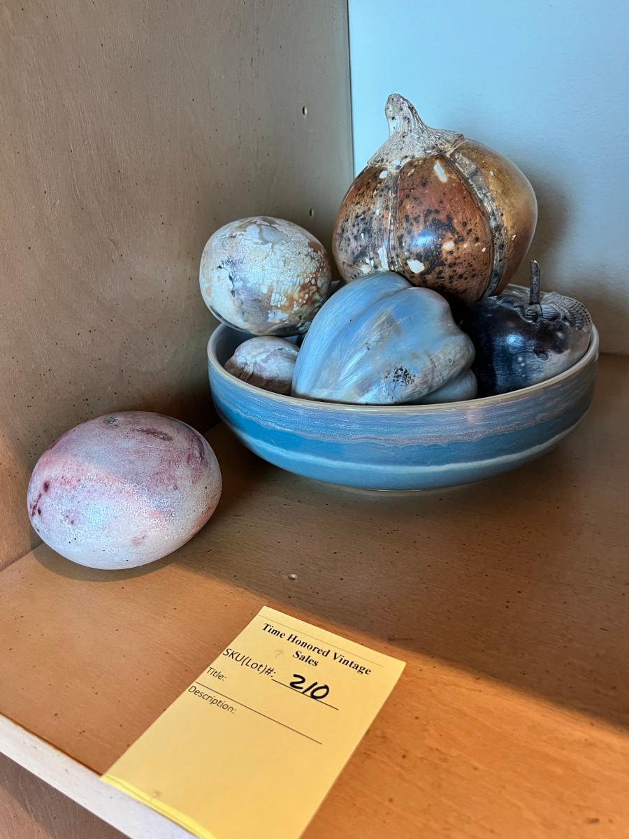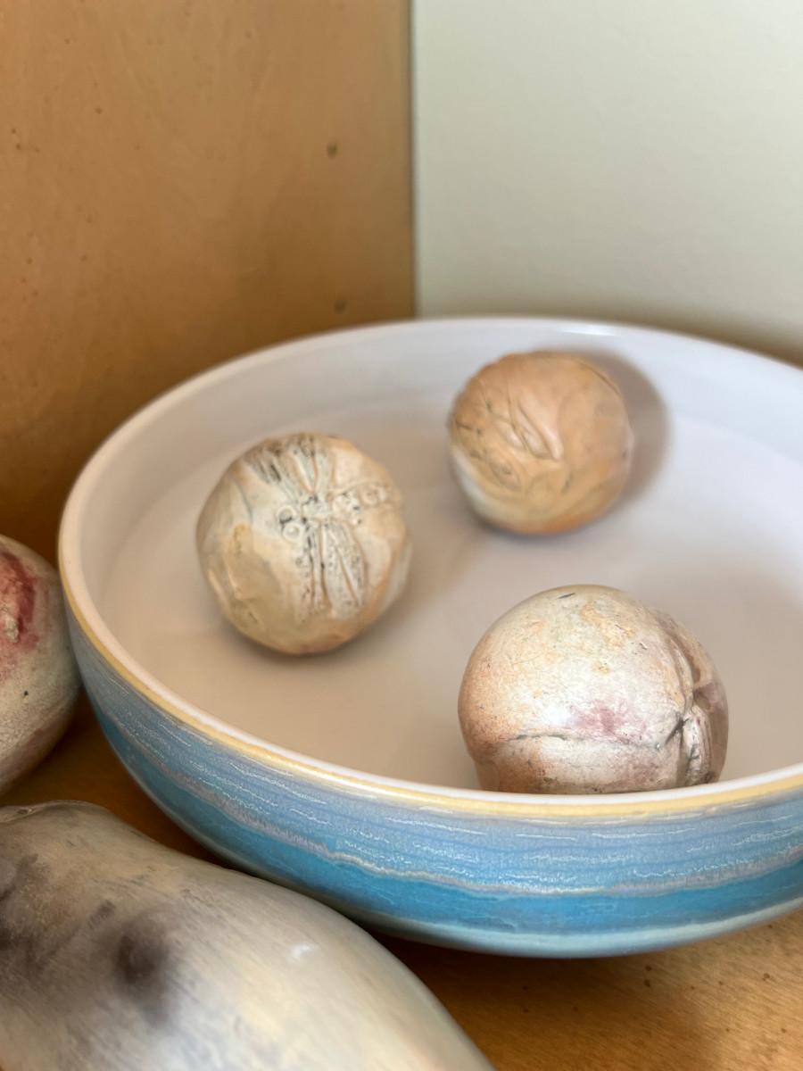These unsigned ceramic items were hand made with a special technique which allowed the artisan to fire them almost completely enclosed. Each has some ceramic beads that shake inside. Without this special technique sealed clay will explode in the kiln. The Denby bowl they are in is a beautiful blue glaze color outside and white inside. Unfortunately, these fantastic pieces of ceramic art are unsigned., it is assumed they were purchased directly from the artist at a craft fair. Reserve