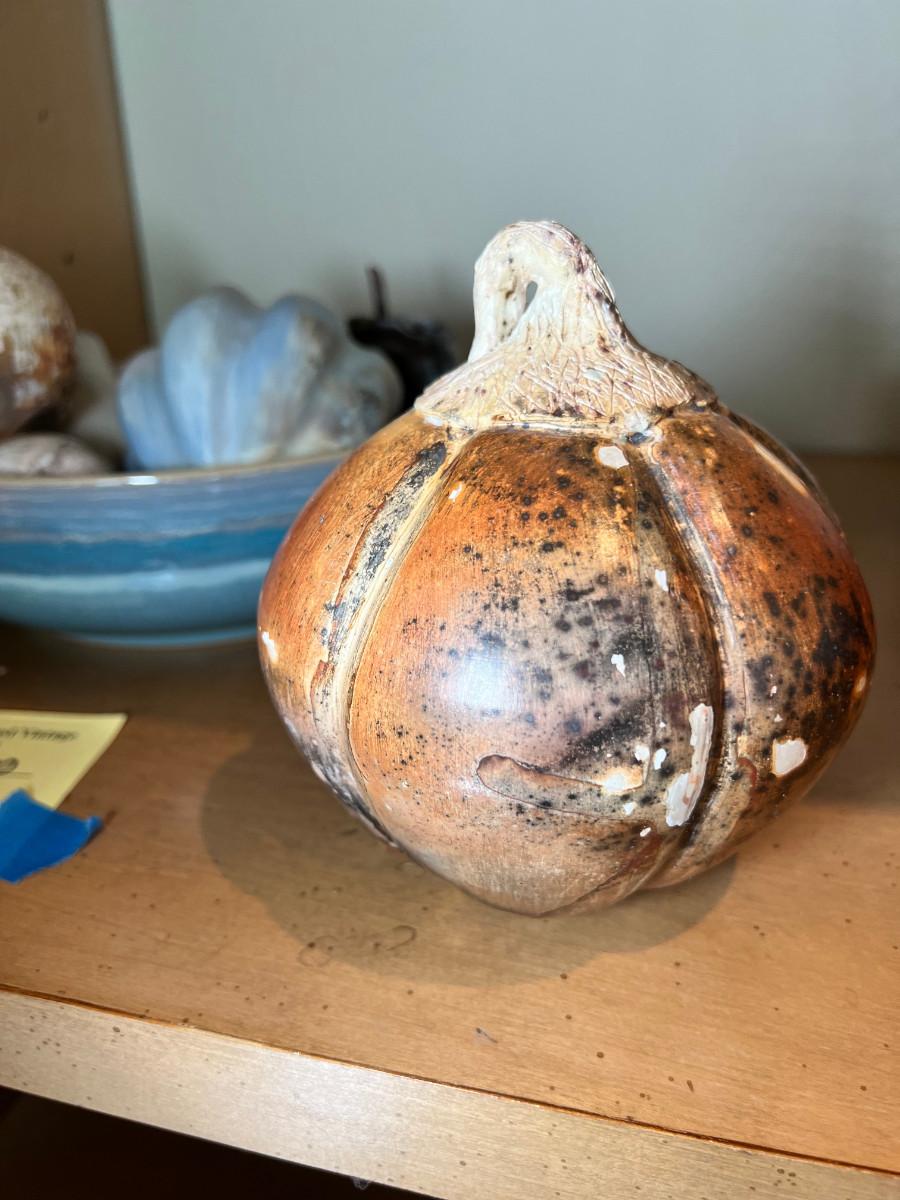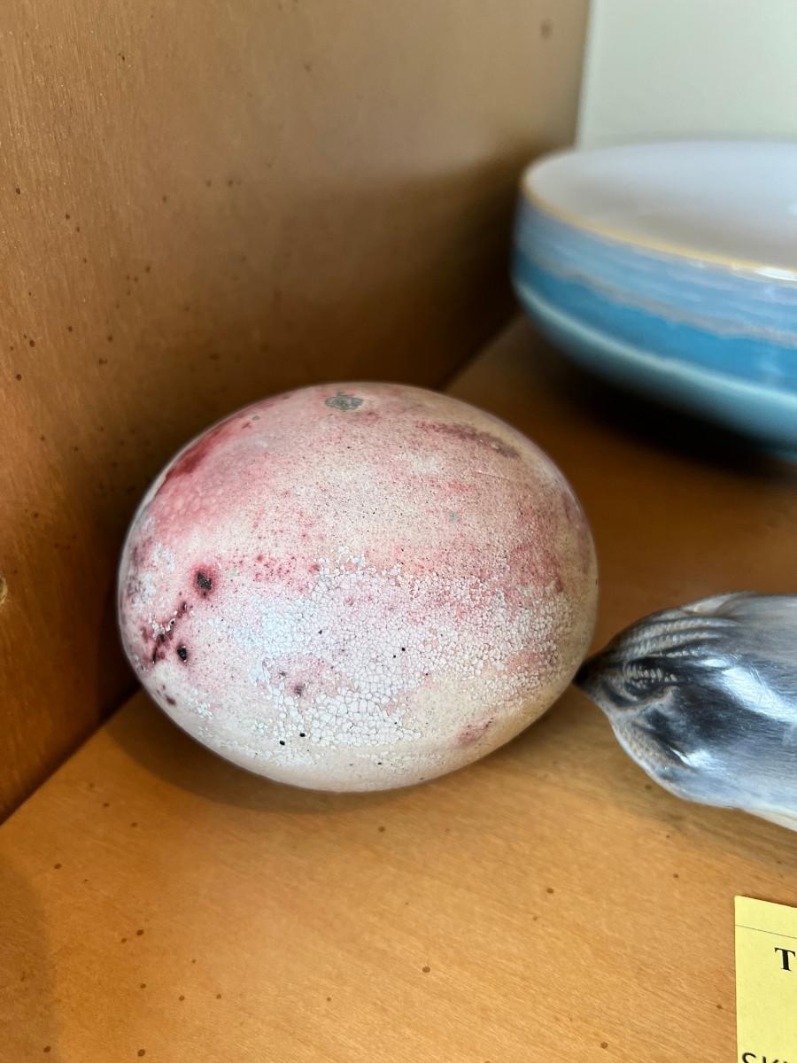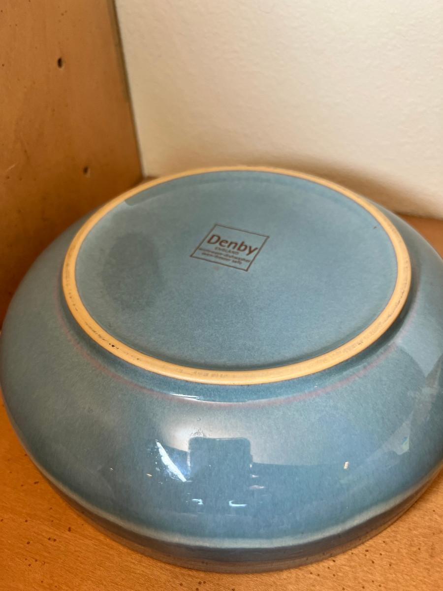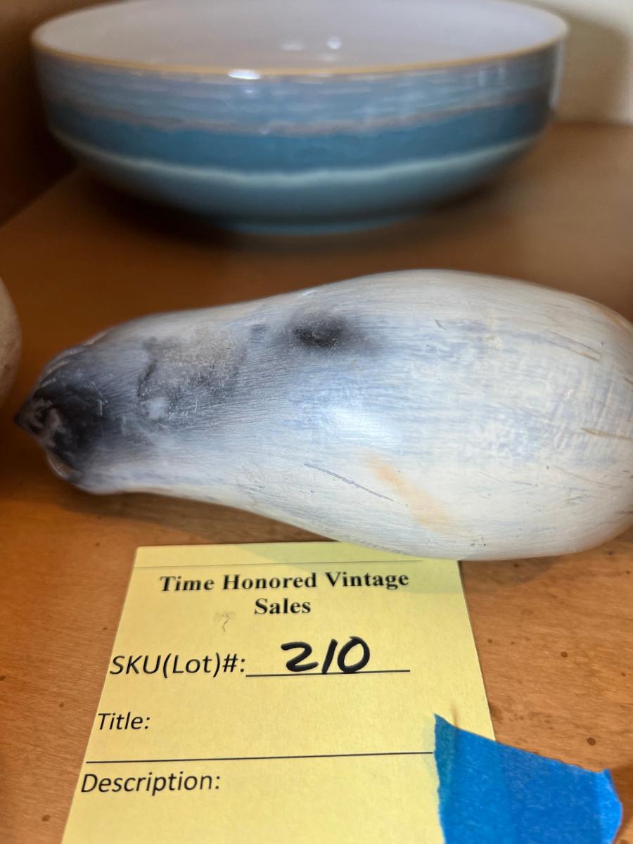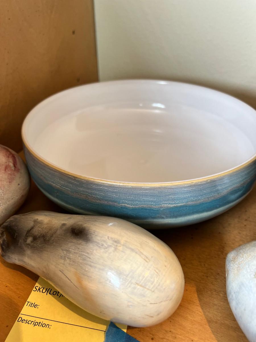 These unsigned ceramic items were hand made with a special technique which allowed the artisan to fire them almost completely enclosed. Each has some ceramic beads that shake inside. Without this special technique sealed clay will explode in the kiln. The Denby bowl they are in is a beautiful blue glaze color outside and white inside. Unfortunately, these fantastic pieces of ceramic art are unsigned., it is assumed they were purchased directly from the artist at a craft fair. Reserve