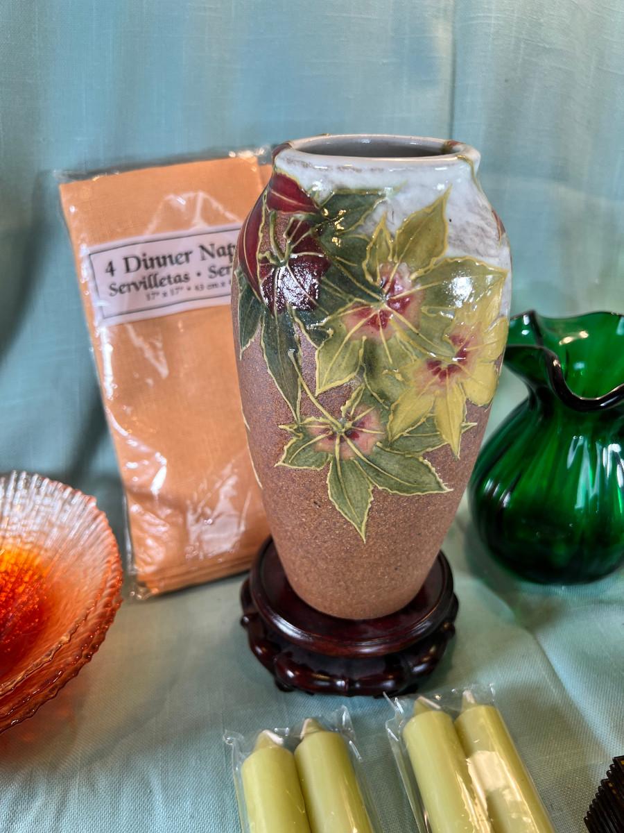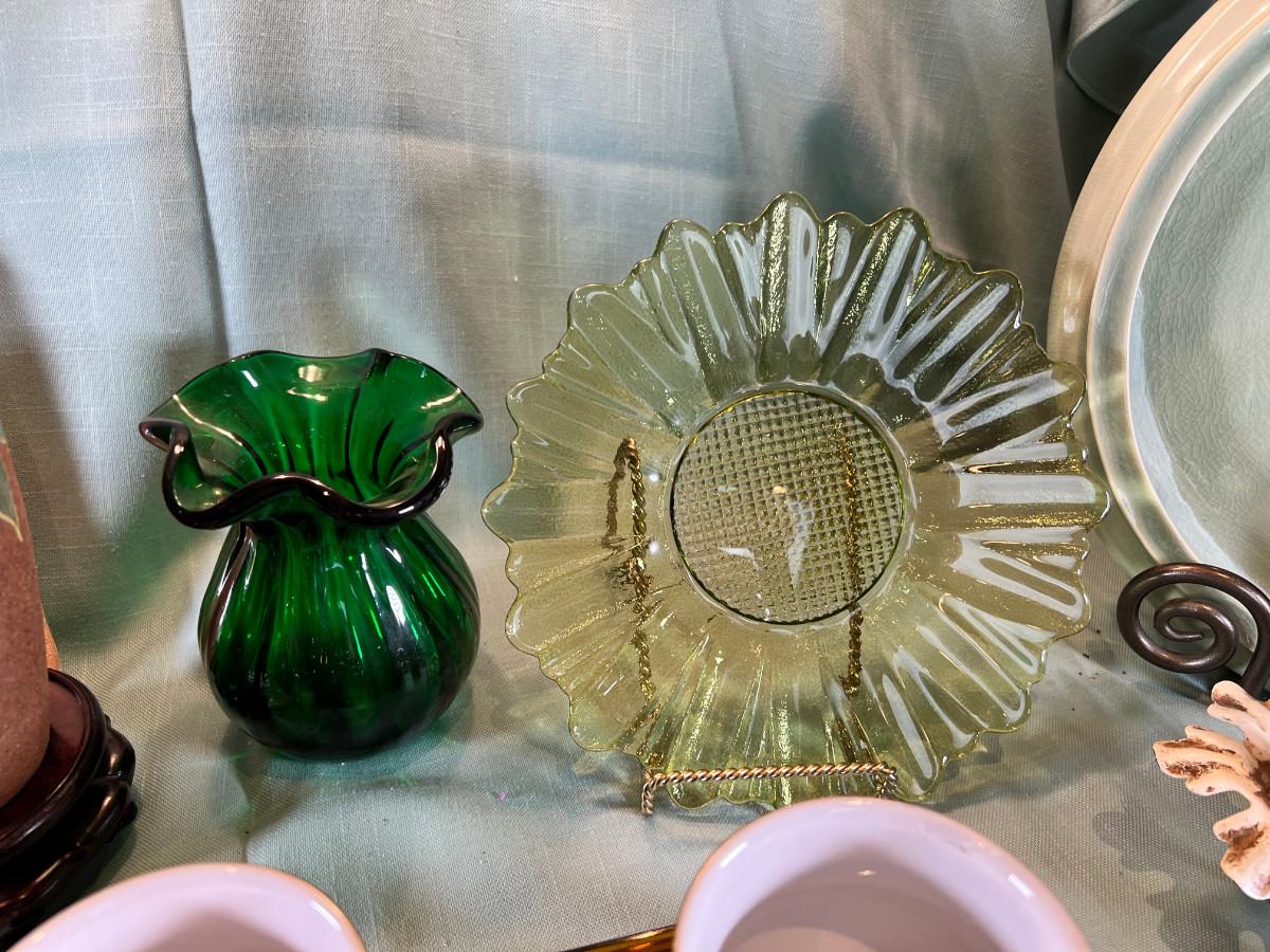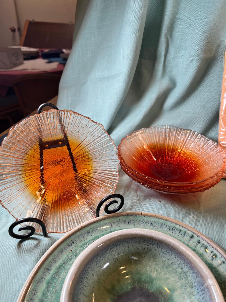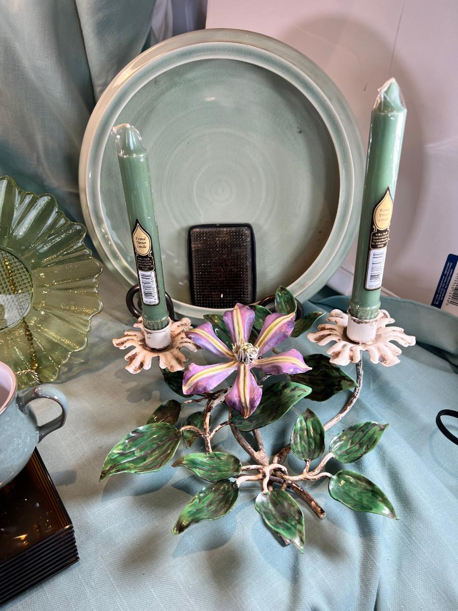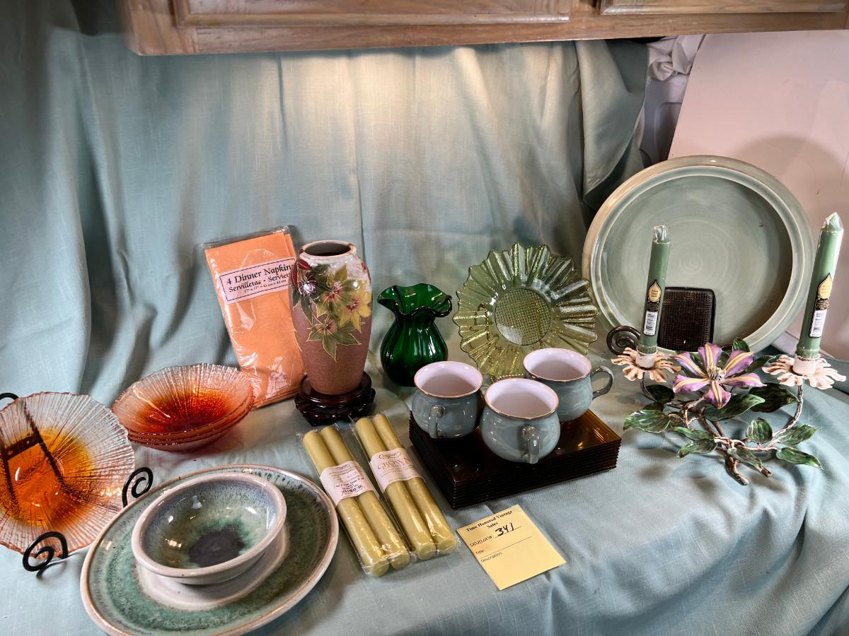 Denby Cups, Large Green ceramic bowl and large rectangular floral holder. Metal Italian floral candle holders, new candles, handmade stoneware vase and stand, Hand made crystalline dip bowl, Vintage orange glass bowls, Set of Vintage Lucite Amber rectangle plates,