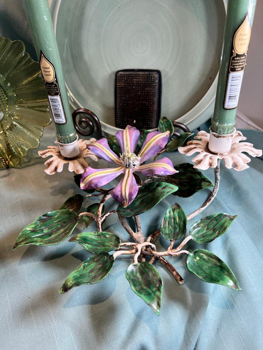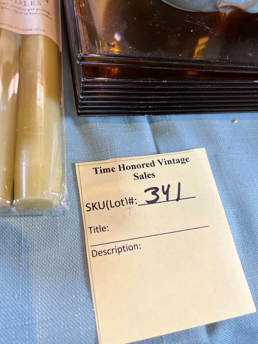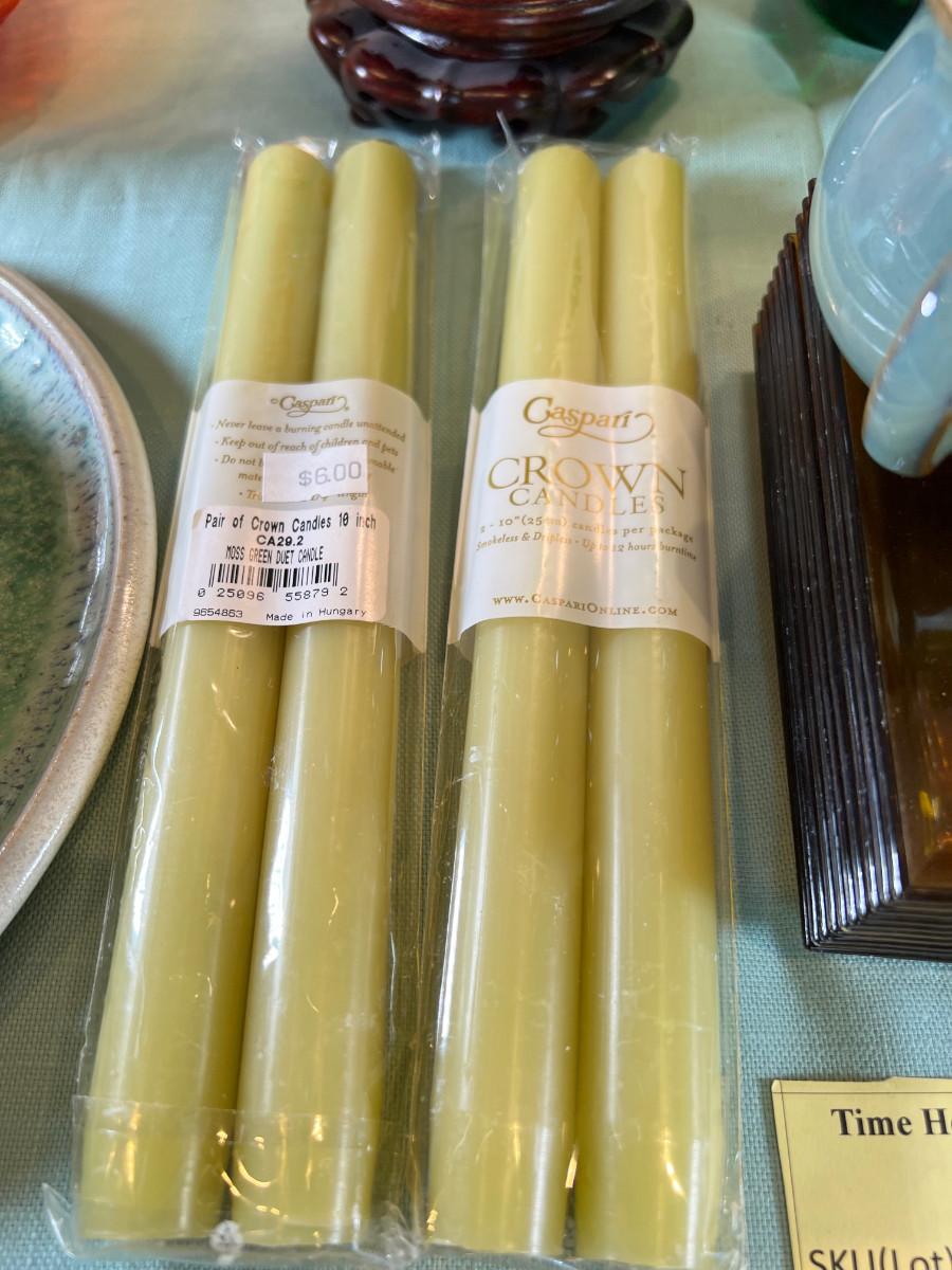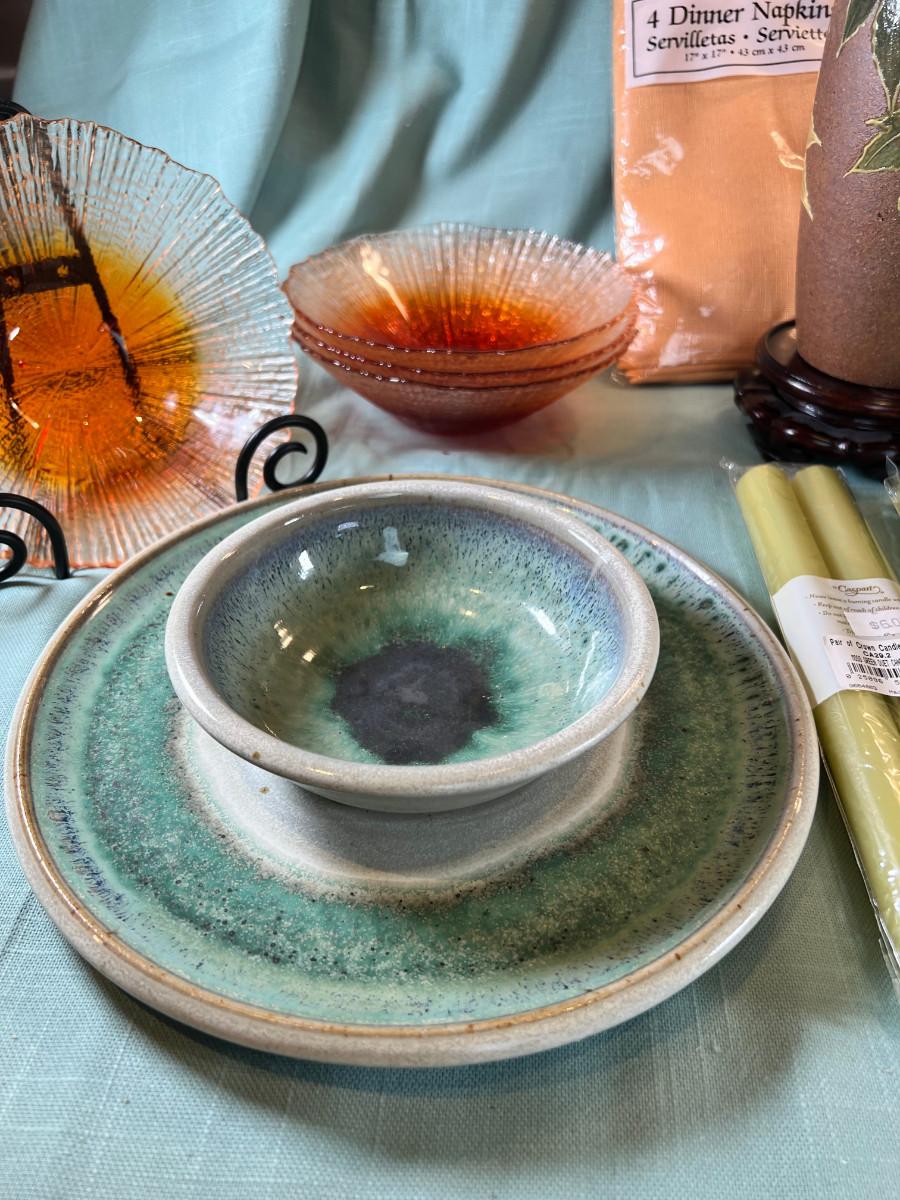 Denby Cups, Large Green ceramic bowl and large rectangular floral holder. Metal Italian floral candle holders, new candles, handmade stoneware vase and stand, Hand made crystalline dip bowl, Vintage orange glass bowls, Set of Vintage Lucite Amber rectangle plates,