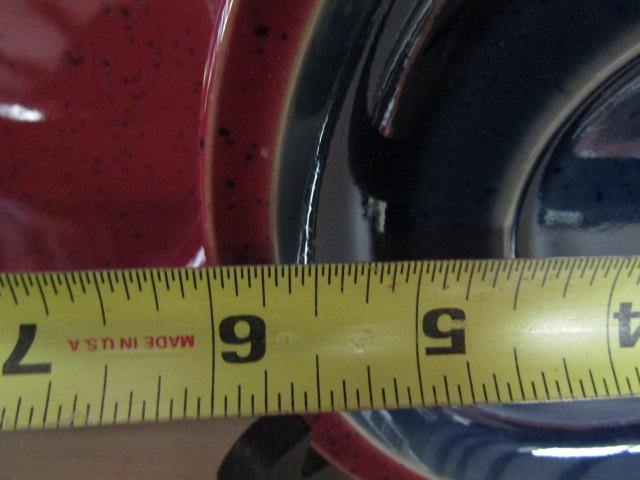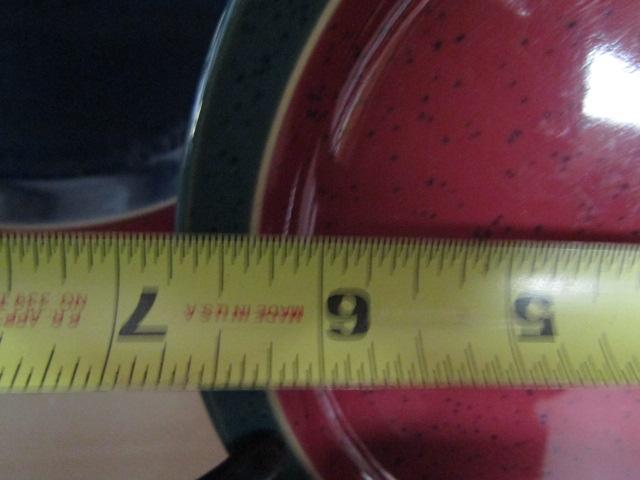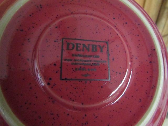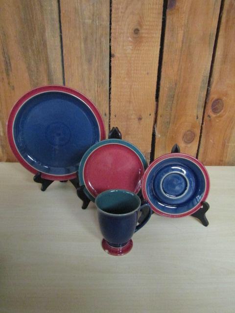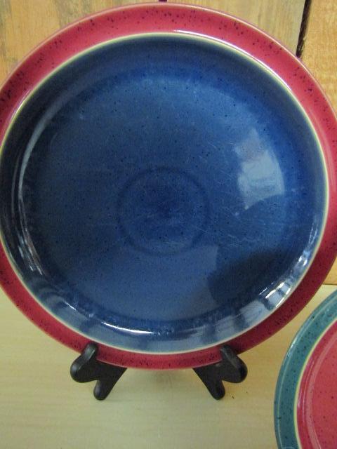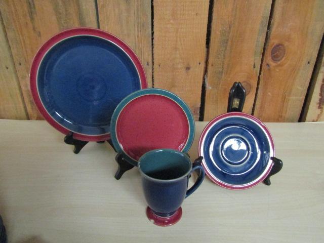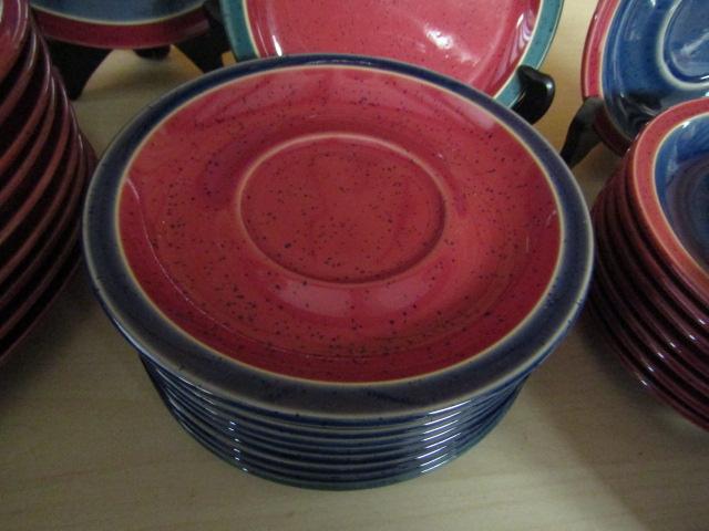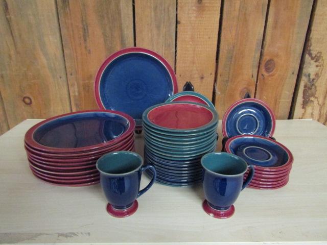 Denby 'Harlequin' Dinnerware: 10- 10" Dinner Plates, 11- 6 3/4" Bread Plates, 8- 6" Saucers, 8- 6 7/8" Saucers, 2 Pedestal Mugs ( One has Chip on Base)
