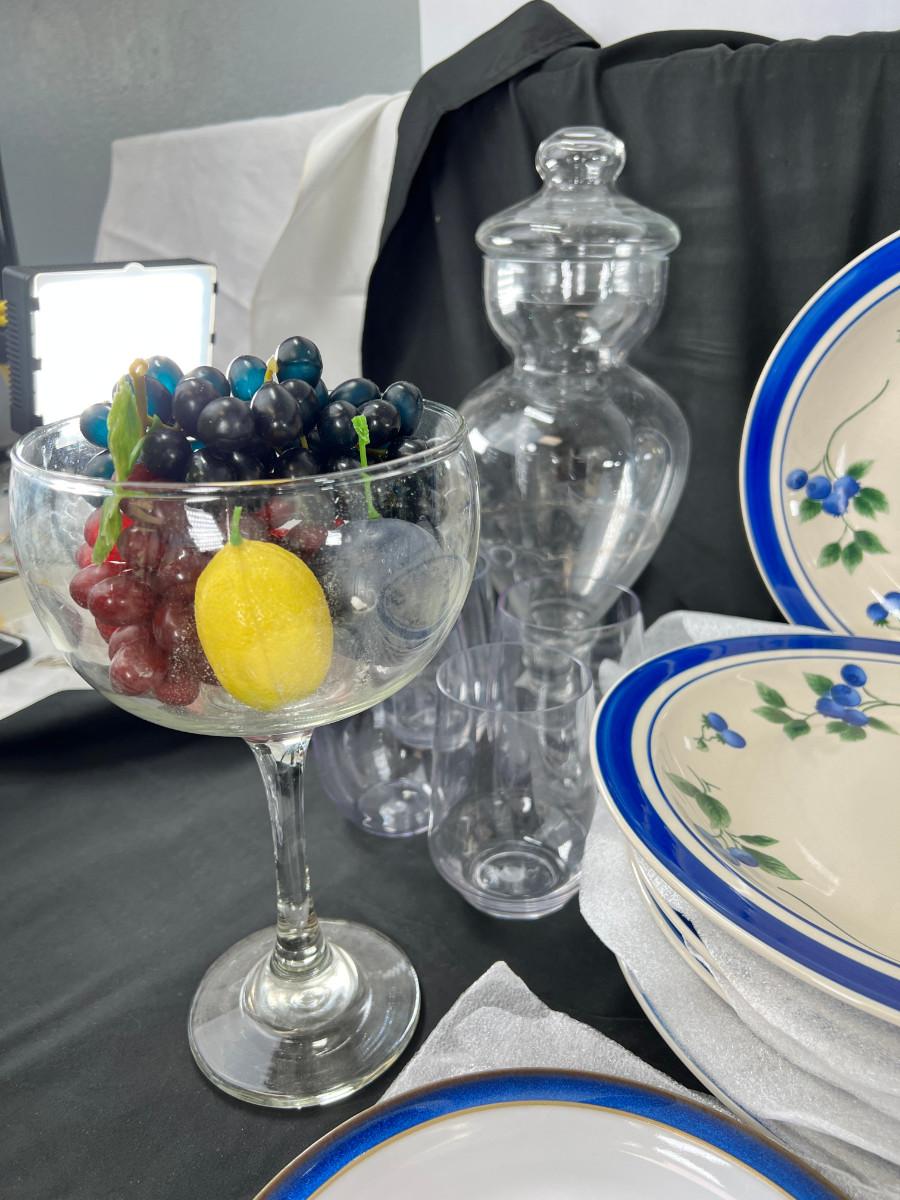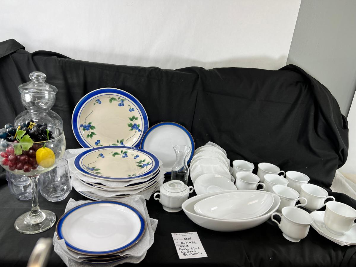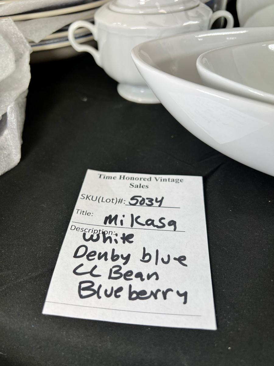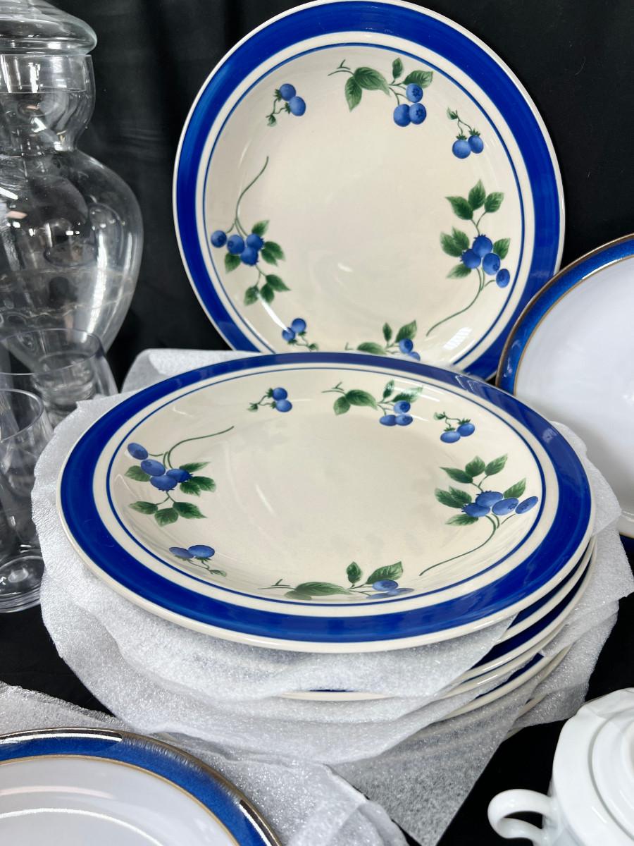 Denby salad plates. LL Bean Blueberry plates, Miskasa white every day china