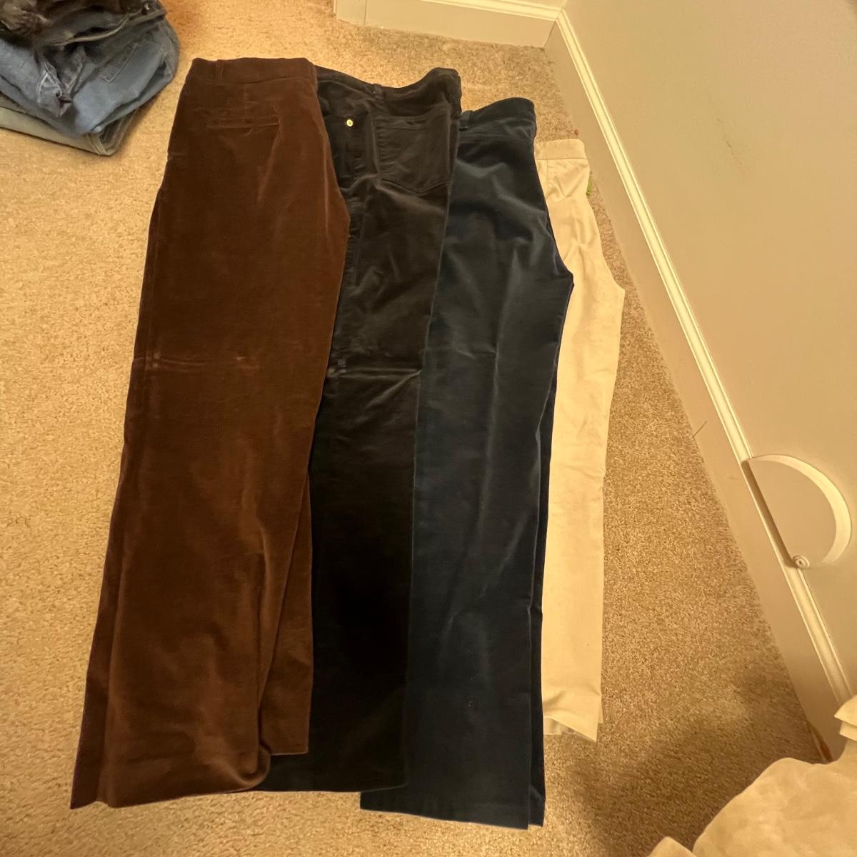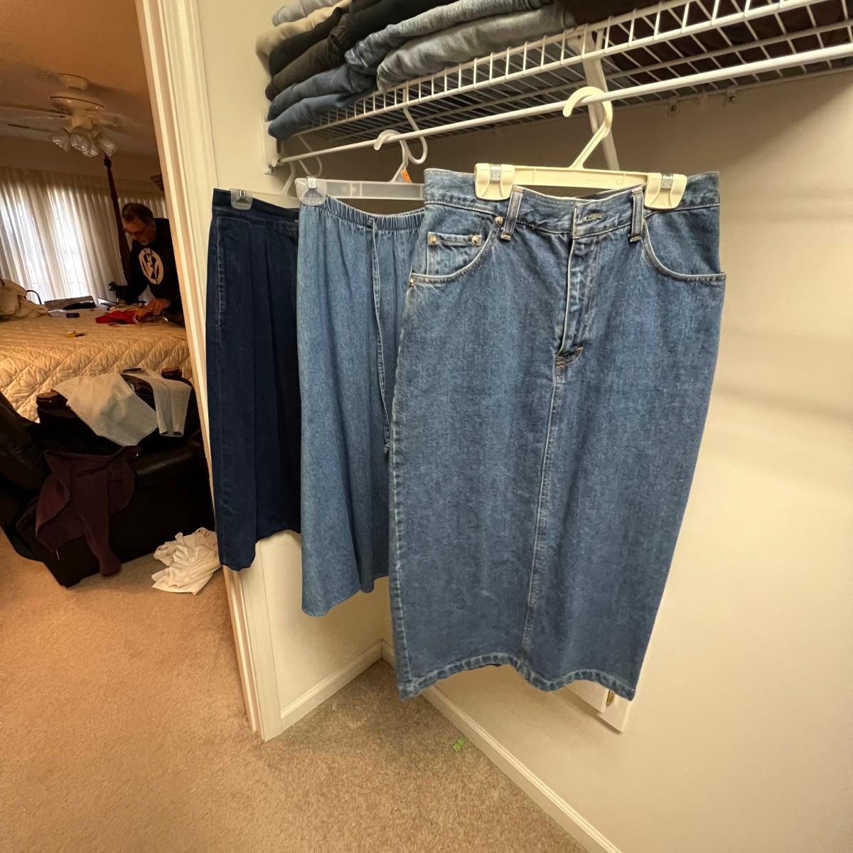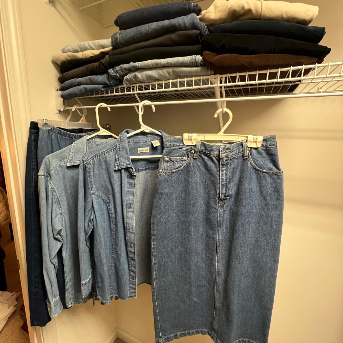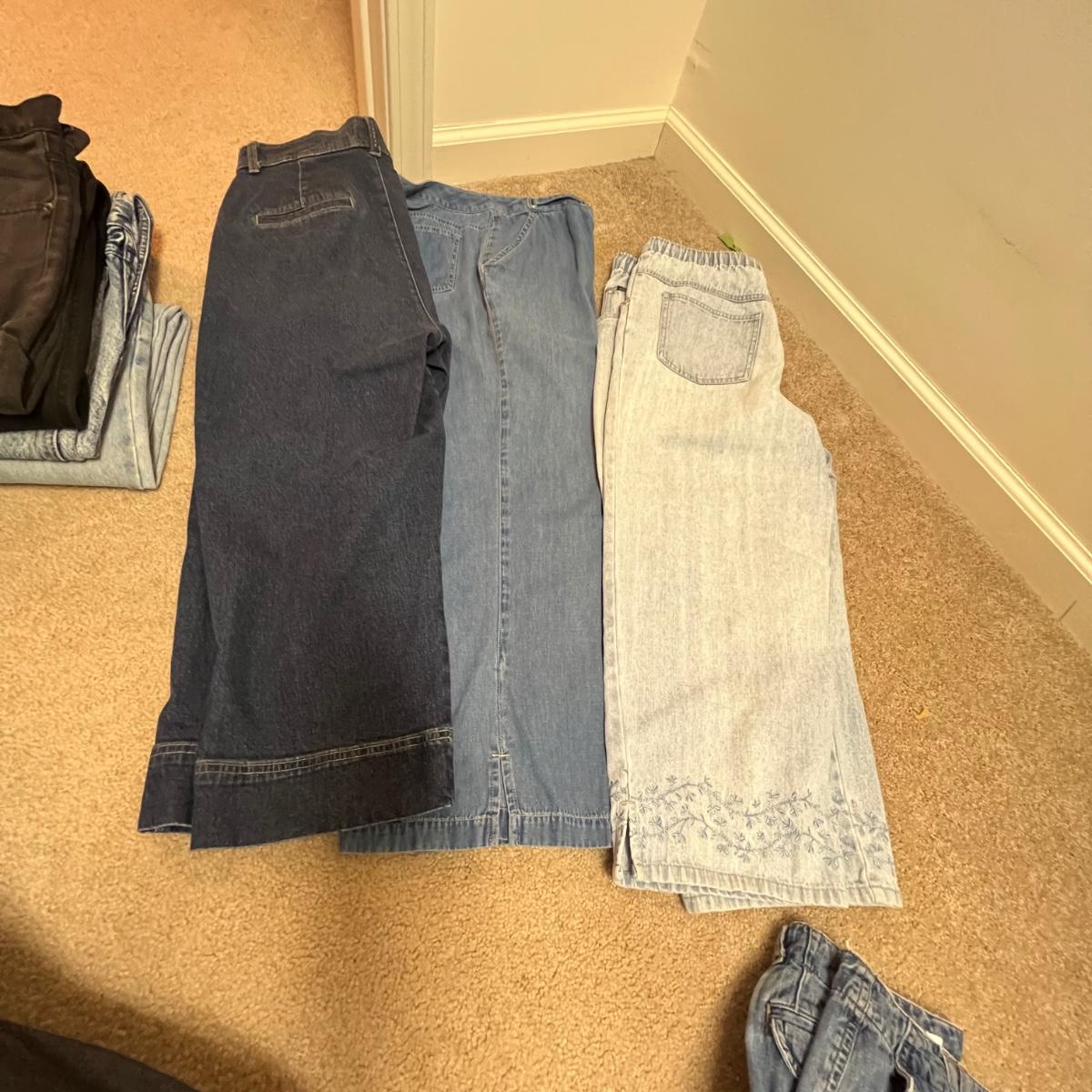 Ten plus pairs of jeans plus skirts and a couple of shirts make up the large amount of denim in this lot. Also included are four pairs of corduroy slacks. Sizes for pants are mostly 10 and a couple of pairs are capris, the rest are full length pants. See images for sizes and brands.