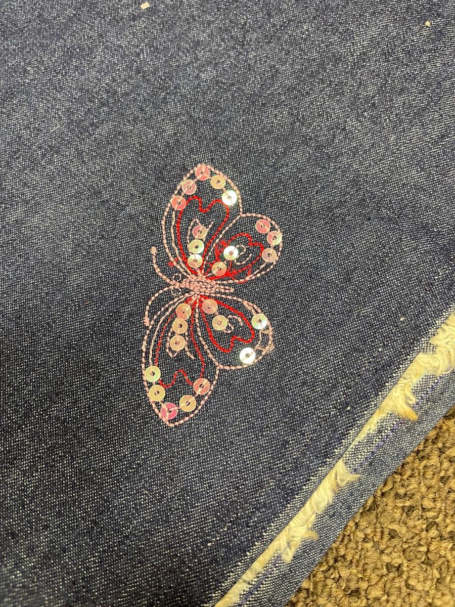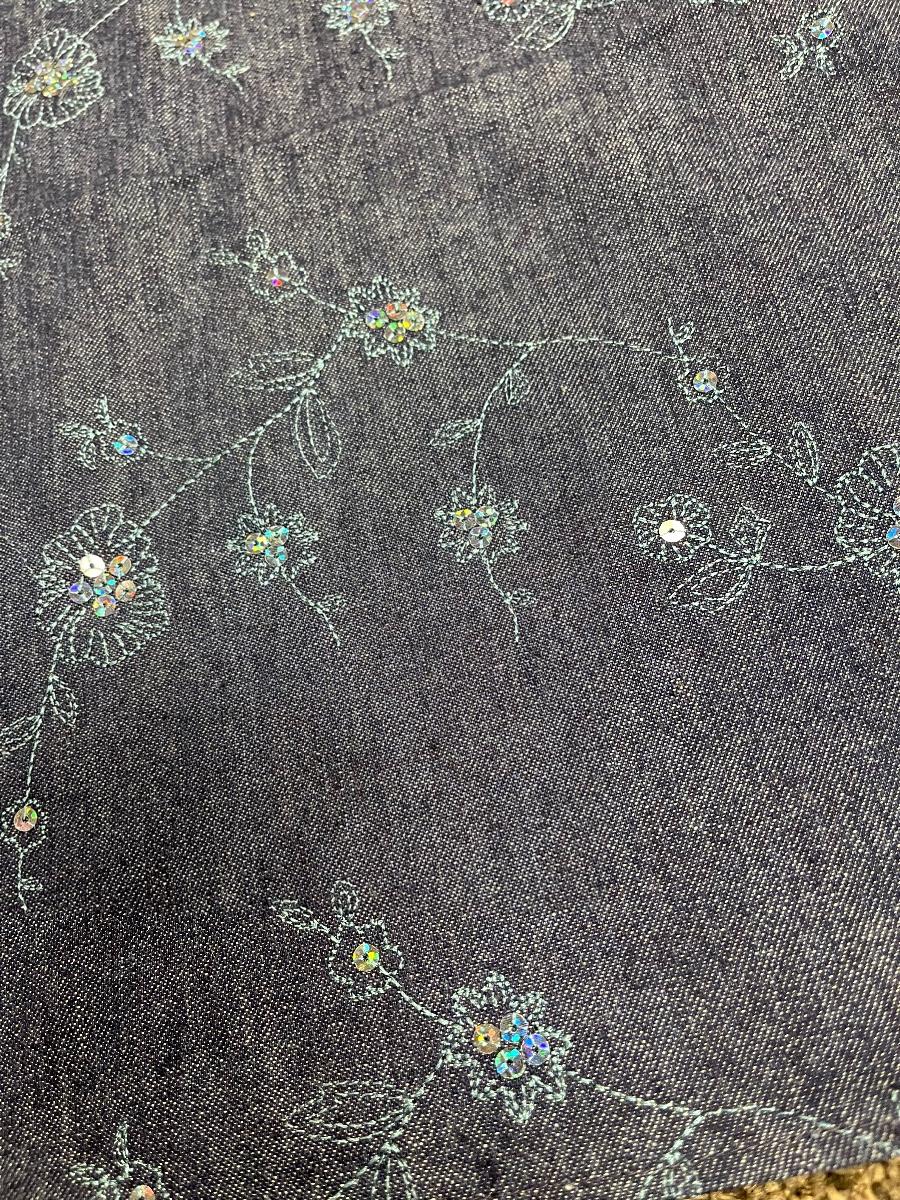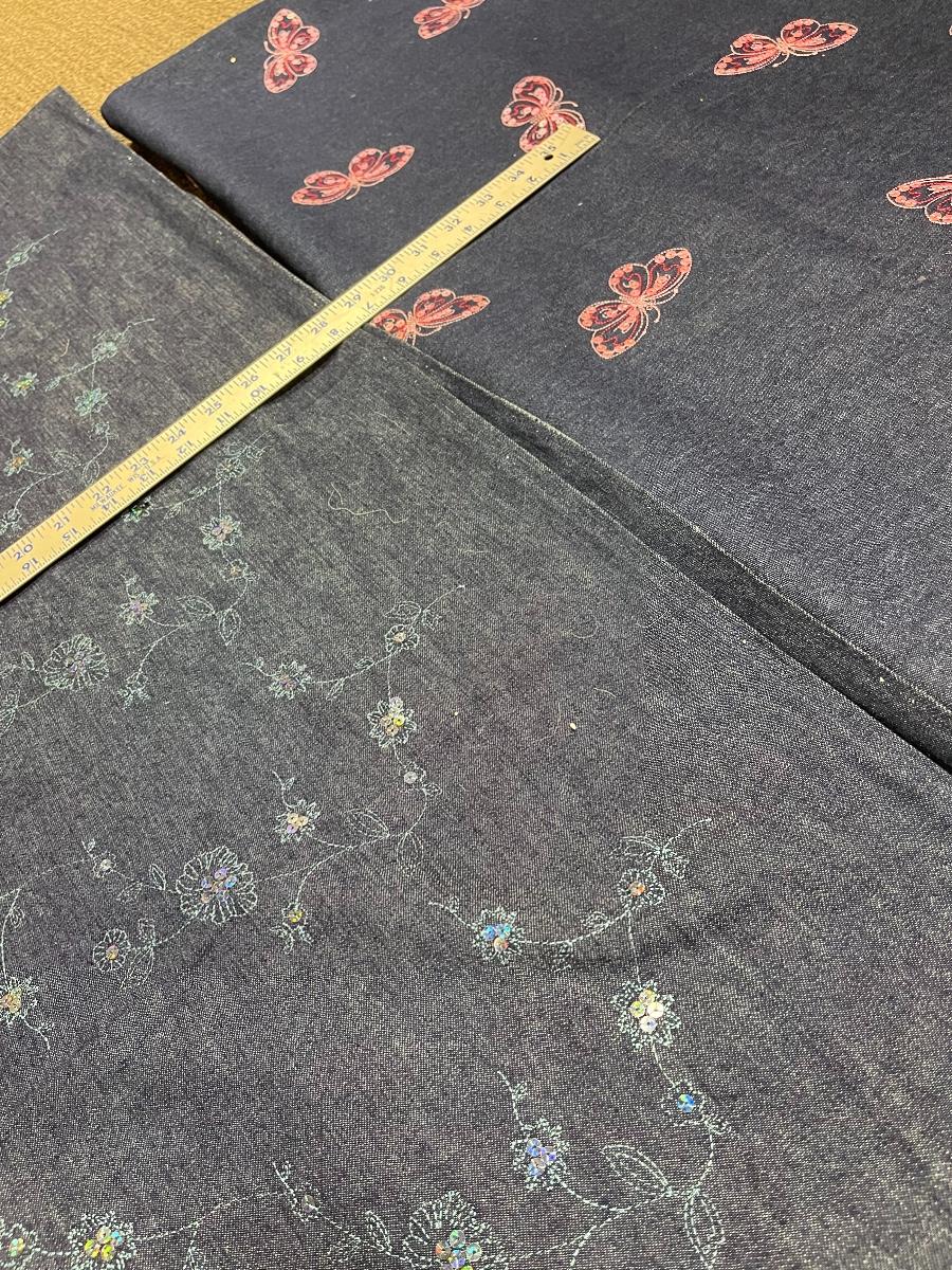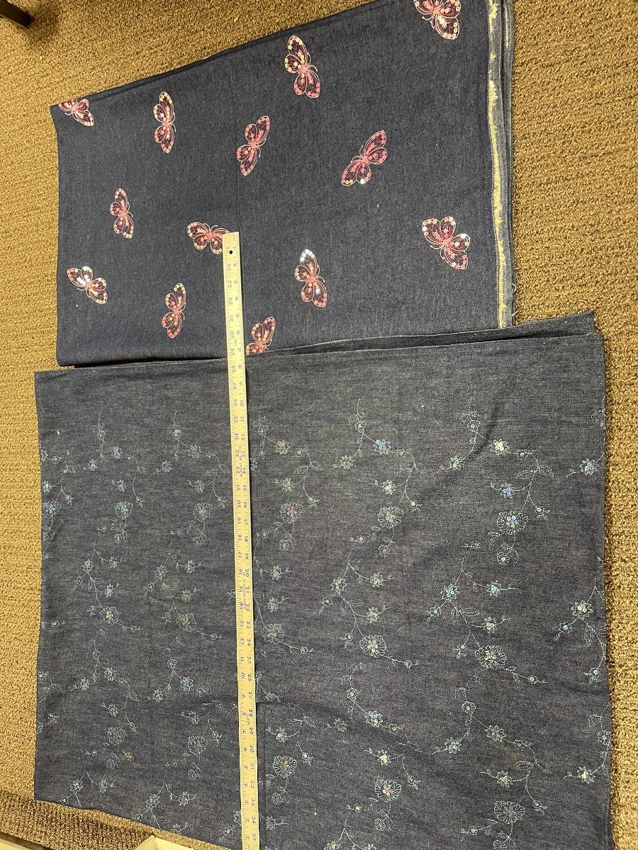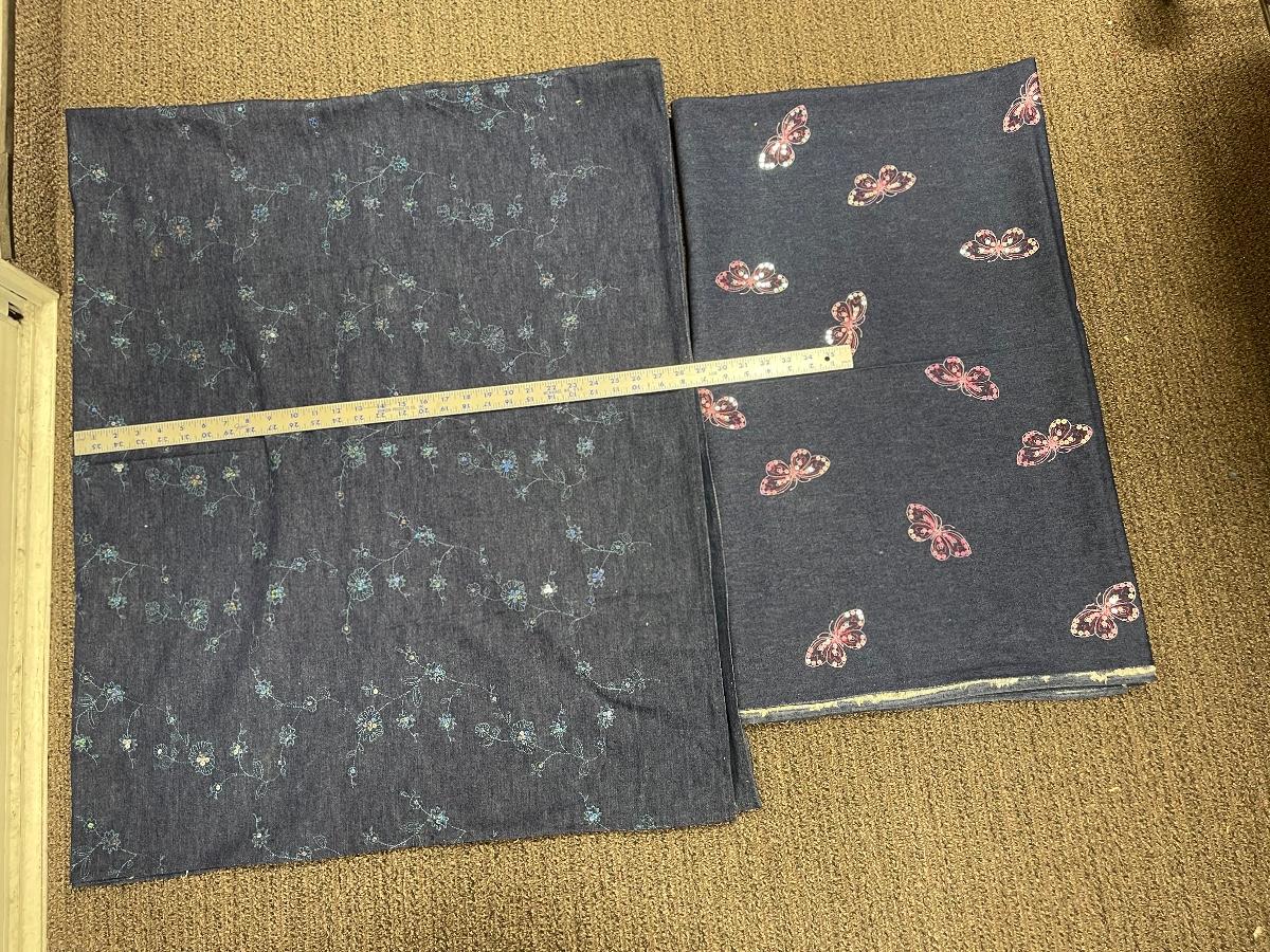 Roughly 2.5 yards each. They appear to be in new condition. Someone has hemmed the edges.
