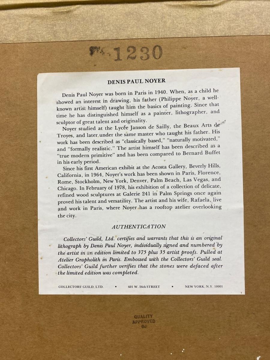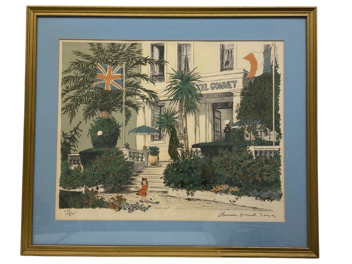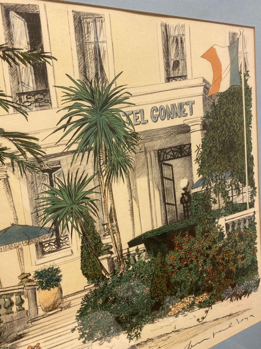 Denis Paul Noyer (France, born 1940), Hotel Gonnet, limited edition lithograph. Authenticated by the Collectors Guild and pulled at Atelier Grapholith in Paris with blindstamp lower left. Framed 23 x 27 inches, sight 16.5 x 21 inches.