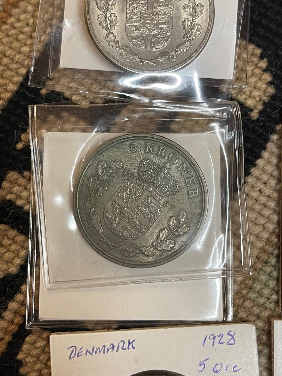 (6) vintage Denmark coins - 1964 5 kroner, 1981 10 kroner, 1961 5 kroner, 1929 25 ore, 1928 5 ore, 1927 2 ore