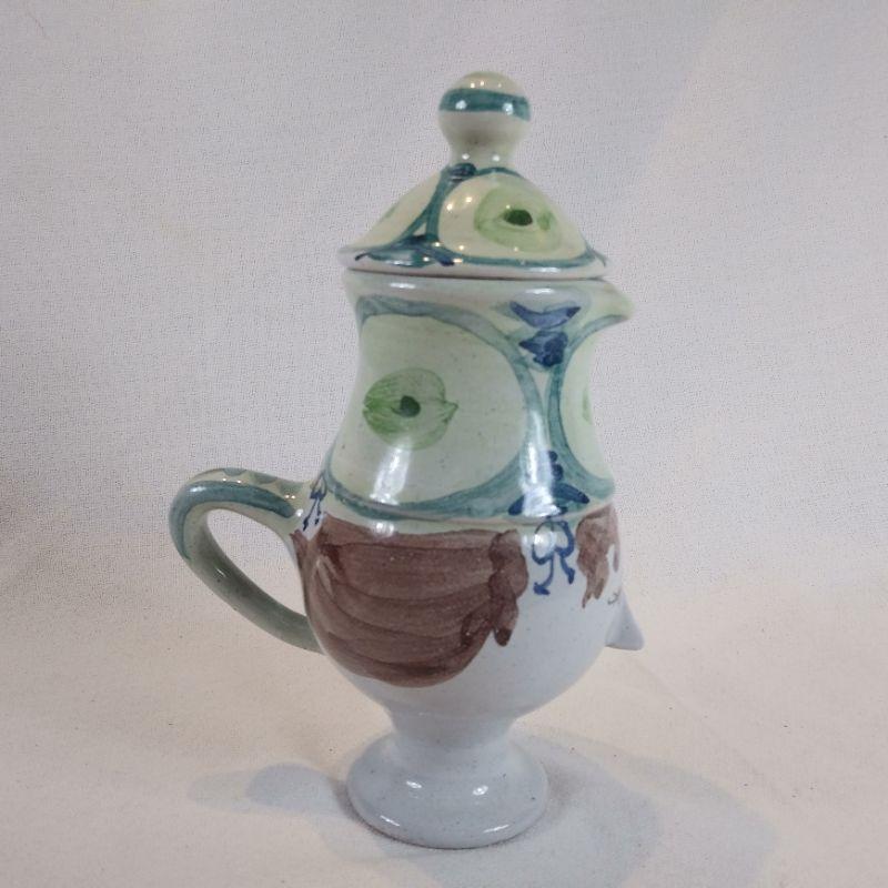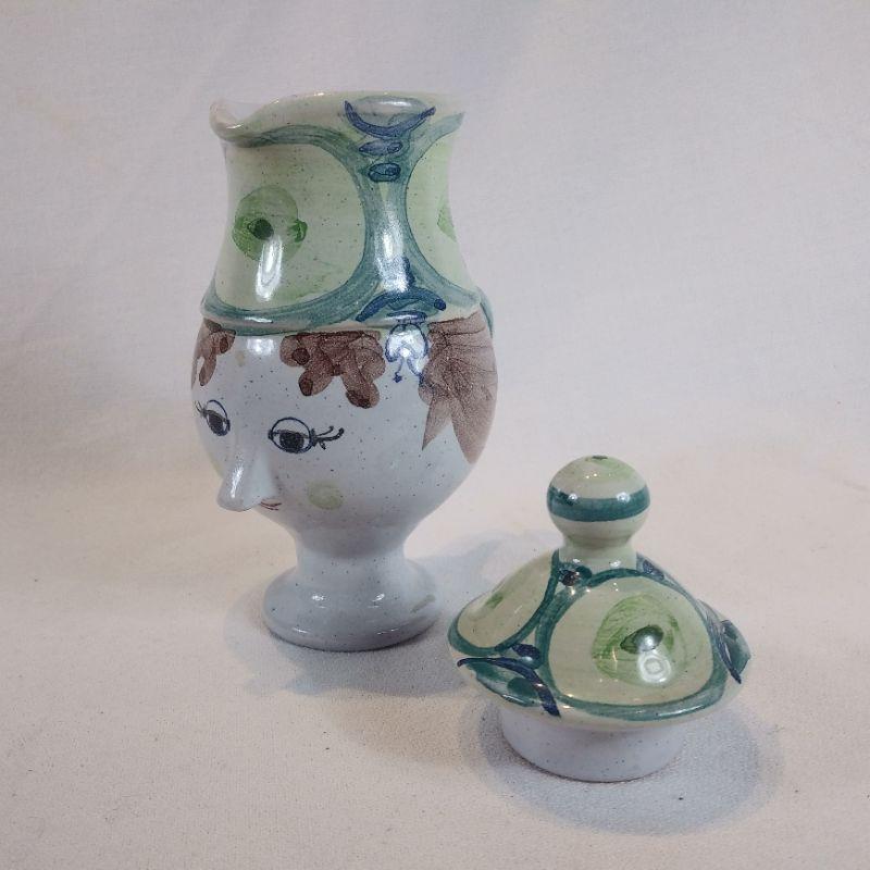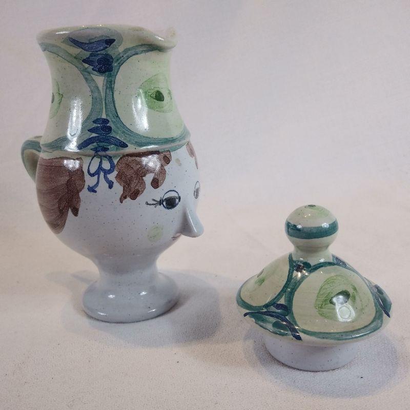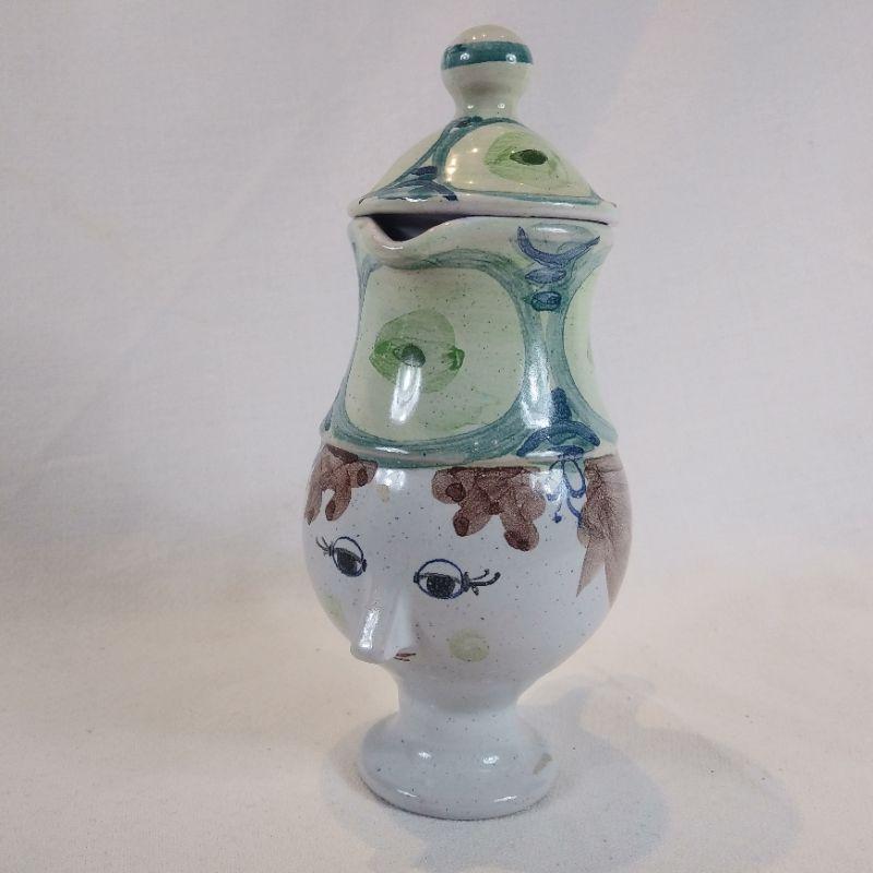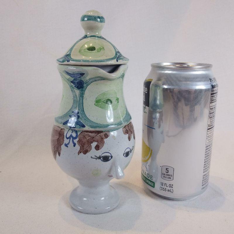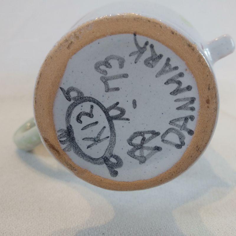 This is a very cool, small face pitcher made in Denmark. Hand-painted and handmade It measures 6 1/2-inches tall. Shows no chips or cracks - in very good condition. Such pretty whimsy for your kitchen.