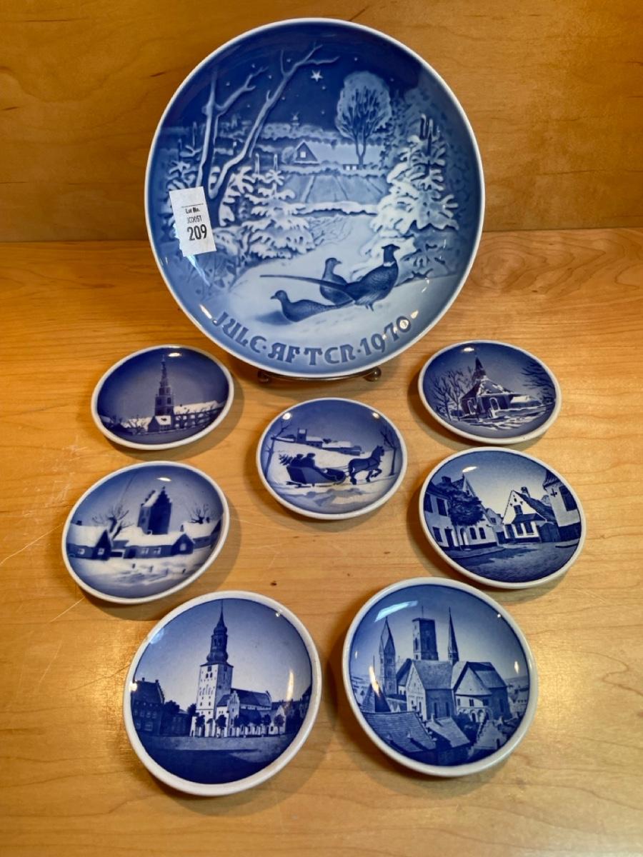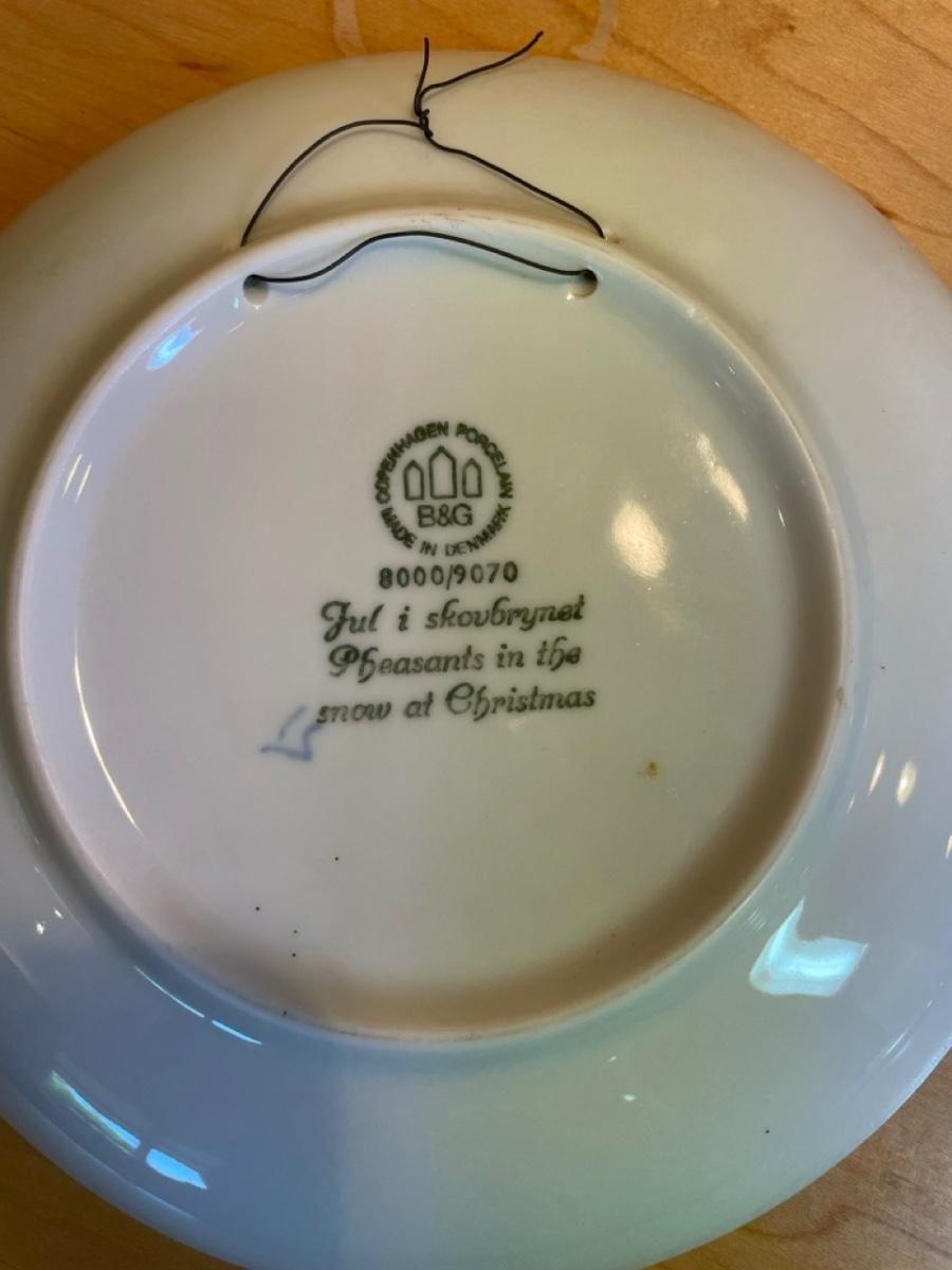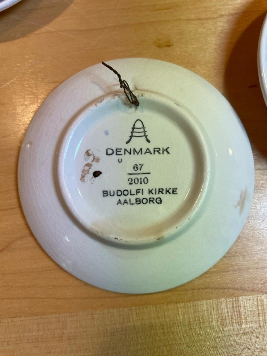 Large plate is stamped Copenhagen Porcelain, small plates are stamped Buldolfi Kirk Aalborg
