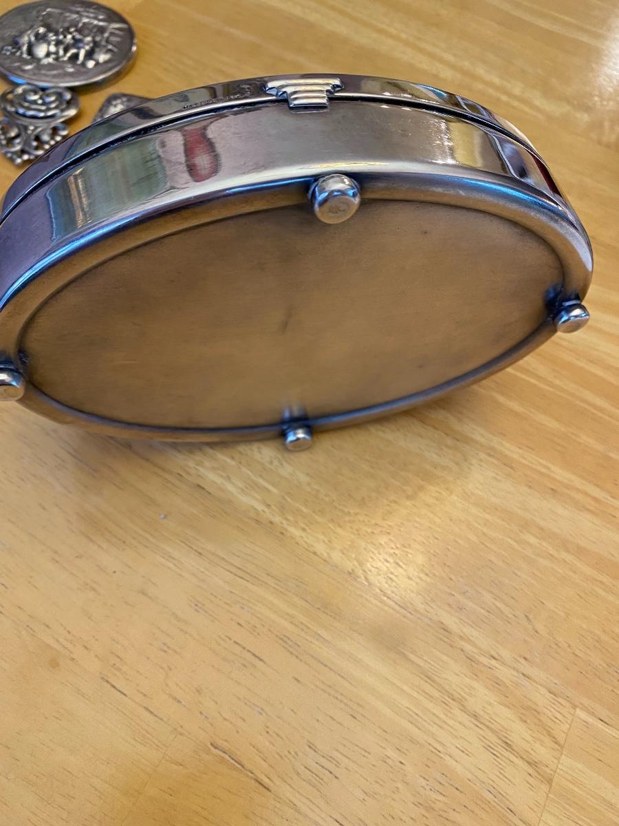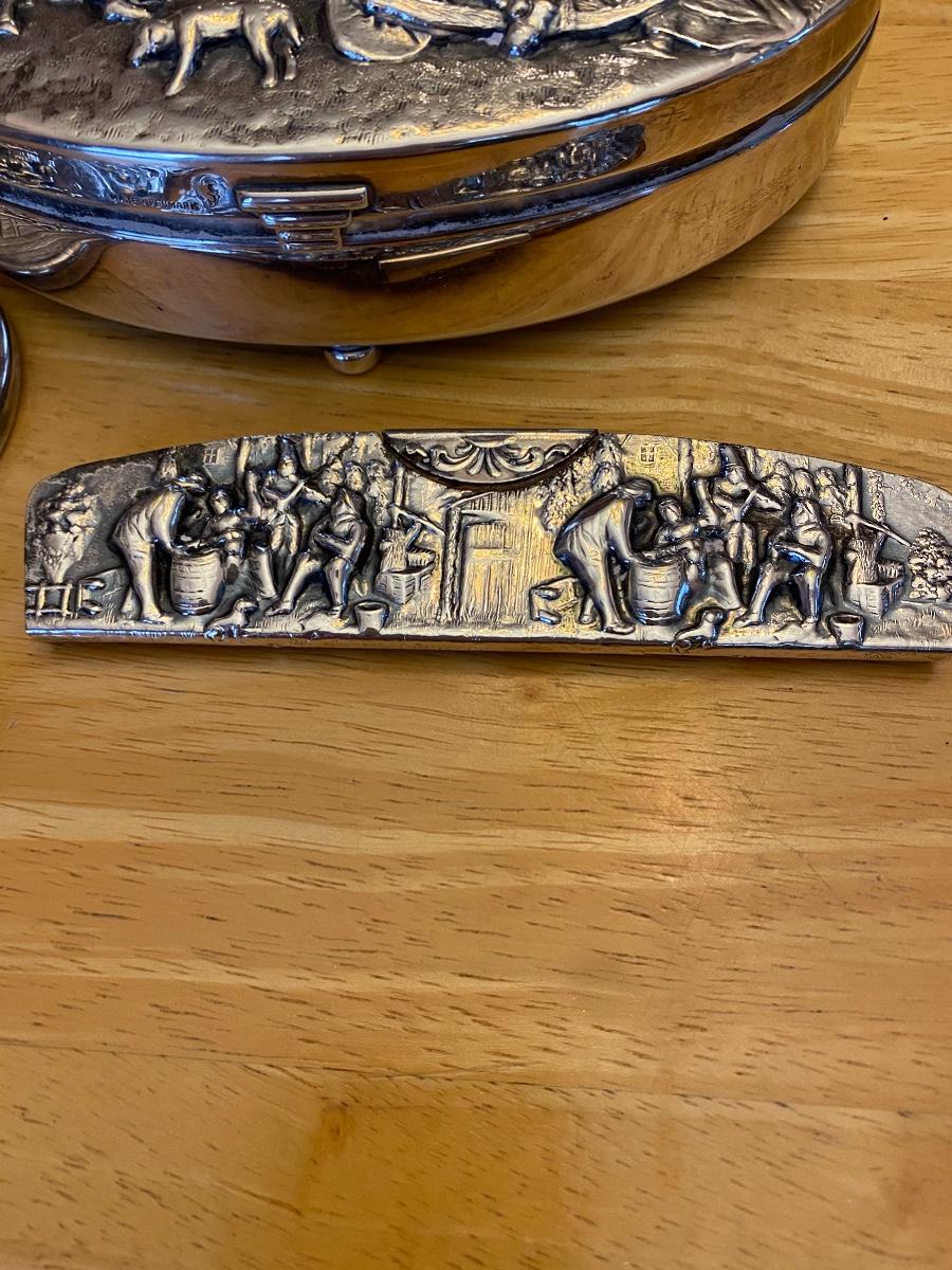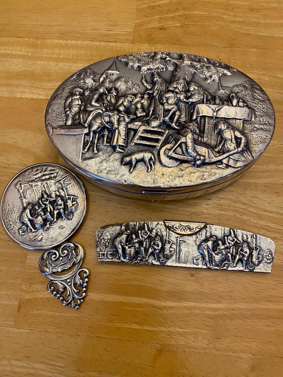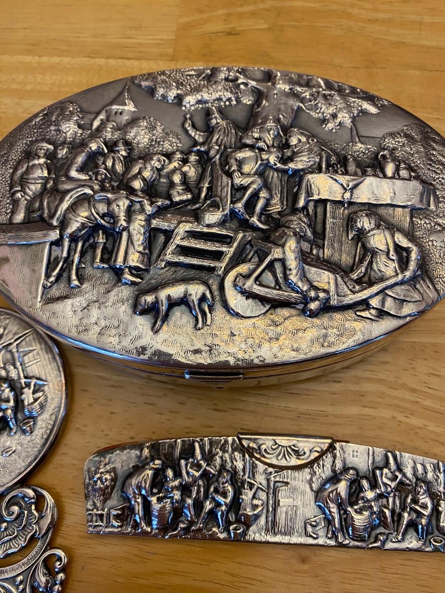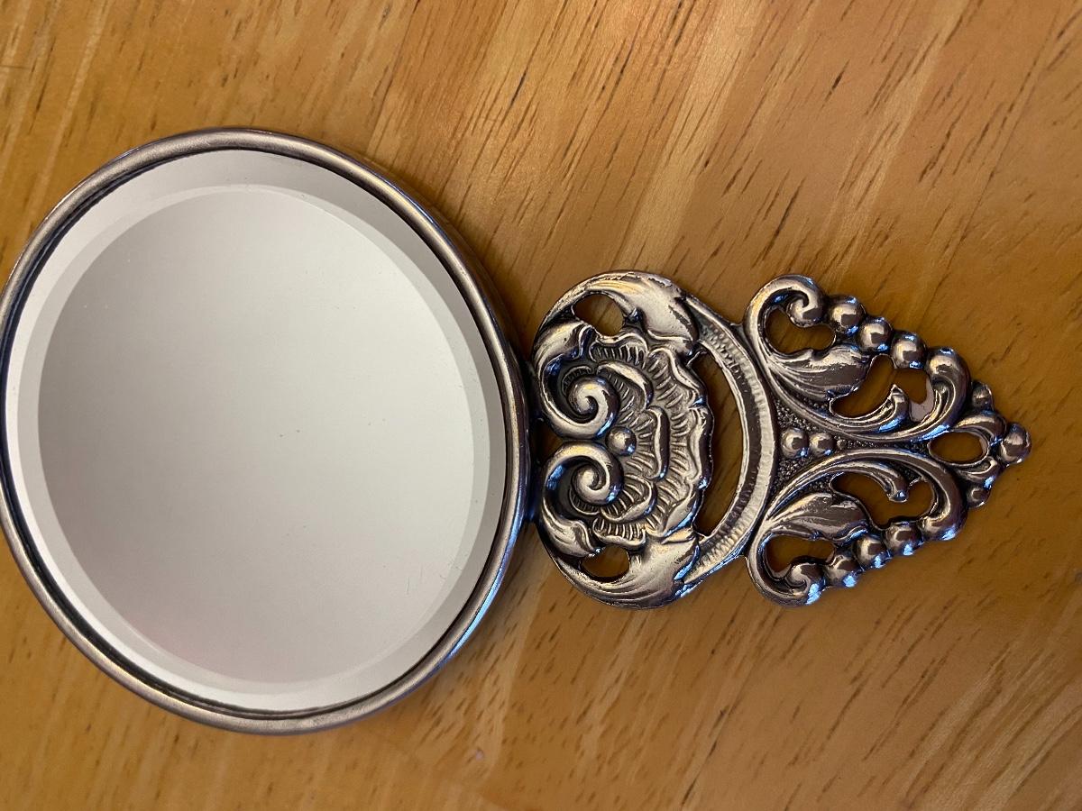 A three piece set comprising handheld mirror, comb and jewelry box. The comb needs a repair where it opens because the silver piece is loose.The round jewelry box measures 6 1/4"w x 4 1/2" deep x 1.5" high. The mirror measures 4 1/2" x 3". The comb measures 5"long.