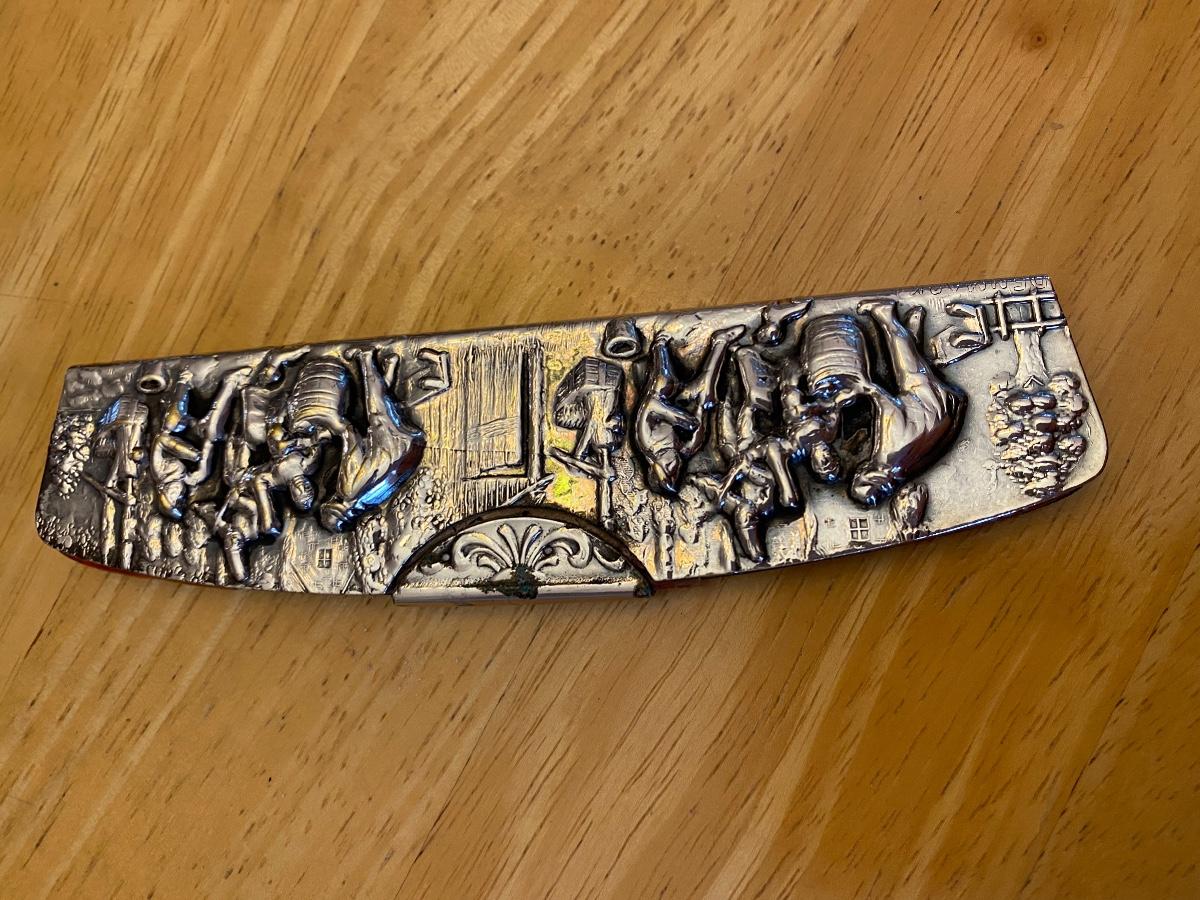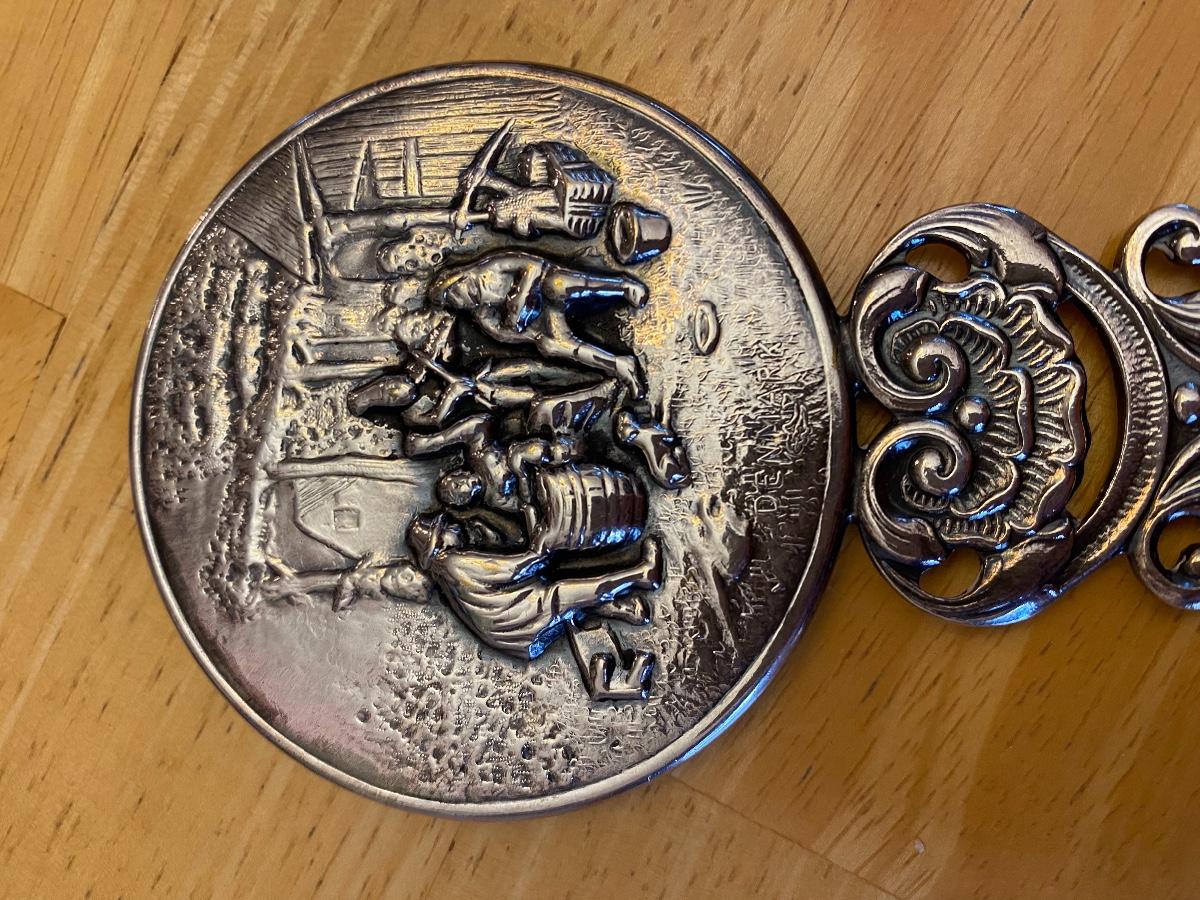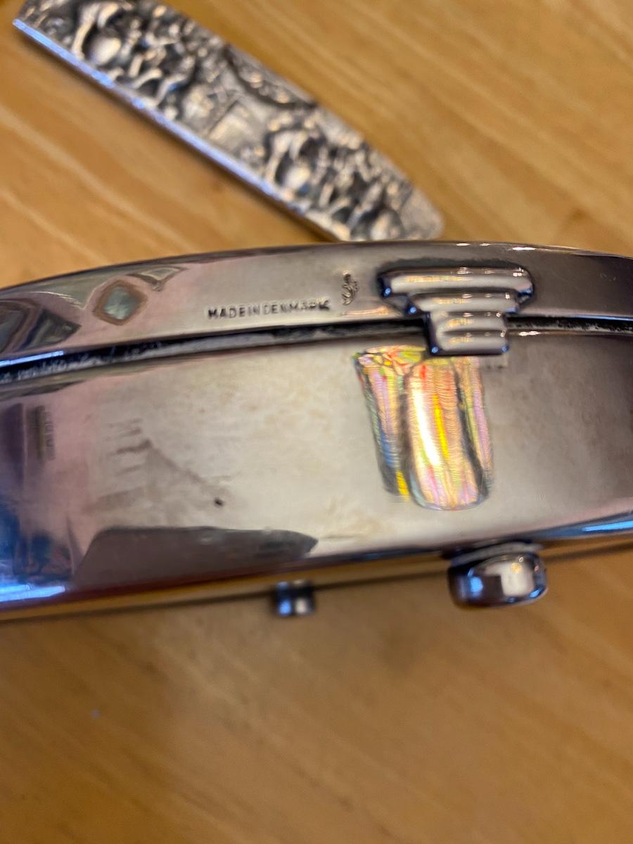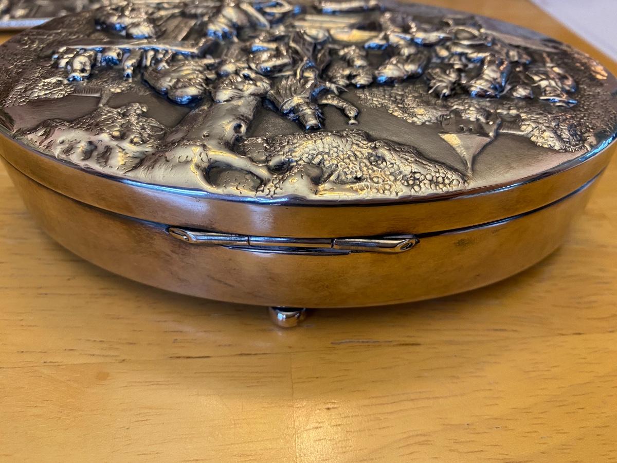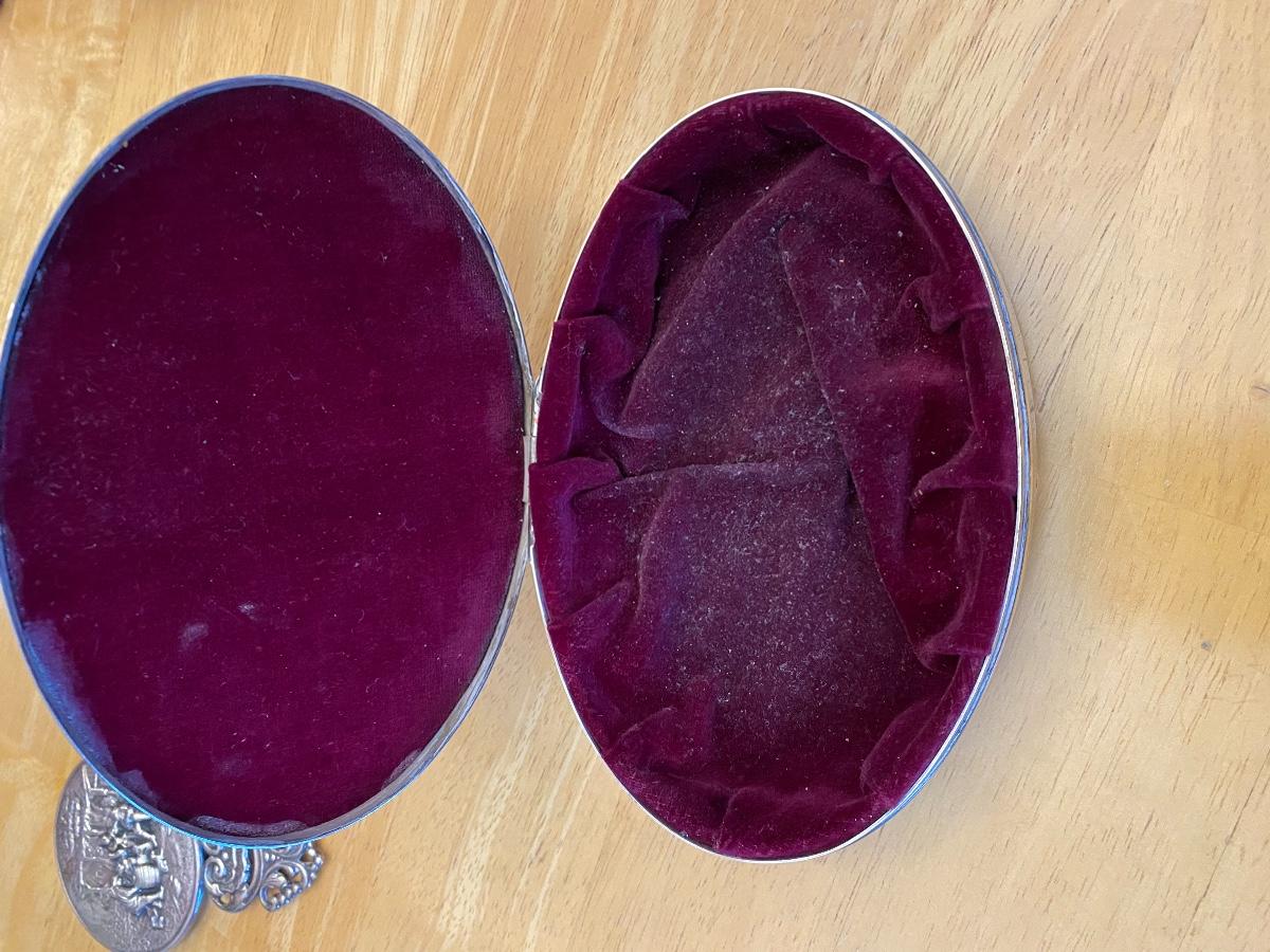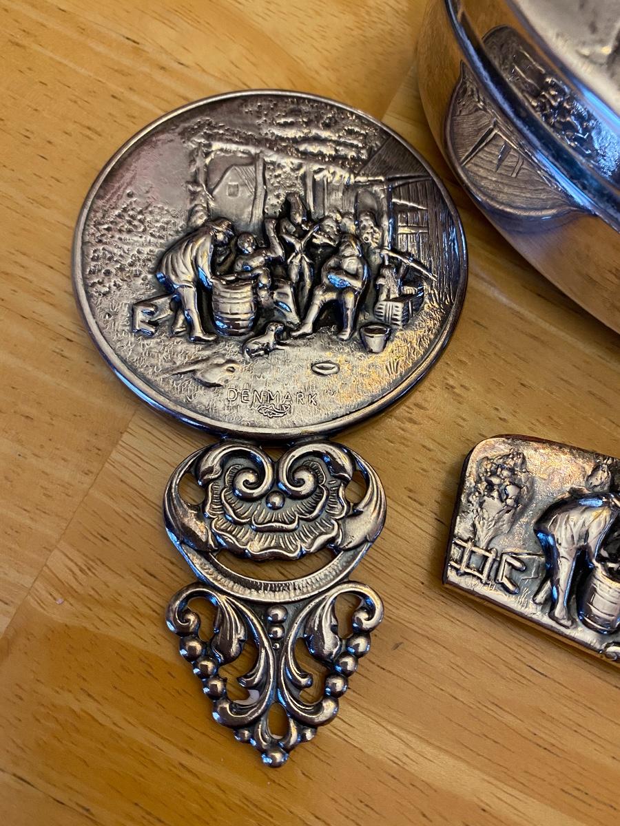 A three piece set comprising handheld mirror, comb and jewelry box. The comb needs a repair where it opens because the silver piece is loose.The round jewelry box measures 6 1/4"w x 4 1/2" deep x 1.5" high. The mirror measures 4 1/2" x 3". The comb measures 5"long.