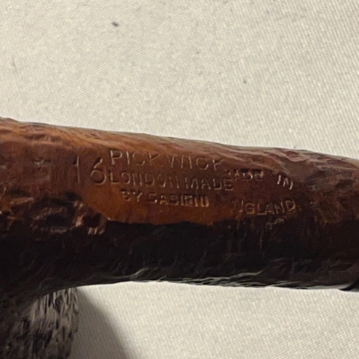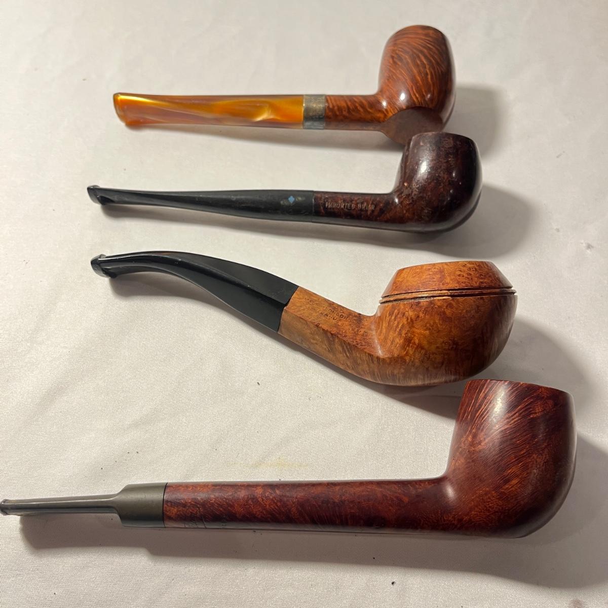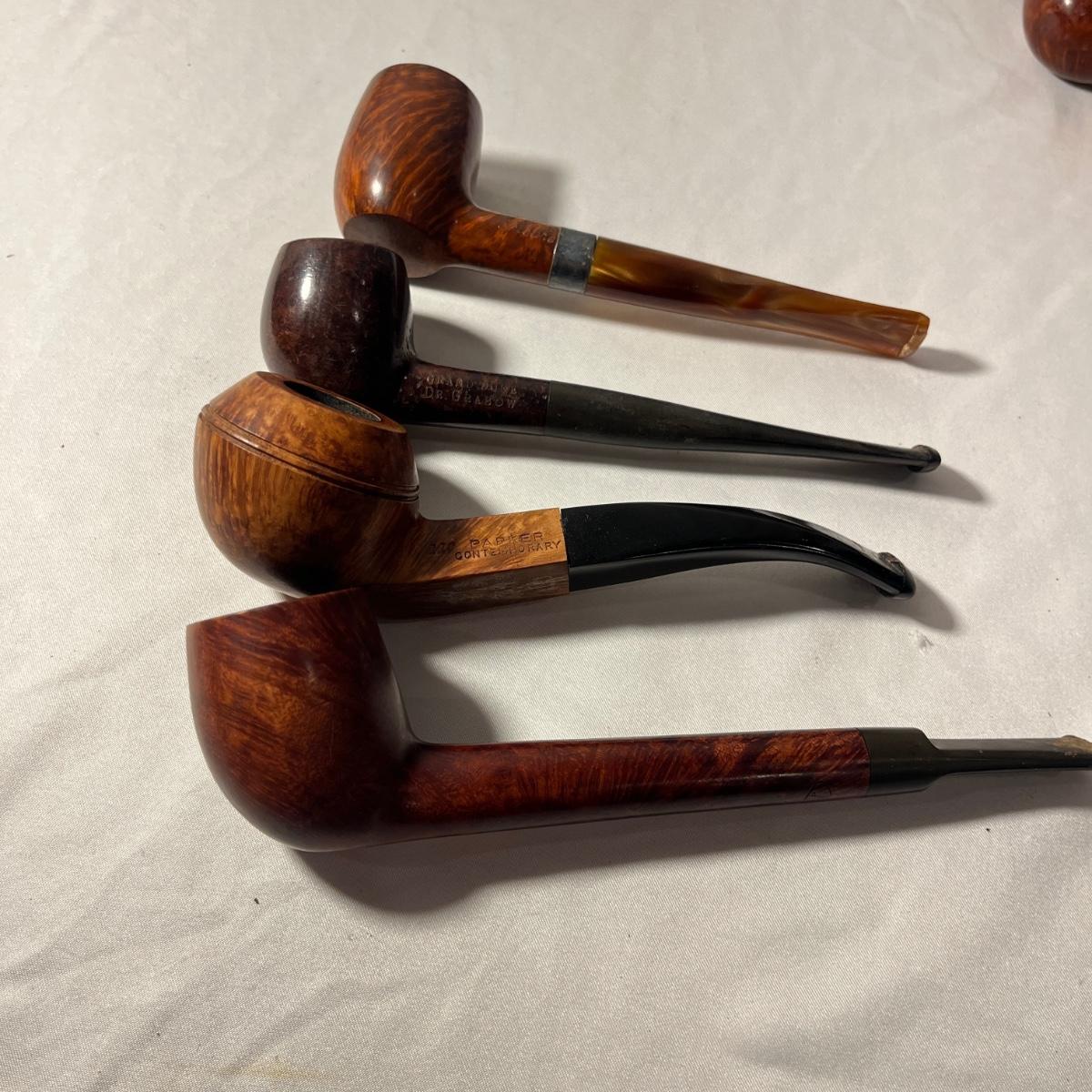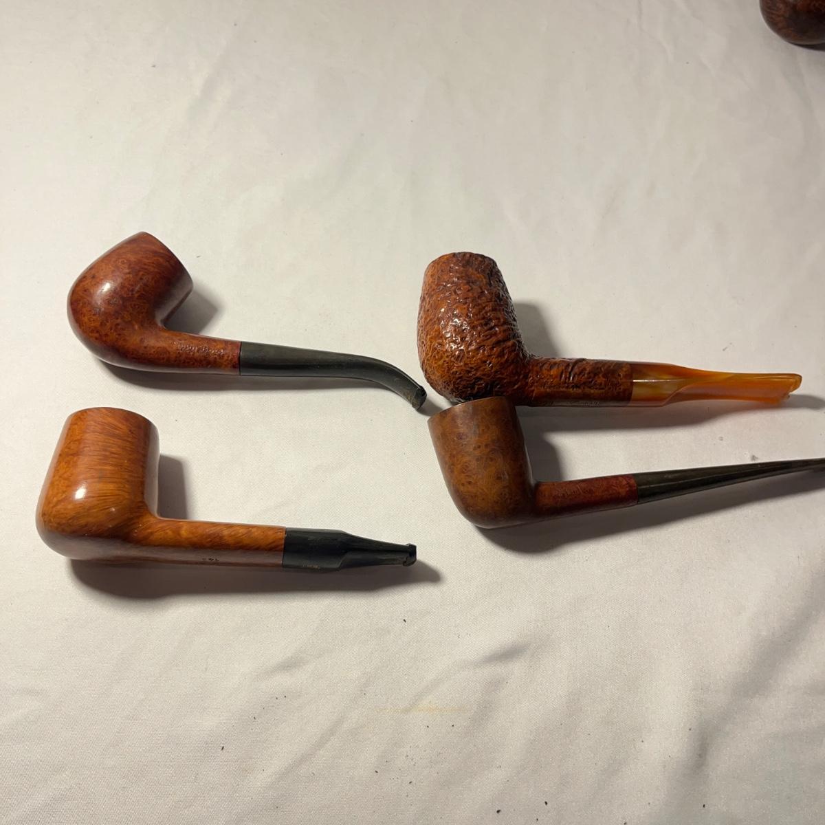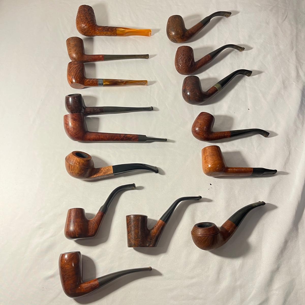 Lot contains a variety of 16 pipes including Denmore, Harrods, Parker, Pickwick and more pipes. Longest pipe measures 7” x 1.25” x 2”H. All pipes appear to be wood.