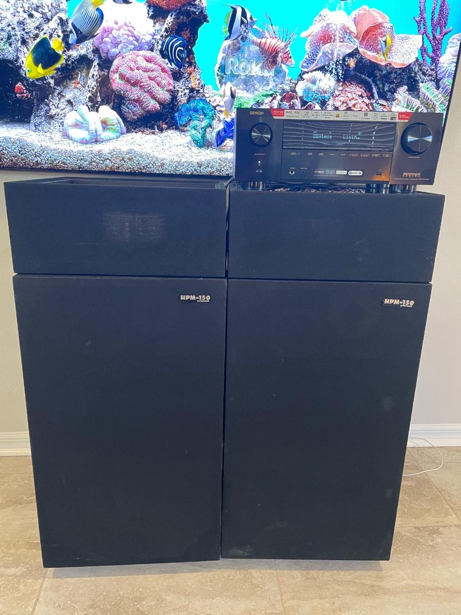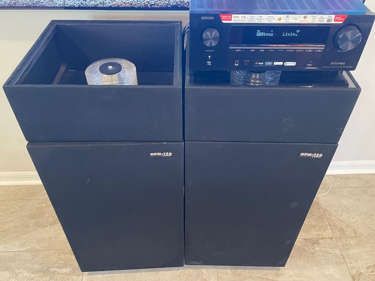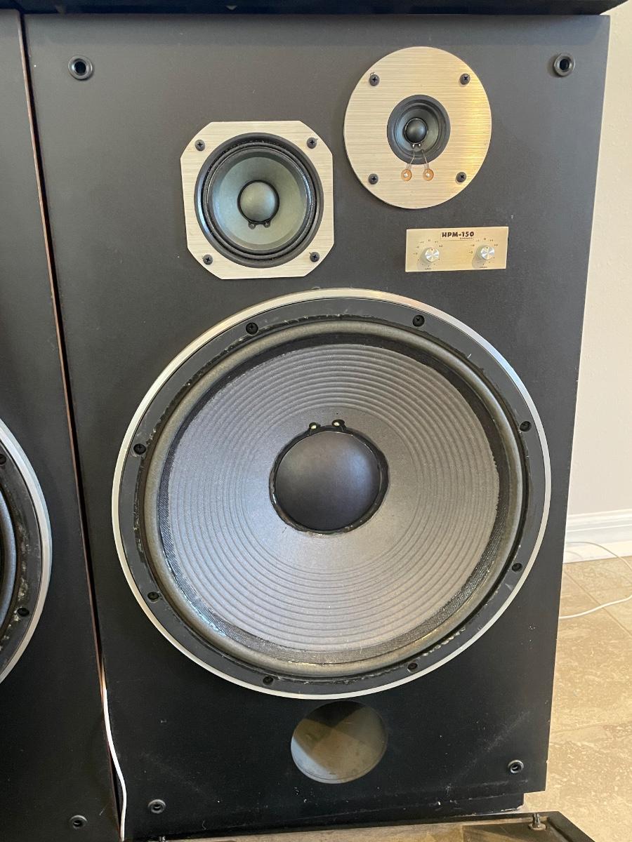 Two Pioneer HPM - 150 speakers. The top glass on one of the speakers is missing. Other than that, everything else
