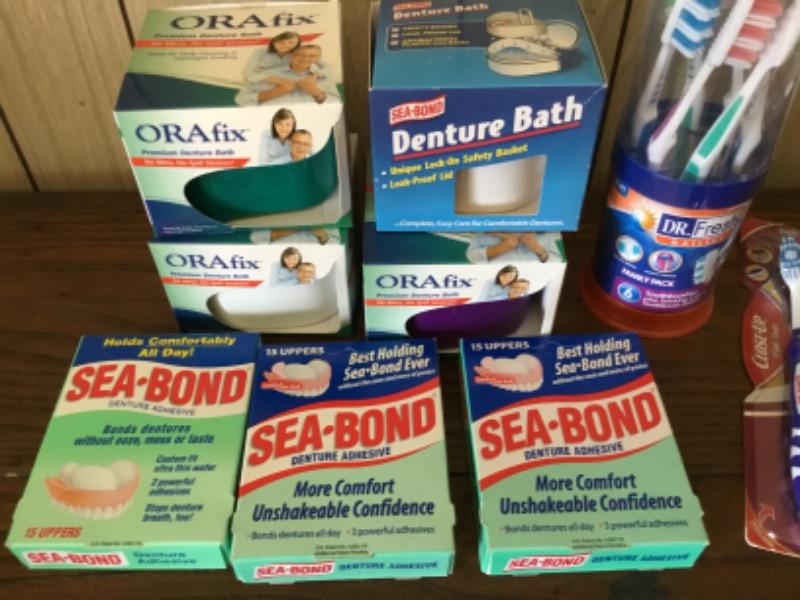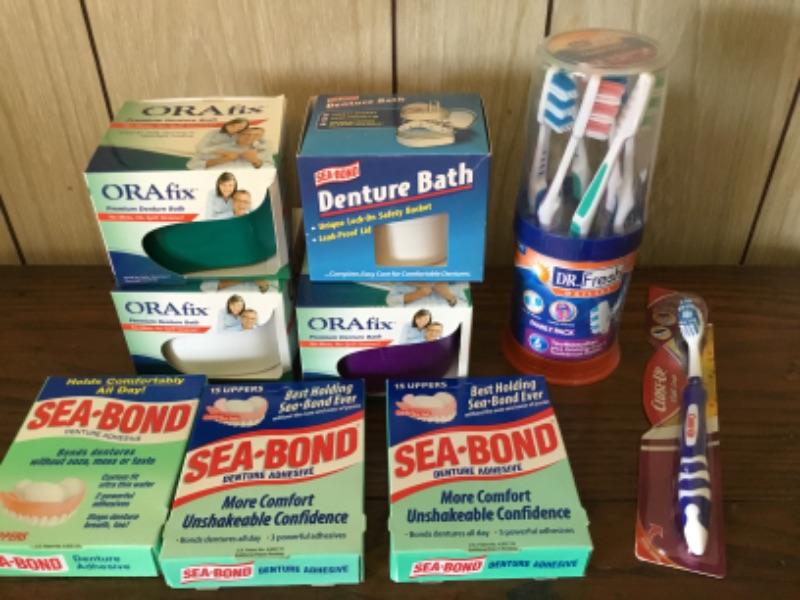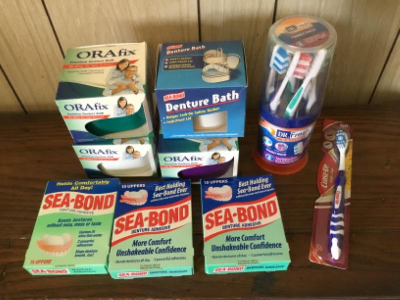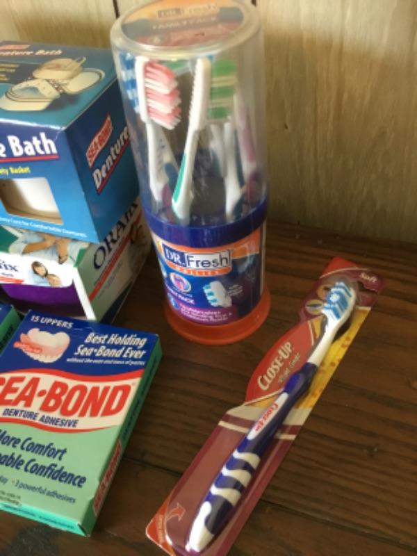 Unopened denture soak containers, SeaBond adhesive, and toothbrushes