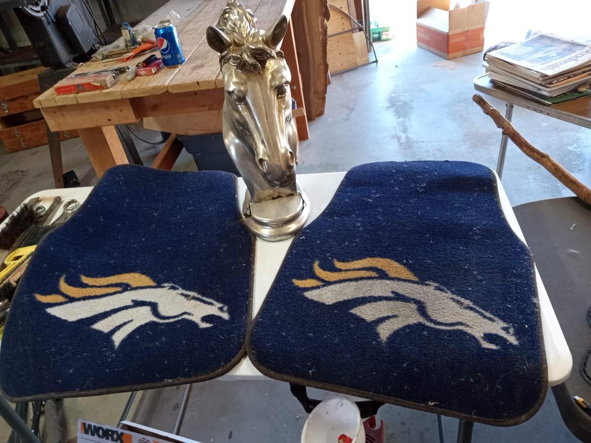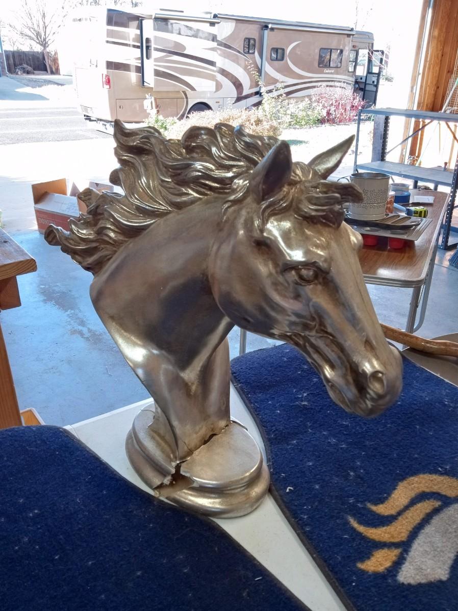 THE HORSE HEAD HAS SOME DAMAGE ON THE BASE, IT LOOKS LIKE CHROME BUT IS PLASTIC AND STANDS 17"