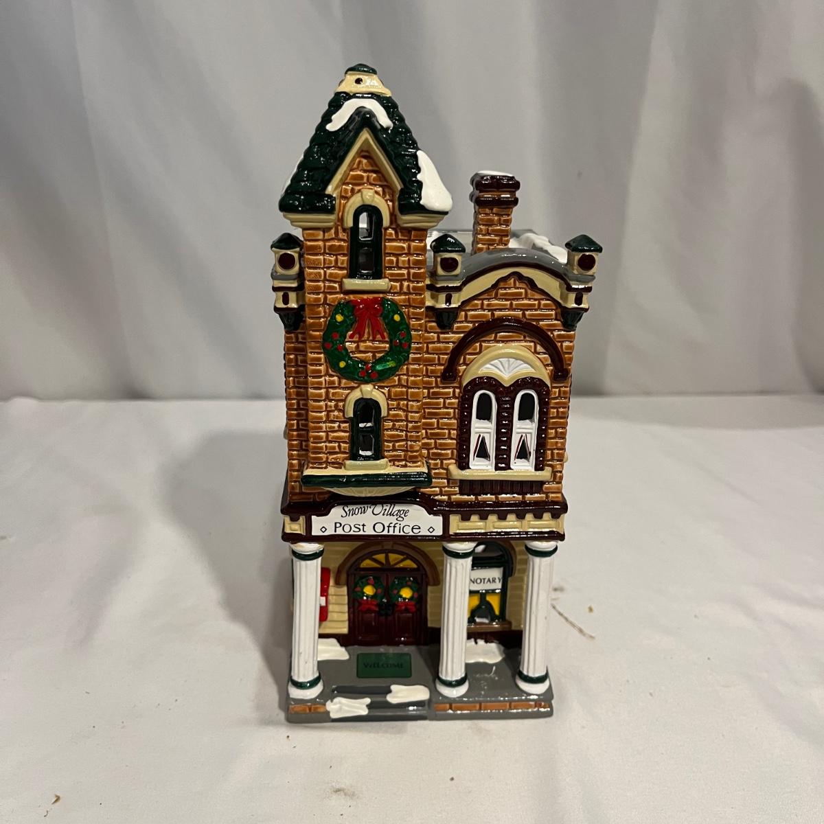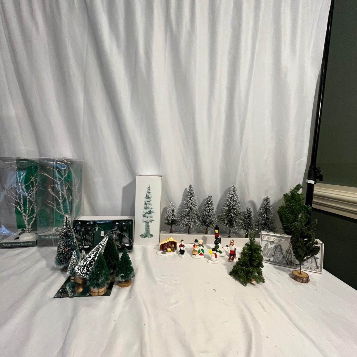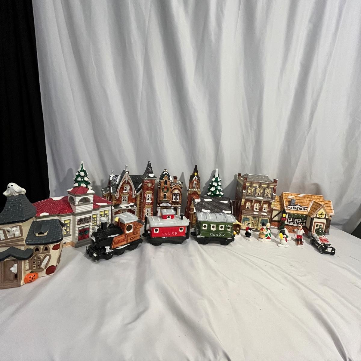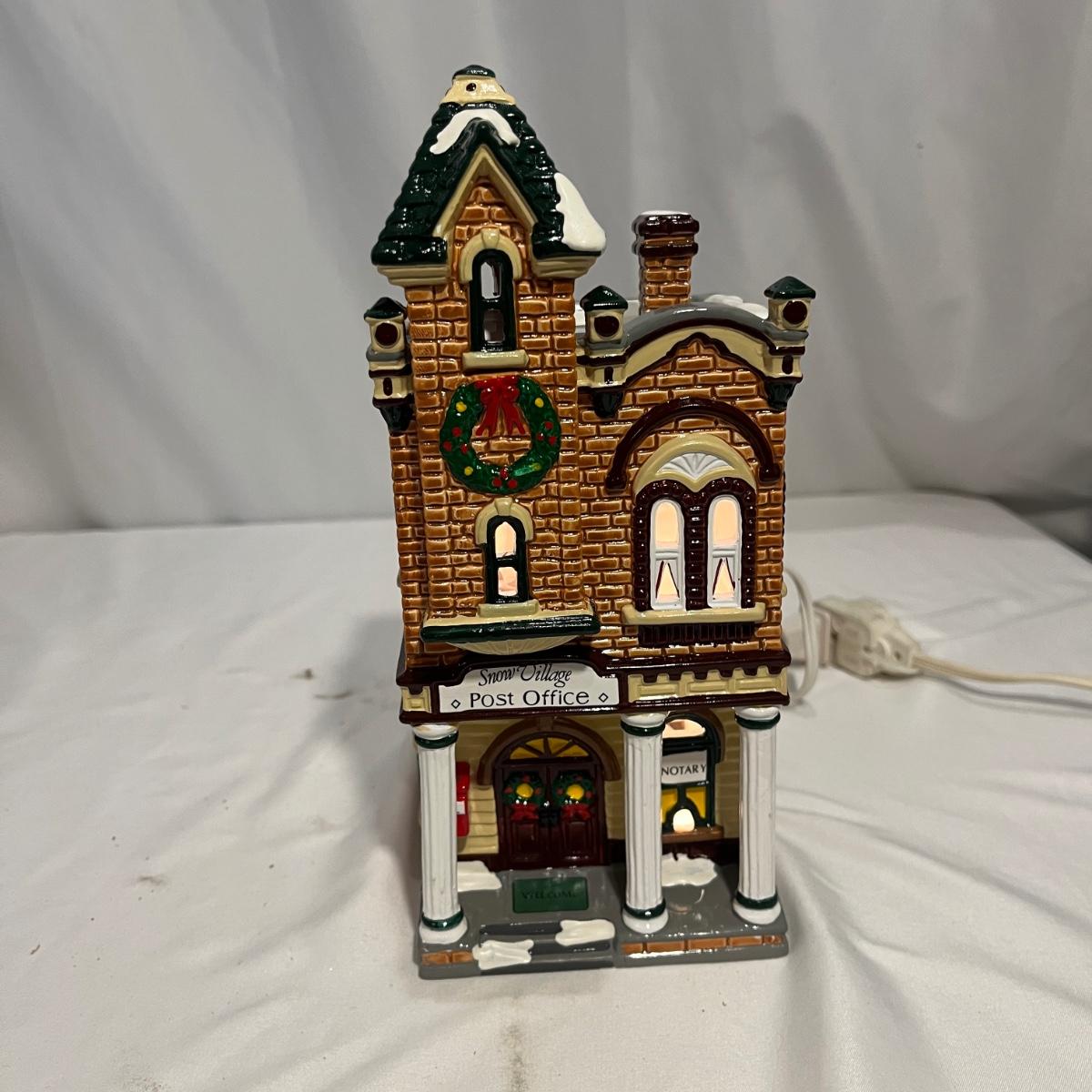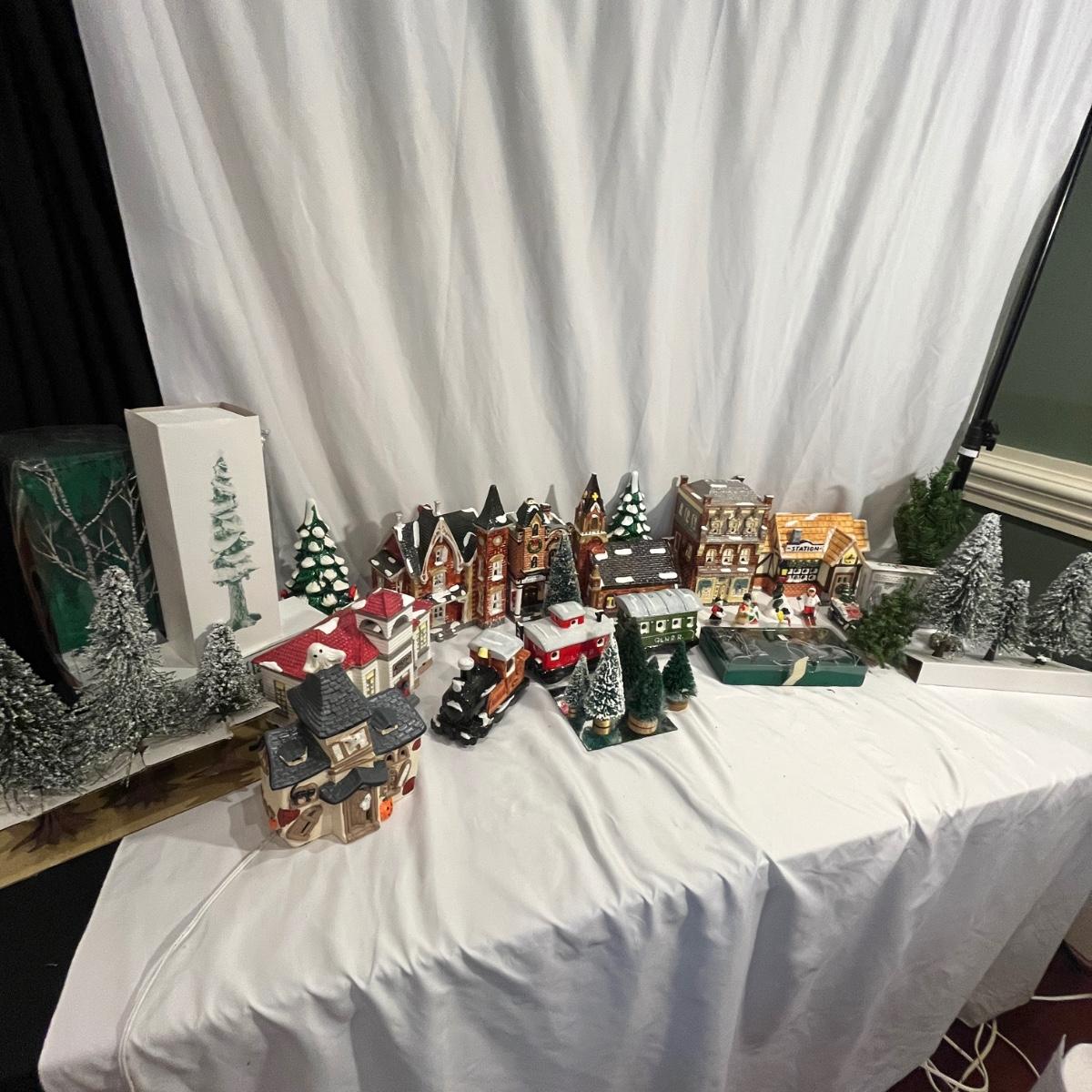 This collection of Department 56 houses includes locomotive and two cars, car, nativity piece, Gothic Church, two Pole Pine Trees, Snow Village, Grocery store, Christmas tree, Village Post Office and more. Also includes a selection of miniature trees by Department 56 and more trees. Tallest building measures 8” x 6.5” x 10”H. All lights powered on when plugged in.