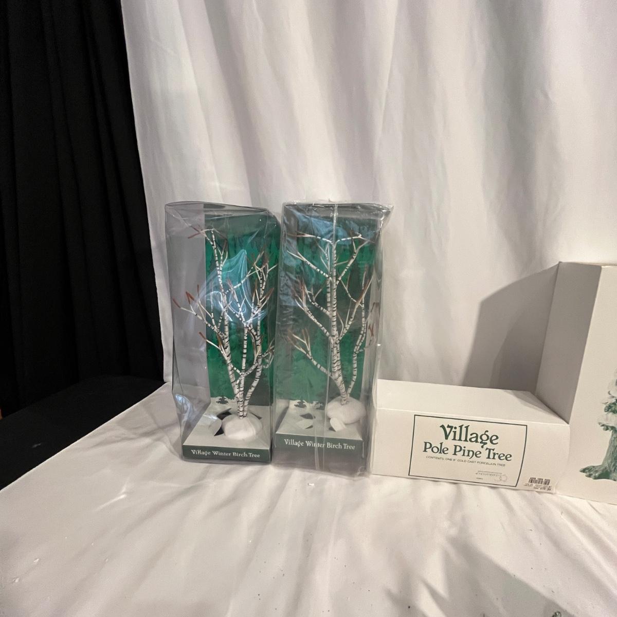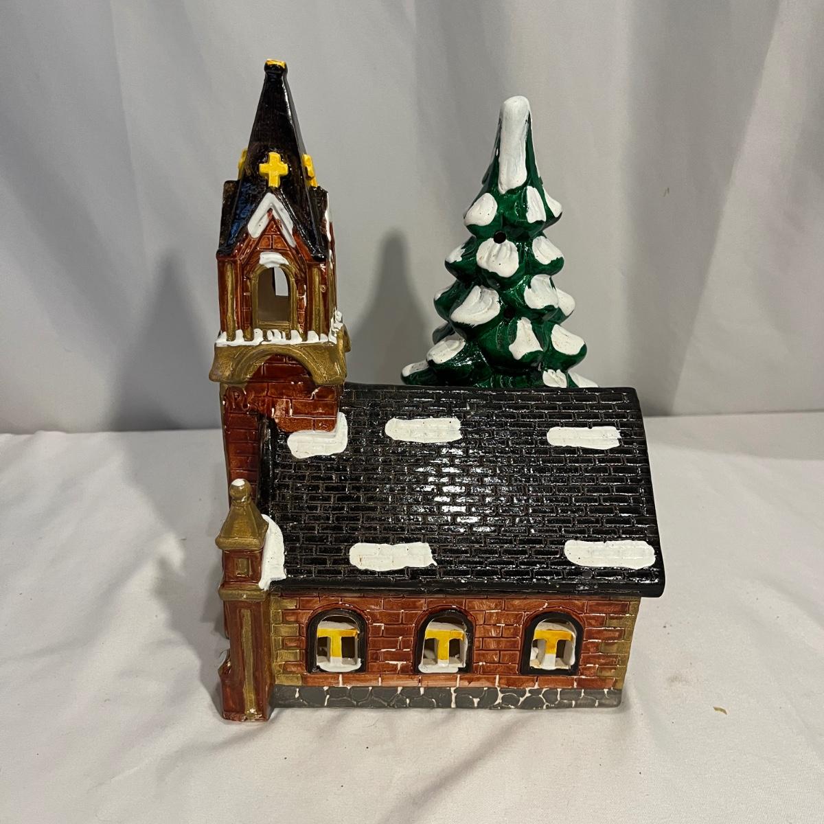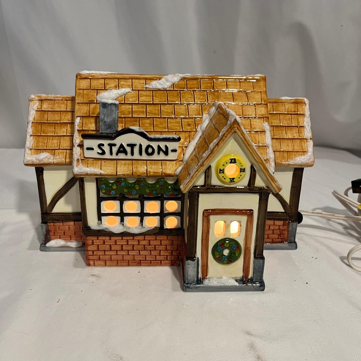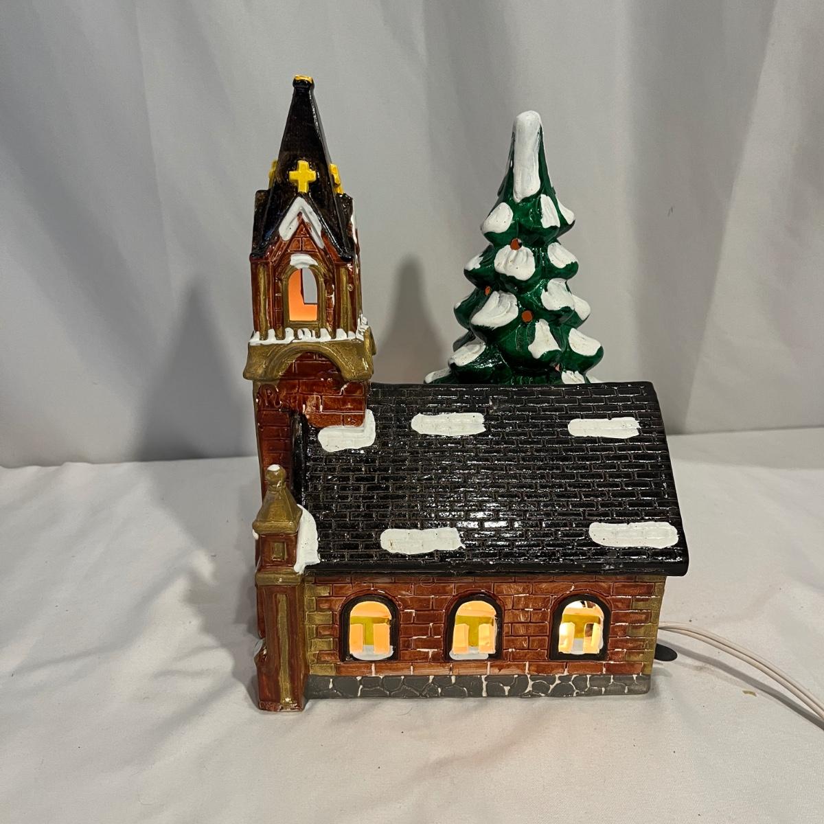 This collection of Department 56 houses includes locomotive and two cars, car, nativity piece, Gothic Church, two Pole Pine Trees, Snow Village, Grocery store, Christmas tree, Village Post Office and more. Also includes a selection of miniature trees by Department 56 and more trees. Tallest building measures 8” x 6.5” x 10”H. All lights powered on when plugged in.