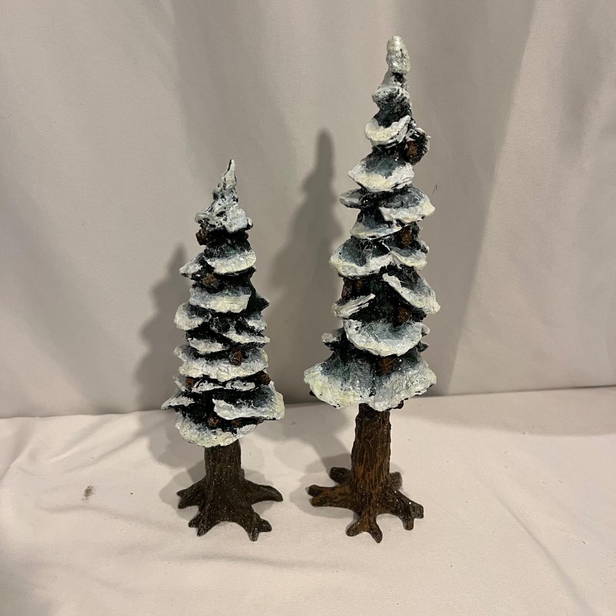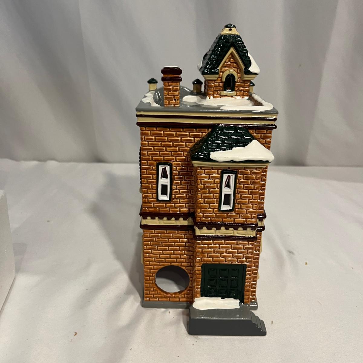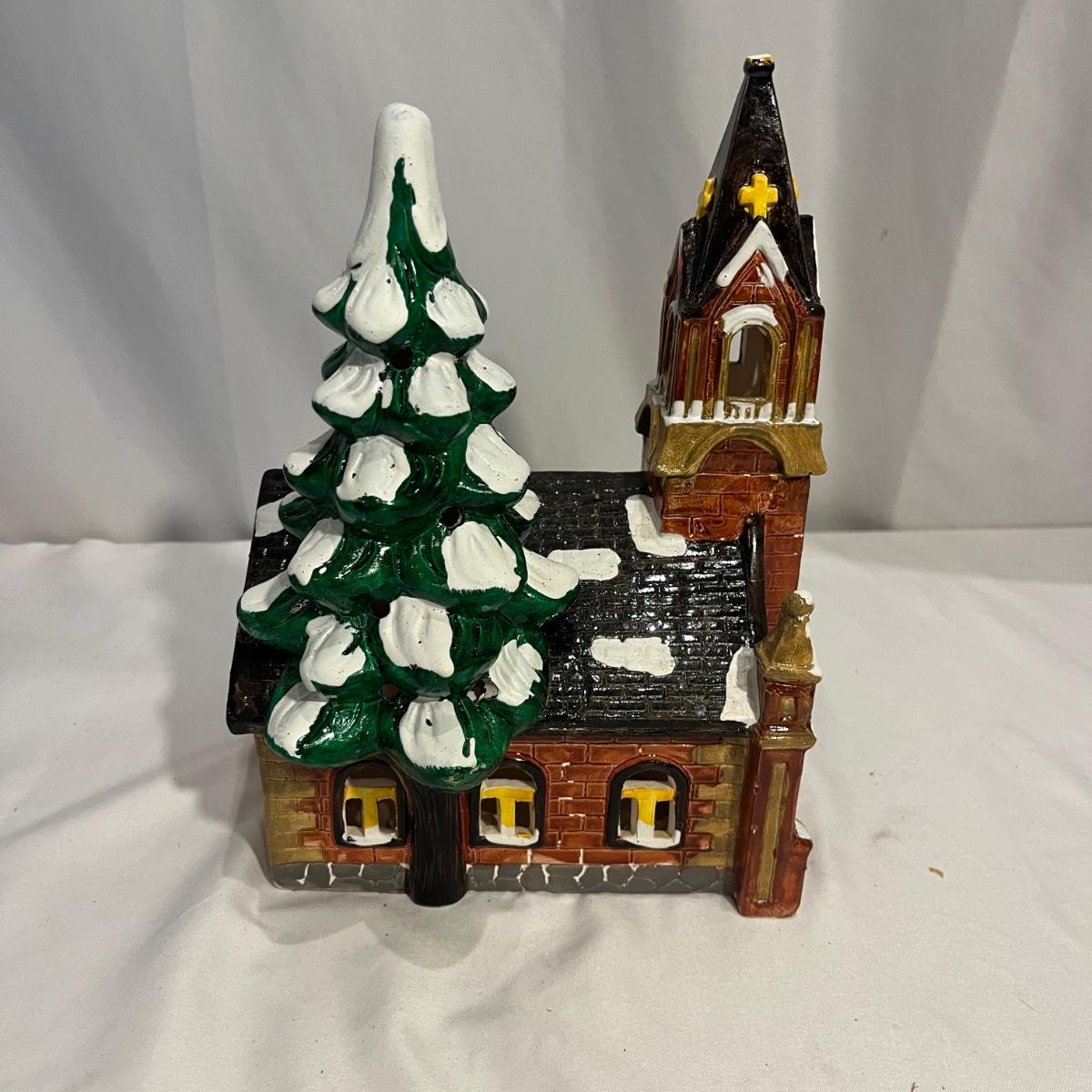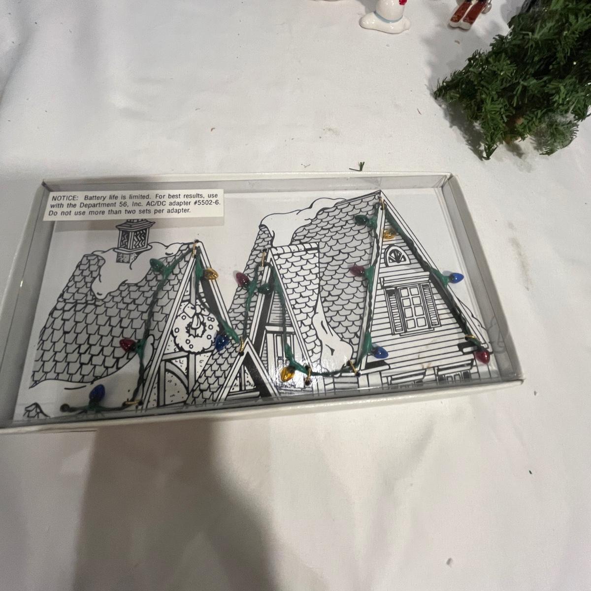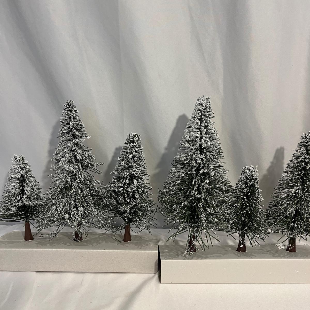 This collection of Department 56 houses includes locomotive and two cars, car, nativity piece, Gothic Church, two Pole Pine Trees, Snow Village, Grocery store, Christmas tree, Village Post Office and more. Also includes a selection of miniature trees by Department 56 and more trees. Tallest building measures 8” x 6.5” x 10”H. All lights powered on when plugged in.
