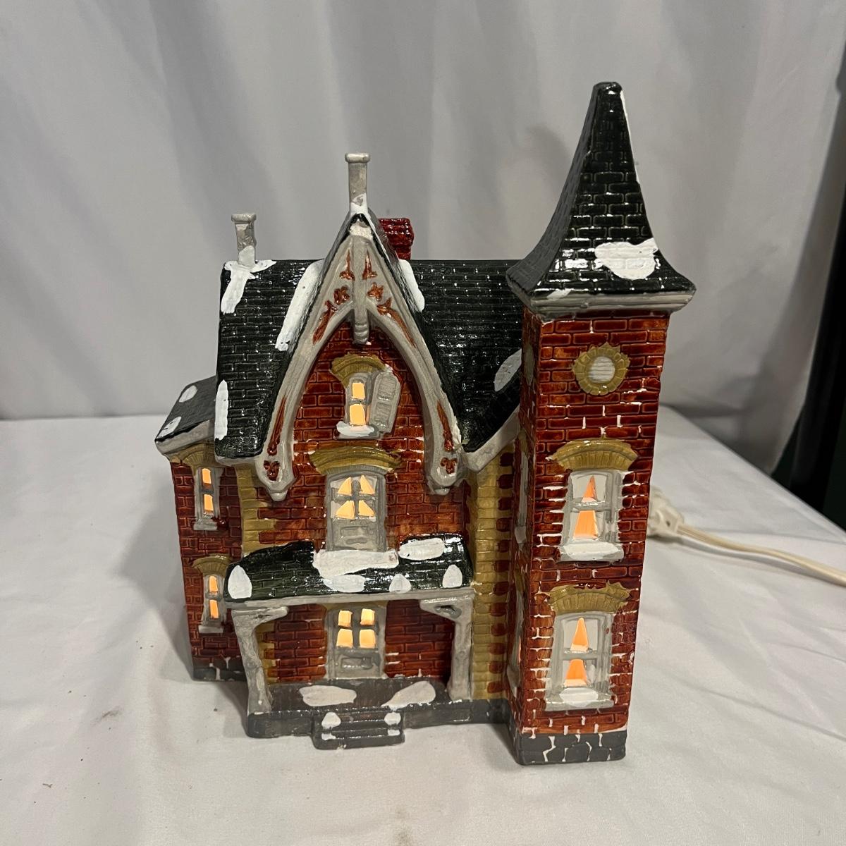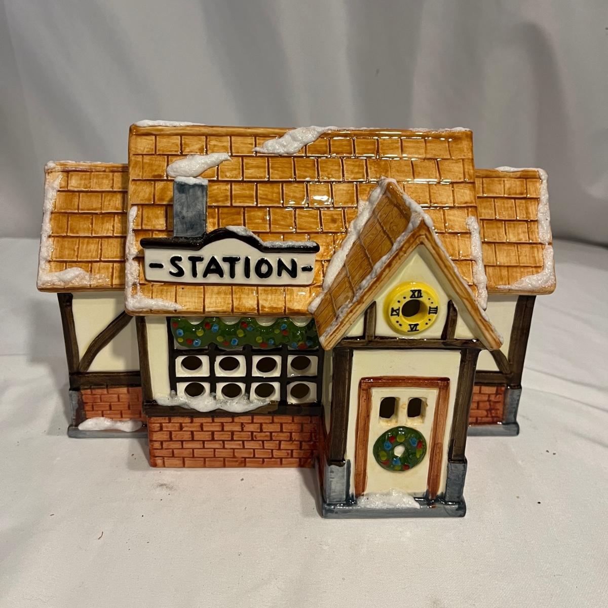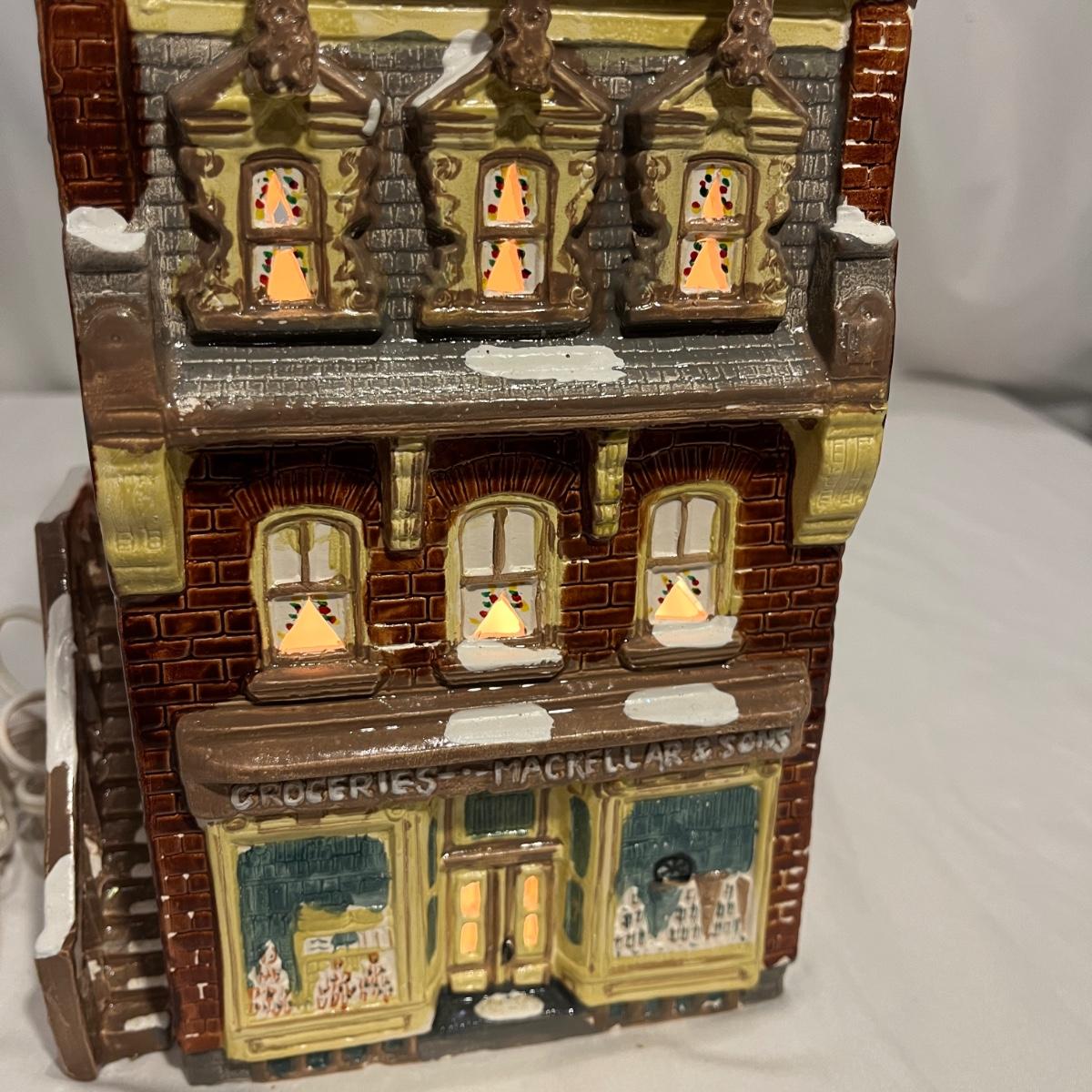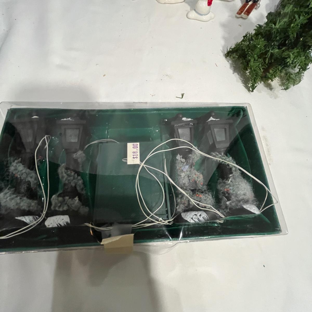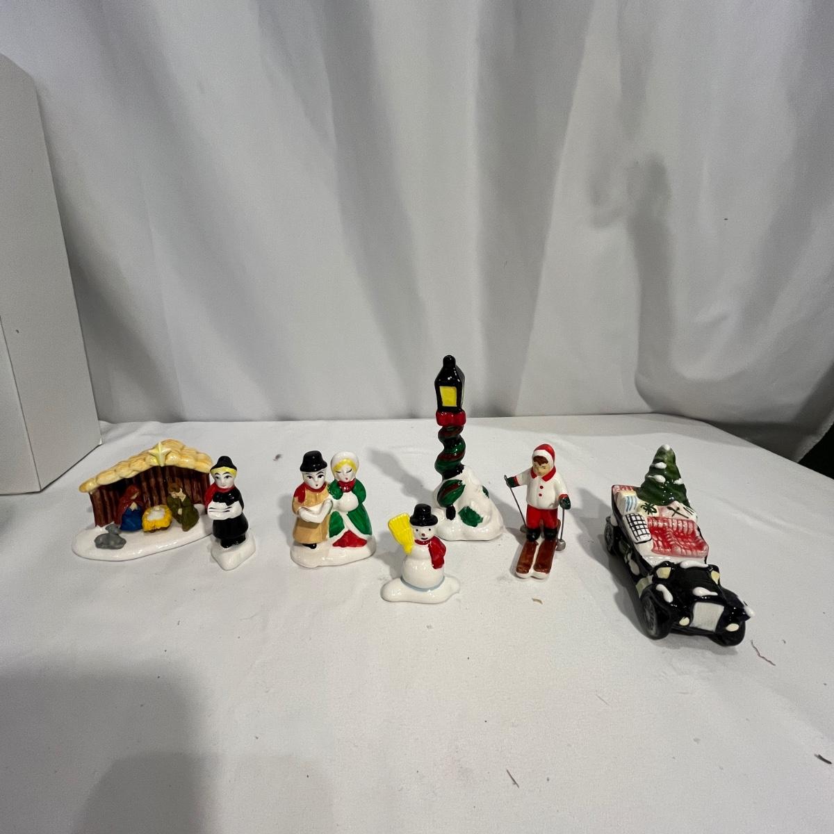 This collection of Department 56 houses includes locomotive and two cars, car, nativity piece, Gothic Church, two Pole Pine Trees, Snow Village, Grocery store, Christmas tree, Village Post Office and more. Also includes a selection of miniature trees by Department 56 and more trees. Tallest building measures 8” x 6.5” x 10”H. All lights powered on when plugged in.