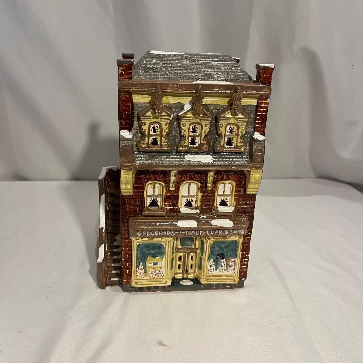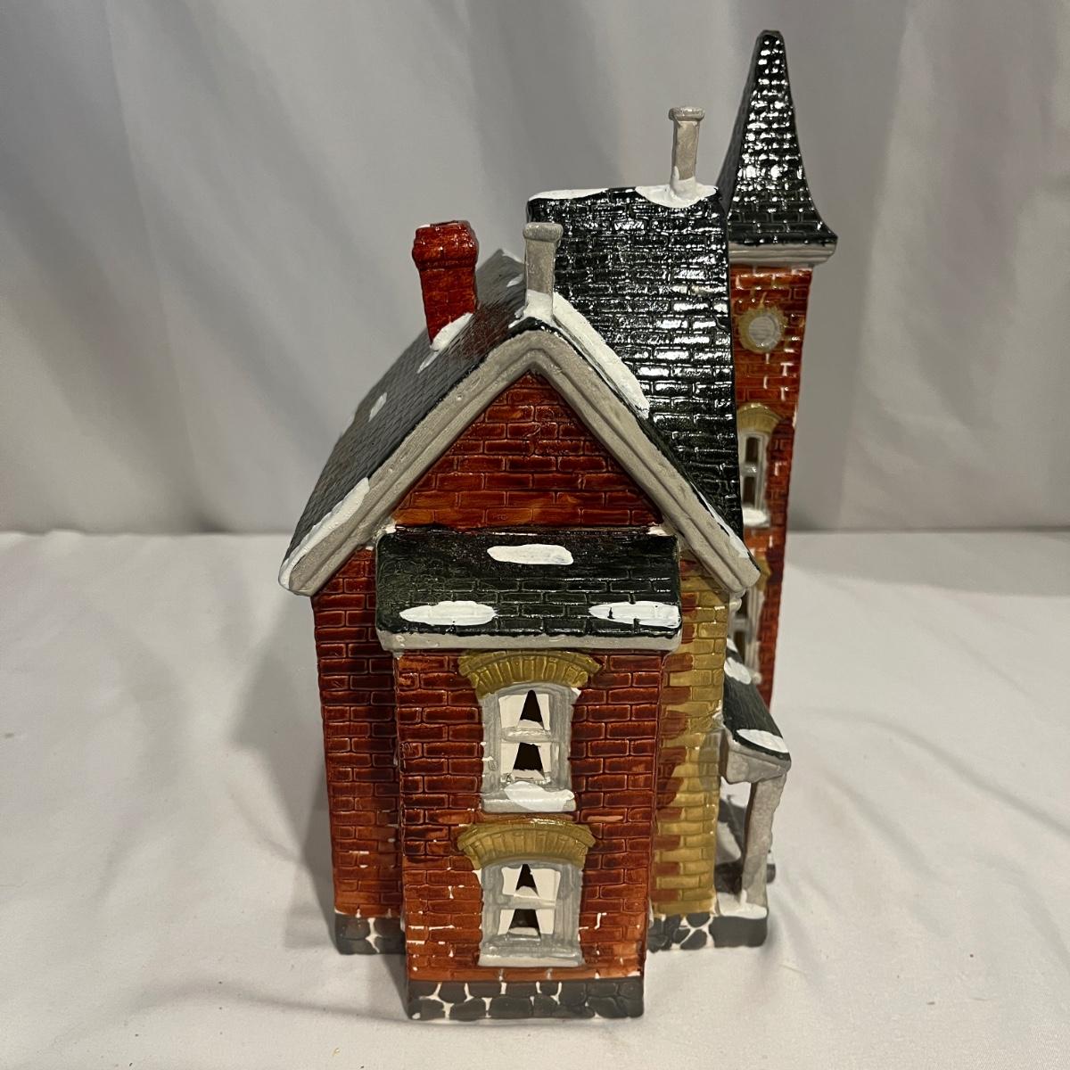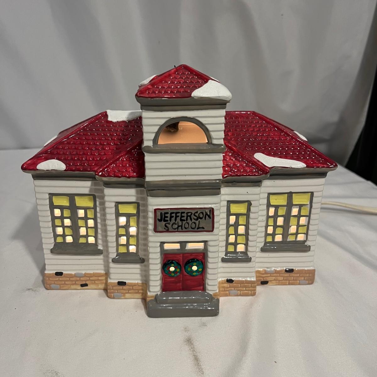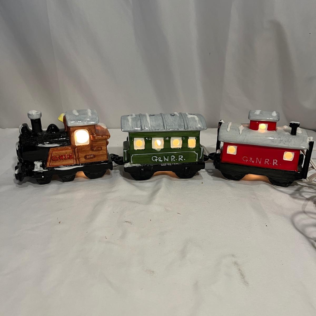 This collection of Department 56 houses includes locomotive and two cars, car, nativity piece, Gothic Church, two Pole Pine Trees, Snow Village, Grocery store, Christmas tree, Village Post Office and more. Also includes a selection of miniature trees by Department 56 and more trees. Tallest building measures 8” x 6.5” x 10”H. All lights powered on when plugged in.