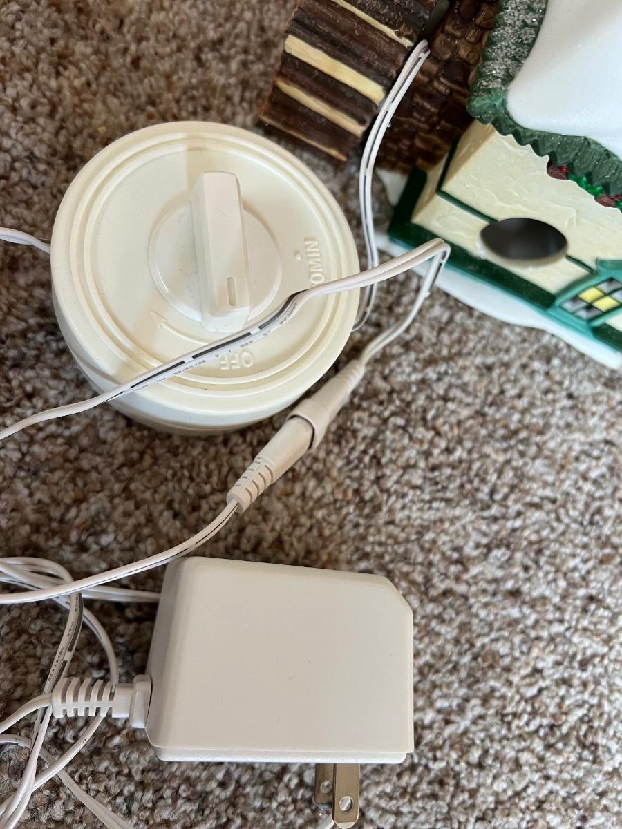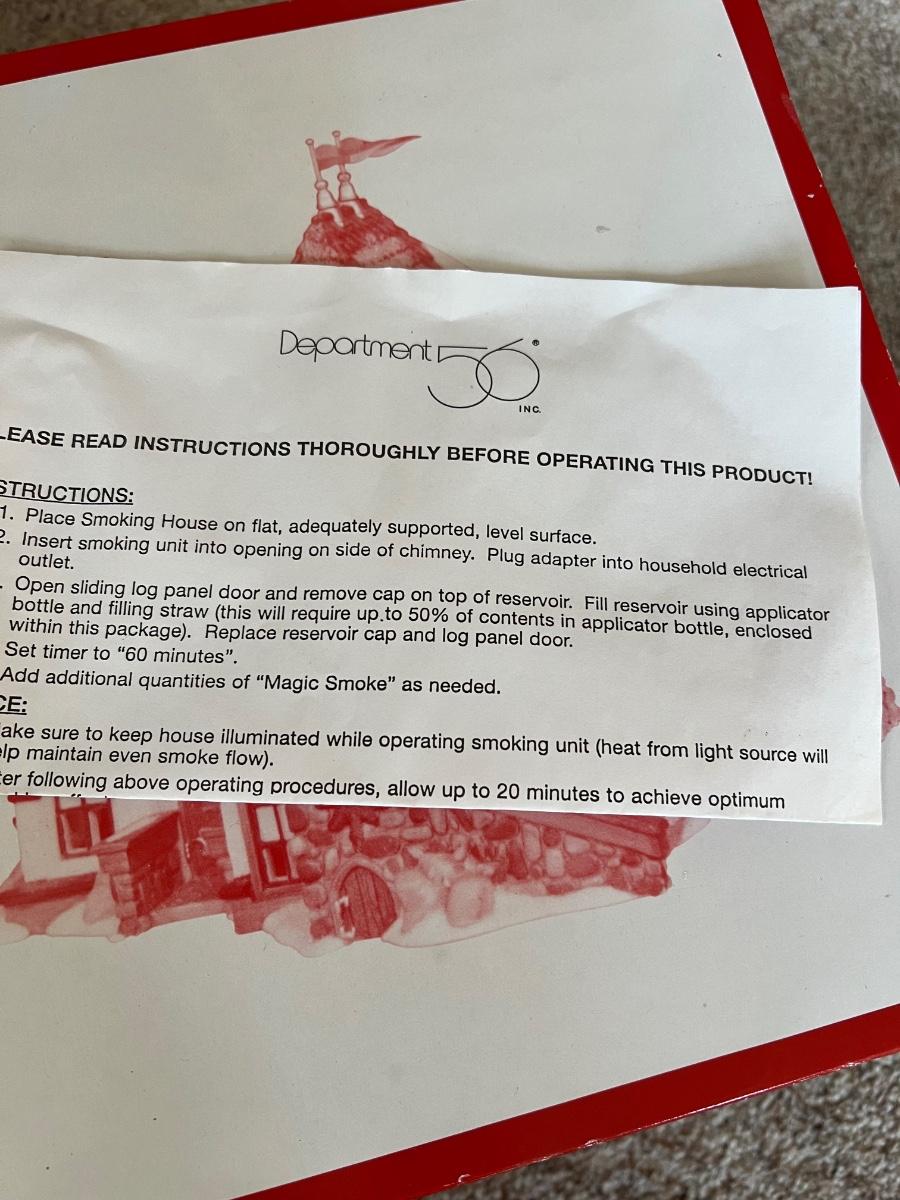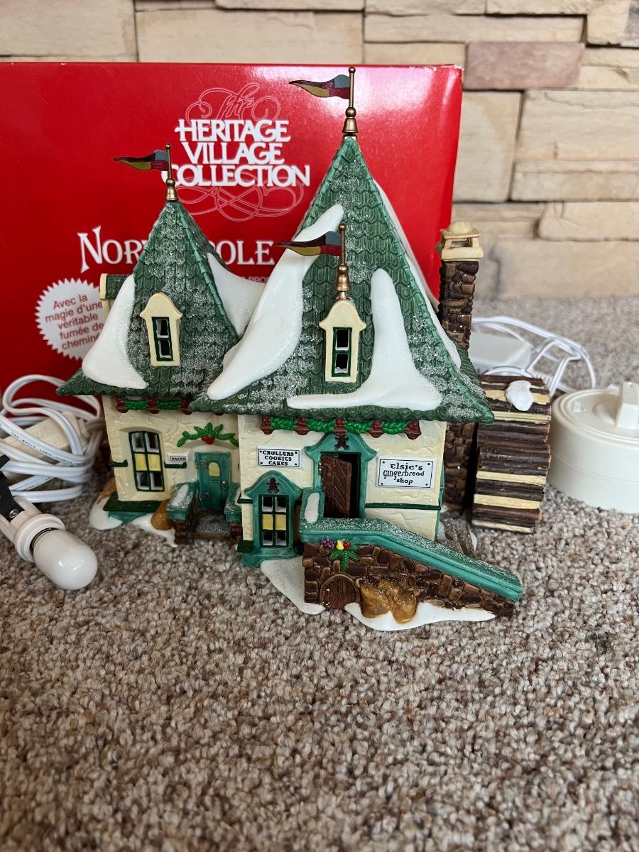 Elsie’s Gingerbread house is a delightful Santa’s North Pole Series village lighted porcelain sculpture from Department 56. Produced in 1998 as a limited edition piece. House lights and chimney smokes. Nite that liquid to create smoke is missing and one flag on top of building.