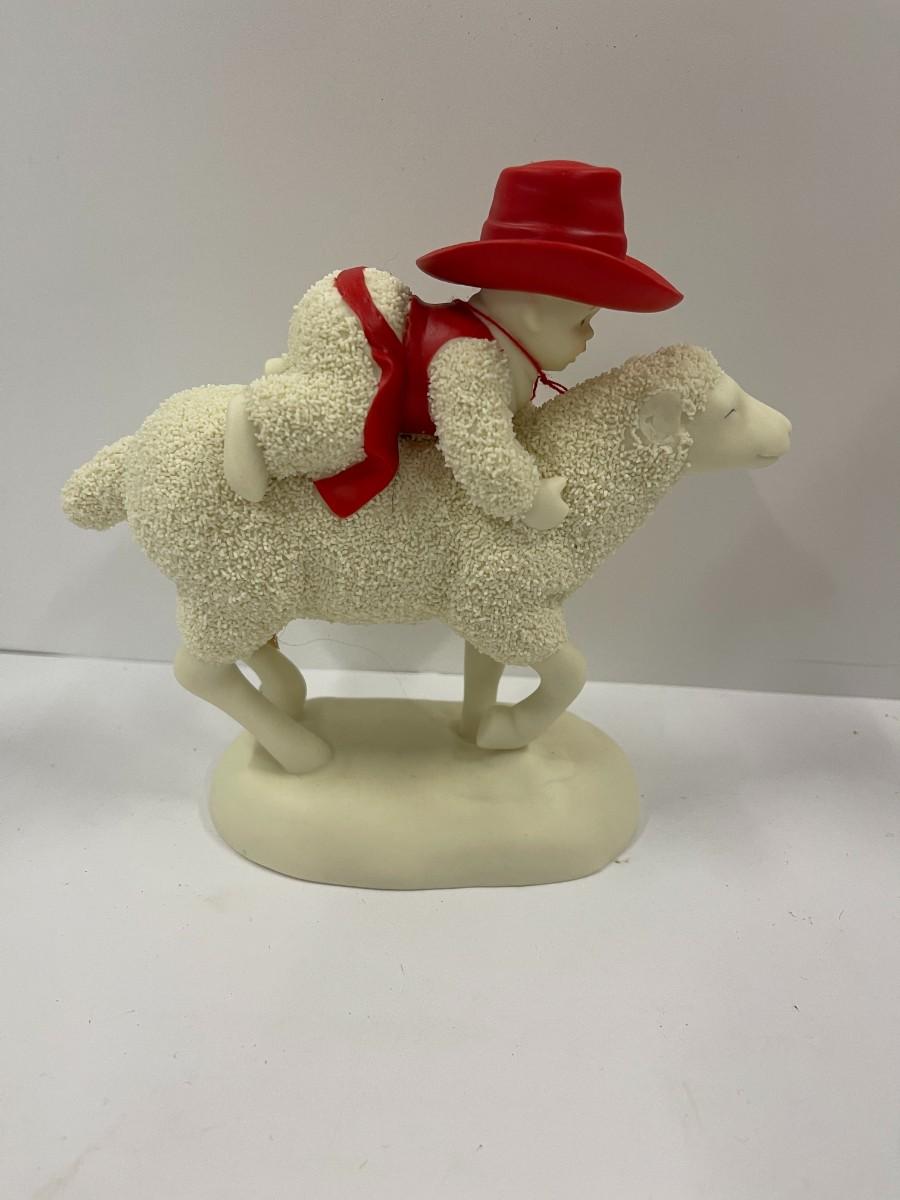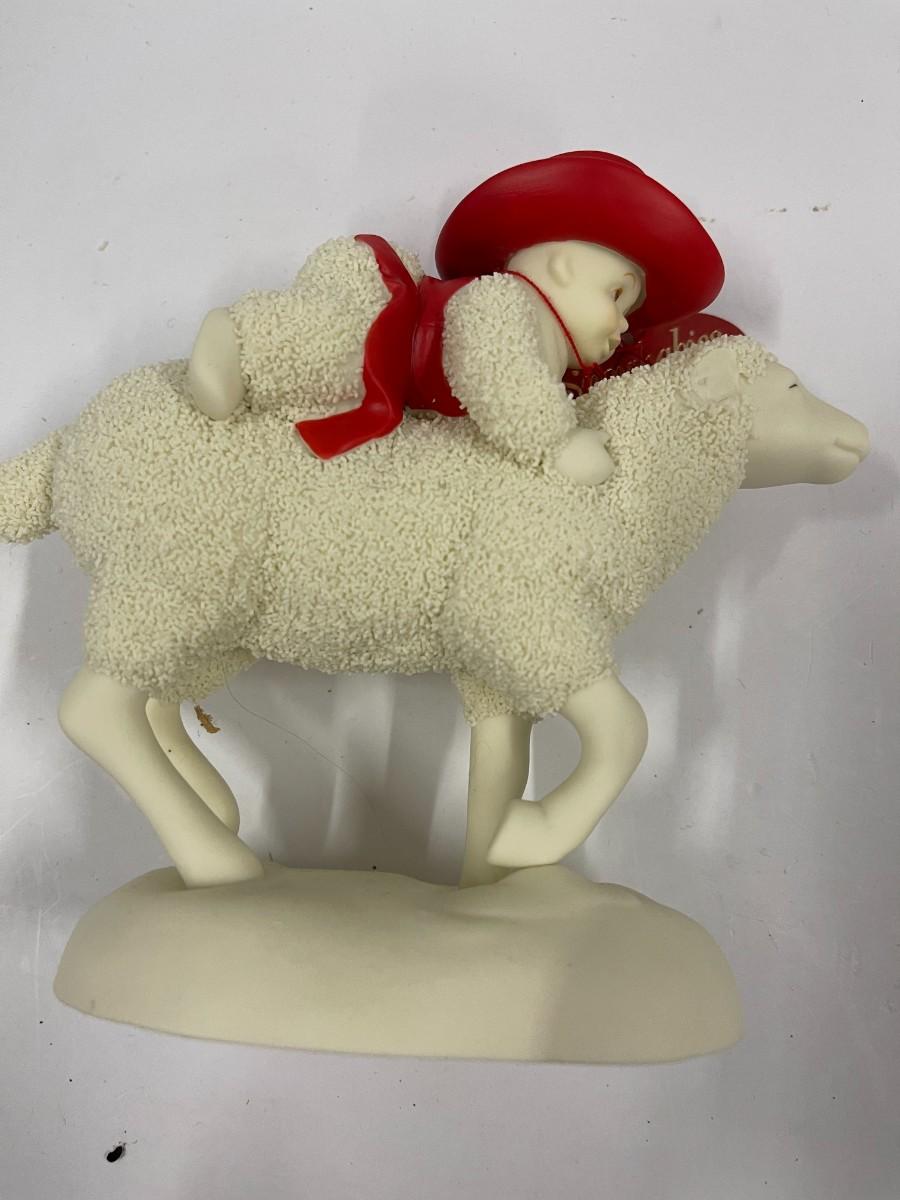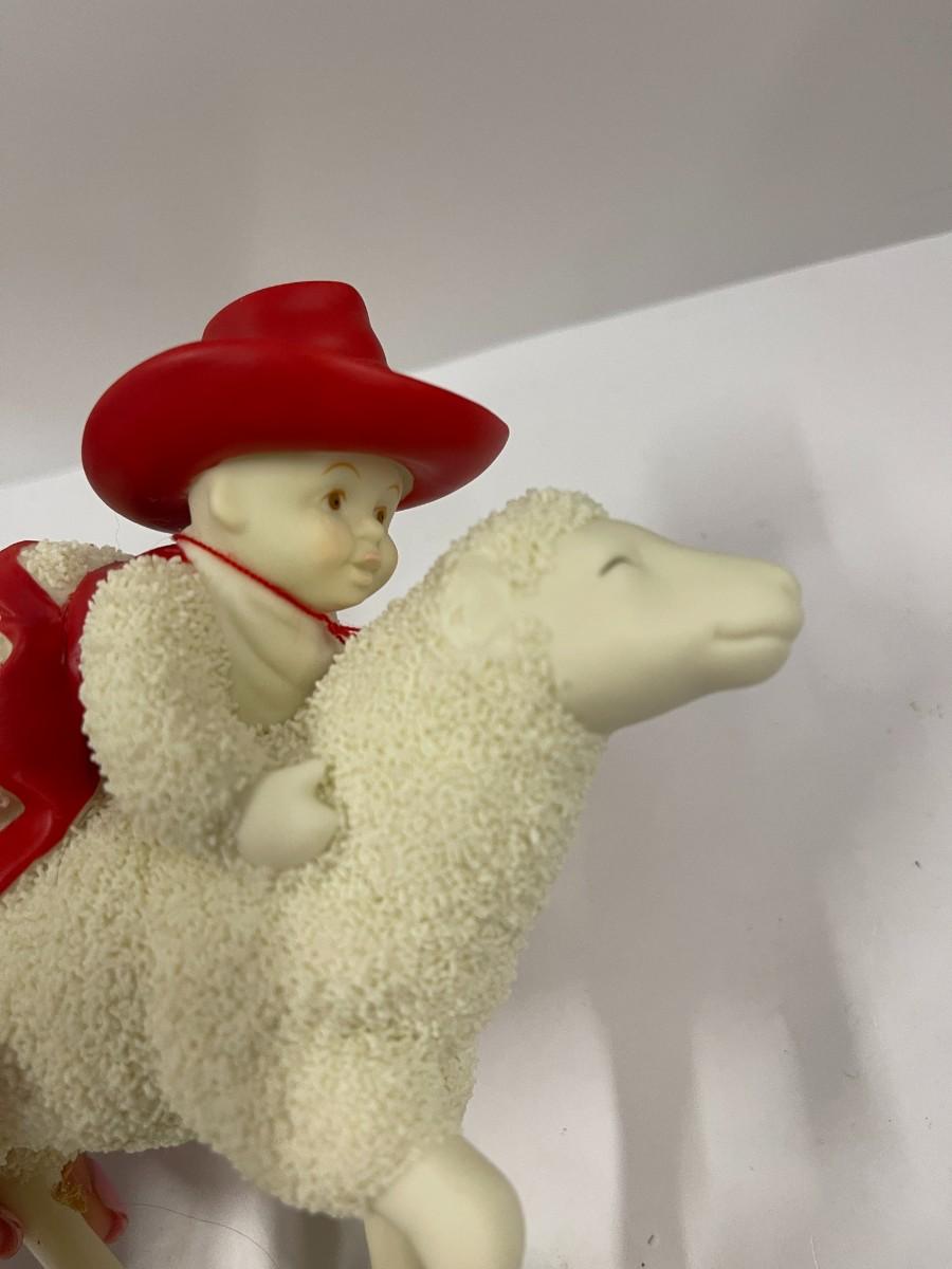Department 56 Snow Babies Ride 'em Cowboy features a snow baby riding a sheep. Excellent condition with original tag but no box. 6" wide x 5 1/2" high. # 1324
