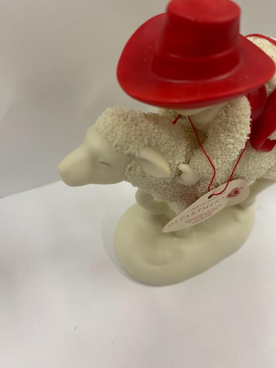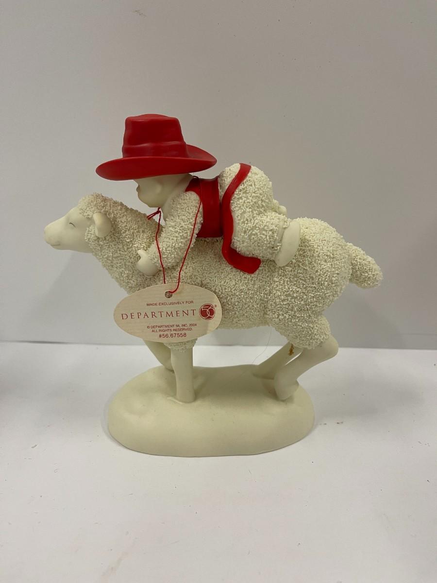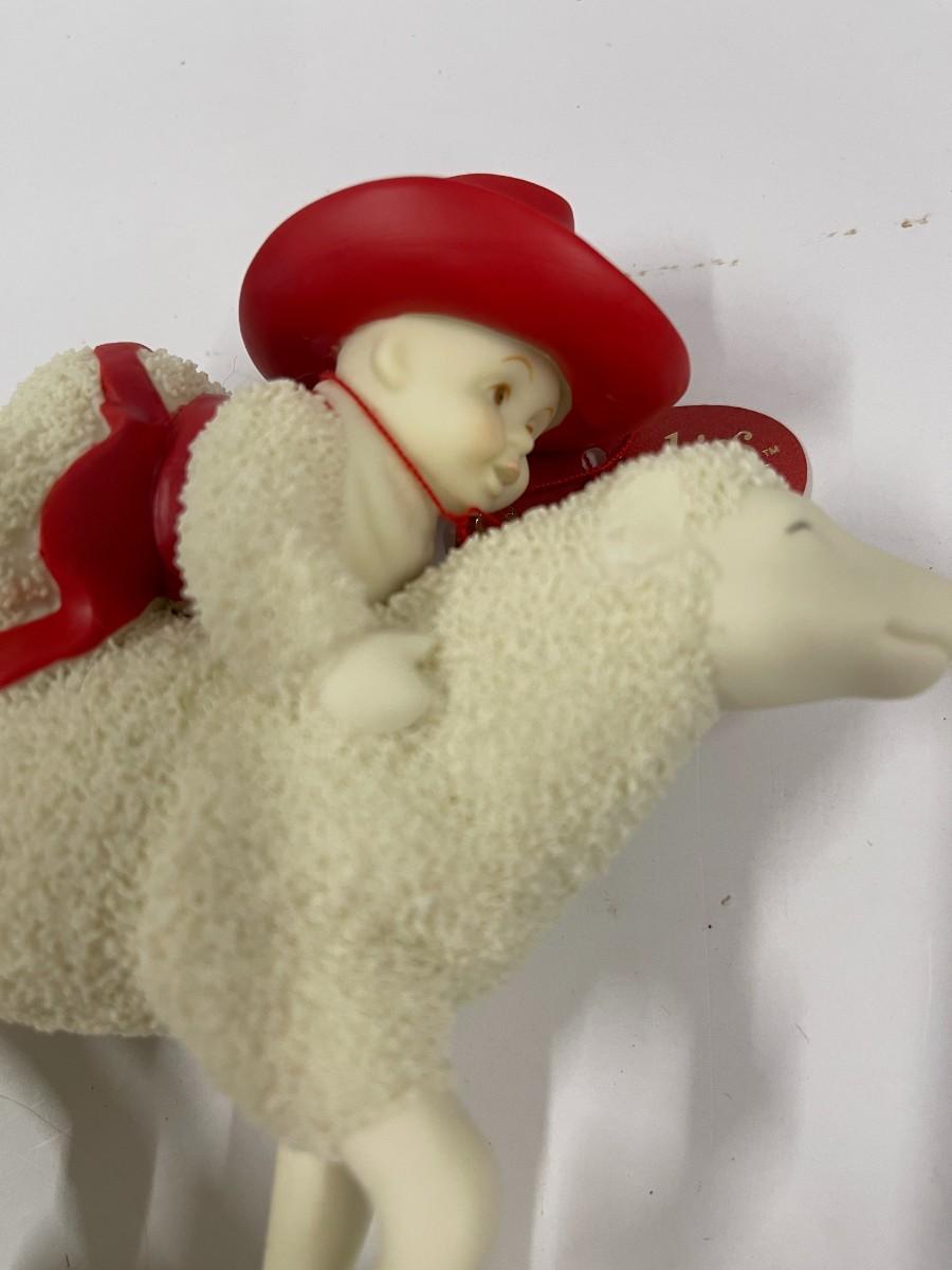 Department 56 Snow Babies Ride 'em Cowboy features a snow baby riding a sheep. Excellent condition with original tag but no box. 6" wide x 5 1/2" high. # 1324
