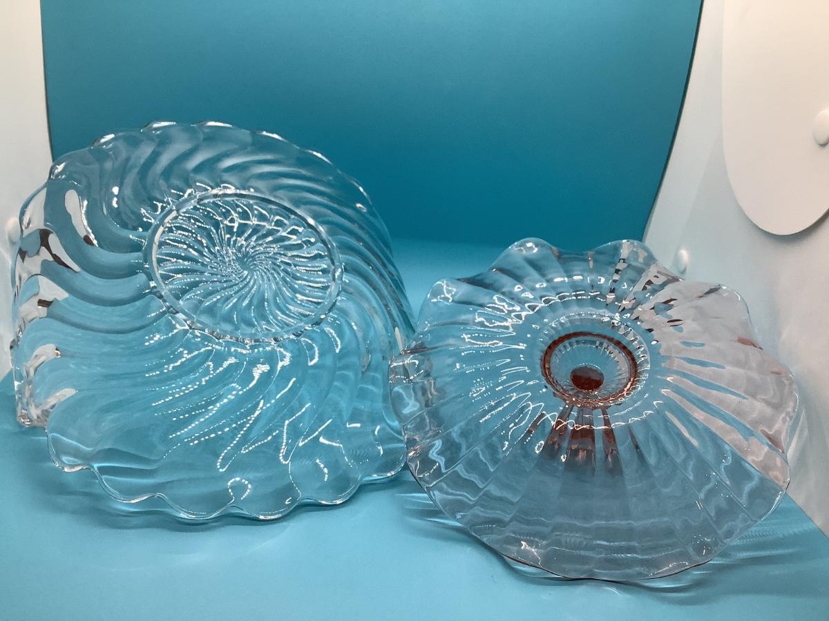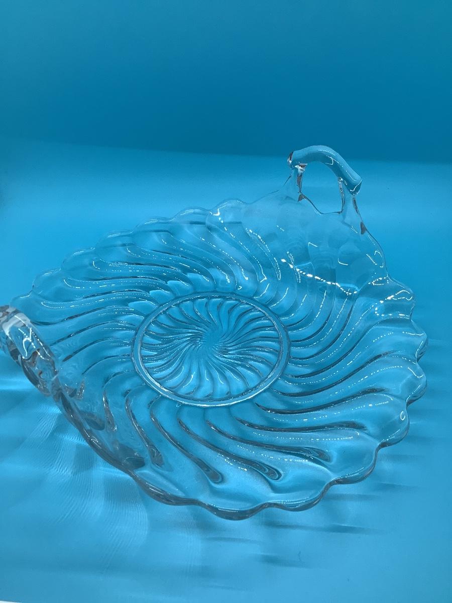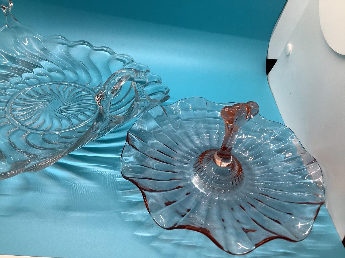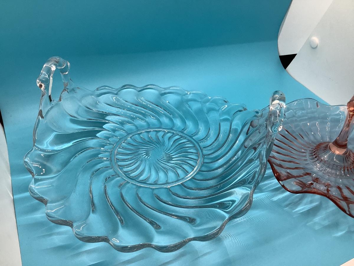Pink Depression glass candy dish and Fostoria Colony Pattern Swirl, curved handled clear glass