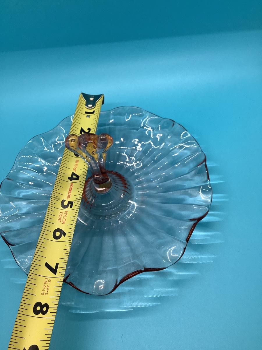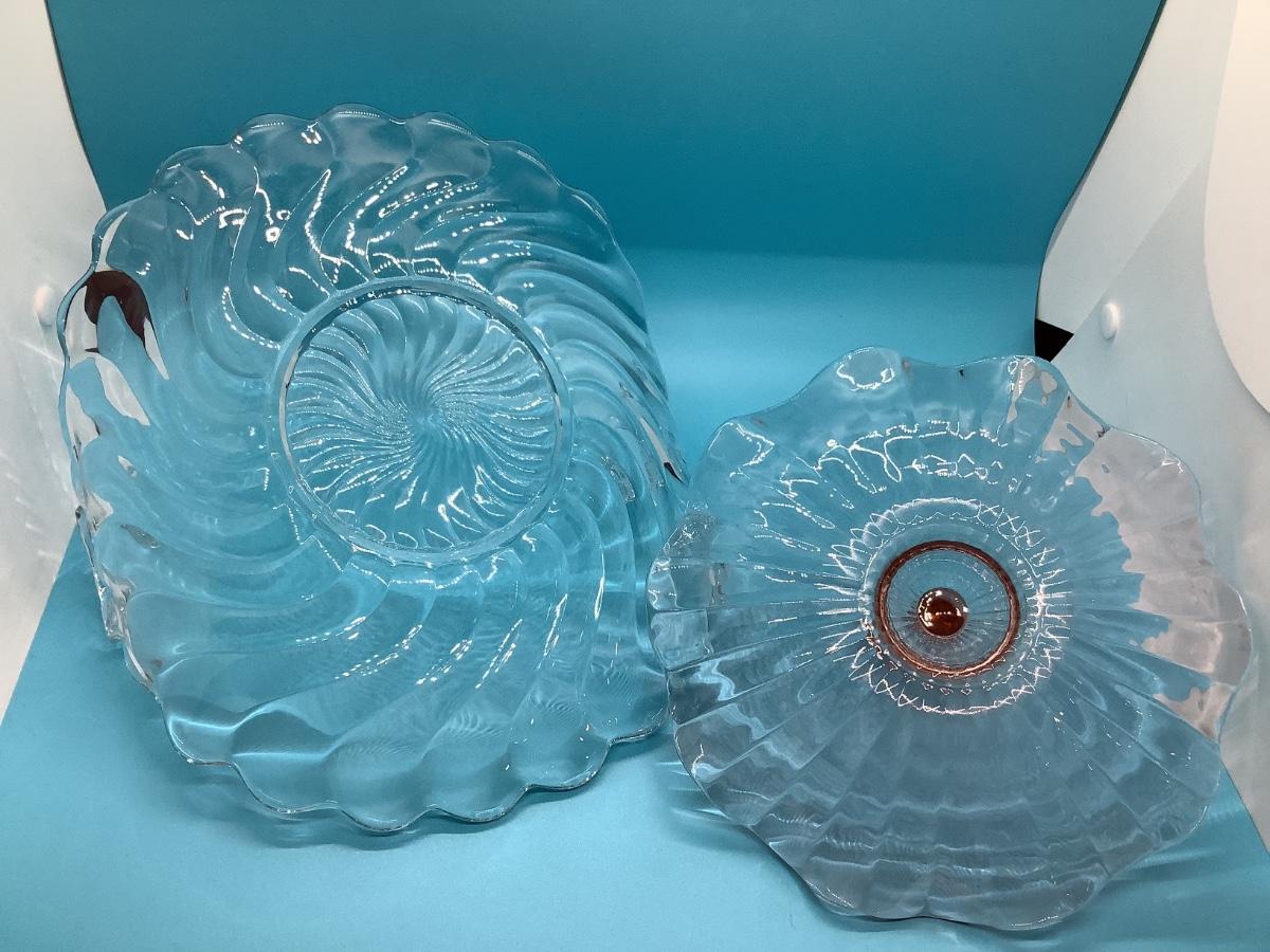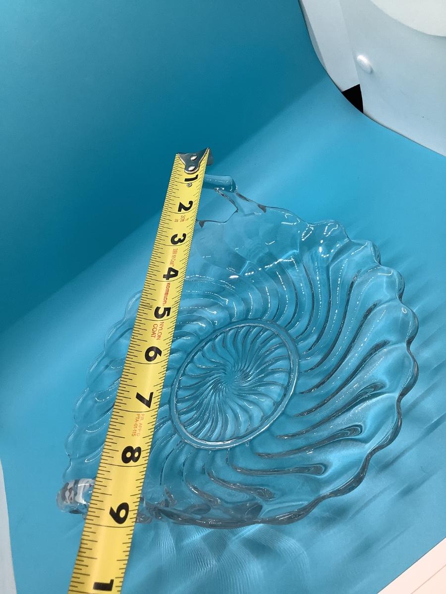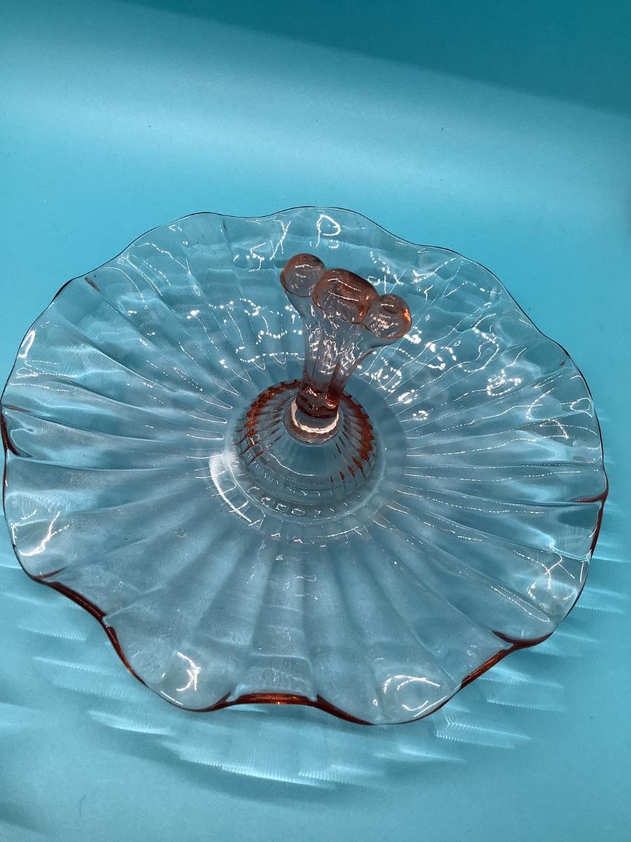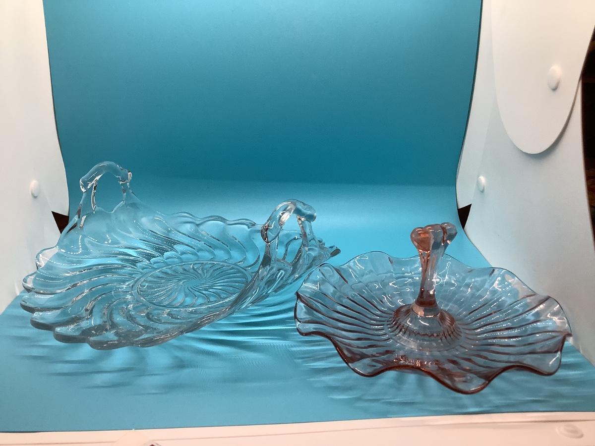 Pink Depression glass candy dish and Fostoria Colony Pattern Swirl, curved handled clear glass