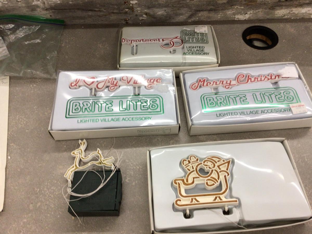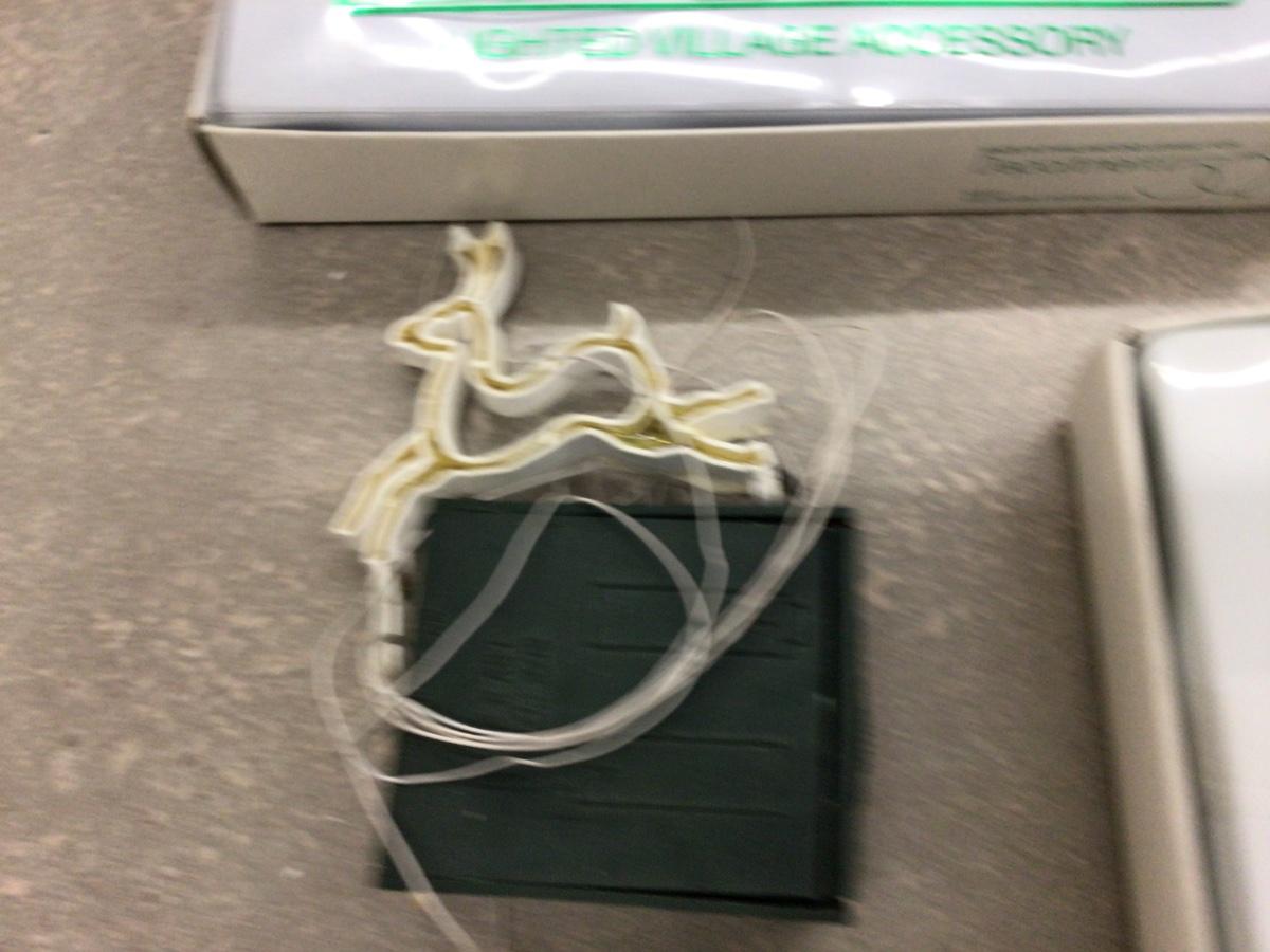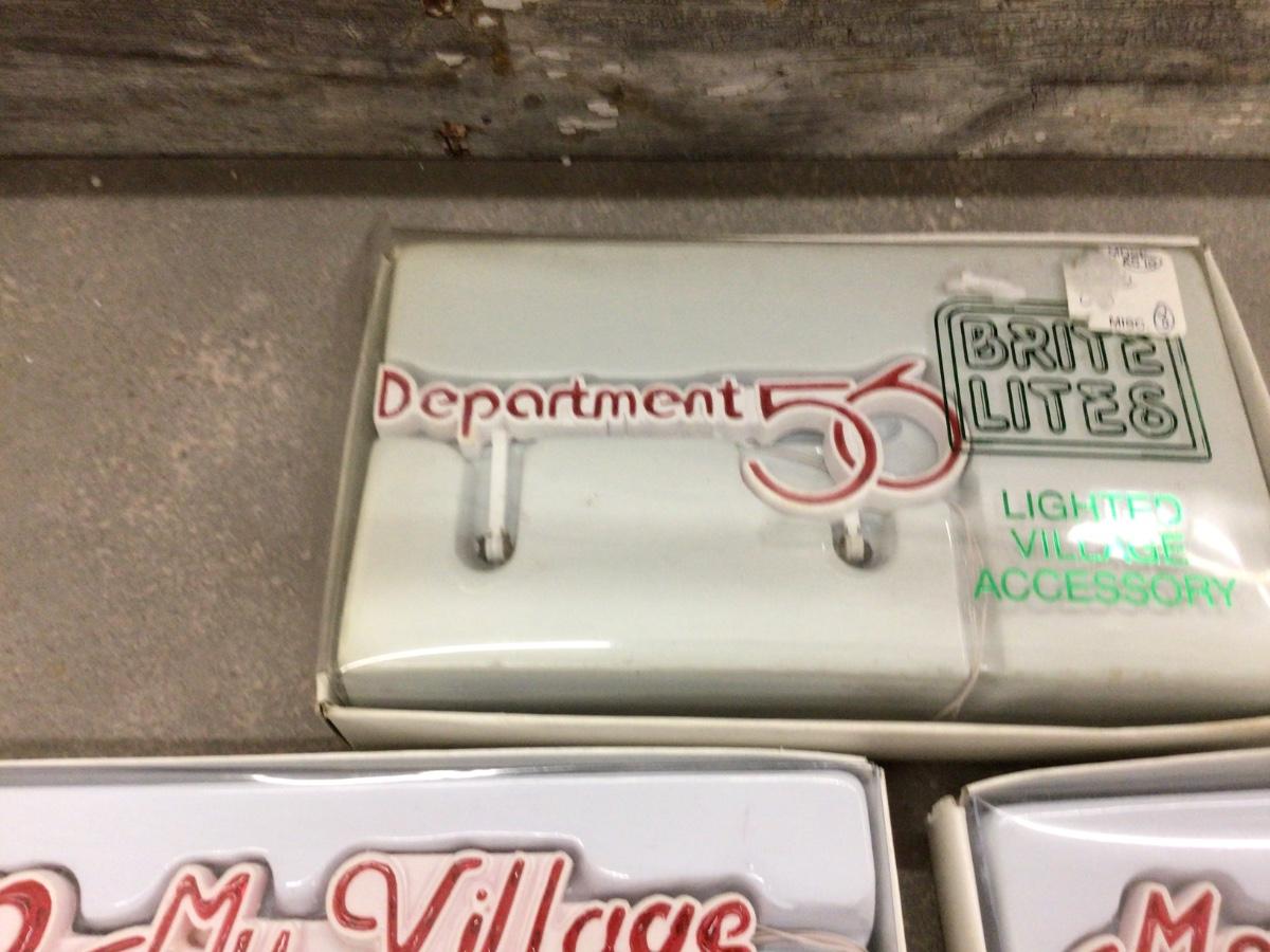 You get Tree Dept. 56 Sings, Department 56, I Love My Village, and Merry Christmas all in boxes, Reindeer with no box, and Santa