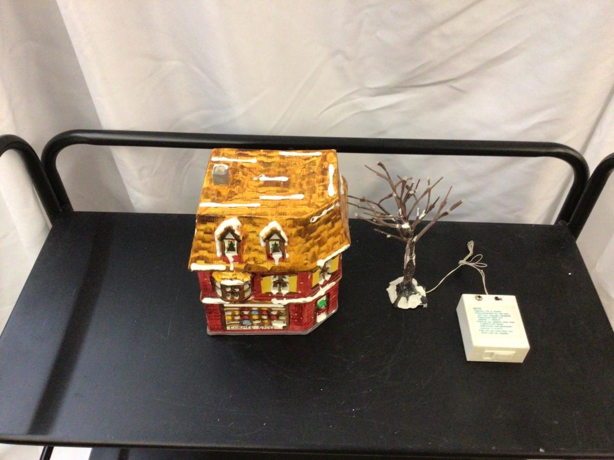 You get this great Dept 56 Corner store 1982 no box but does come with a light. Also you get a lighted tree with this lot.
