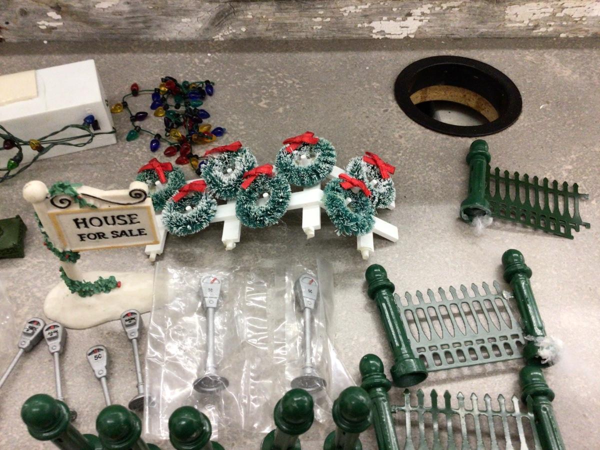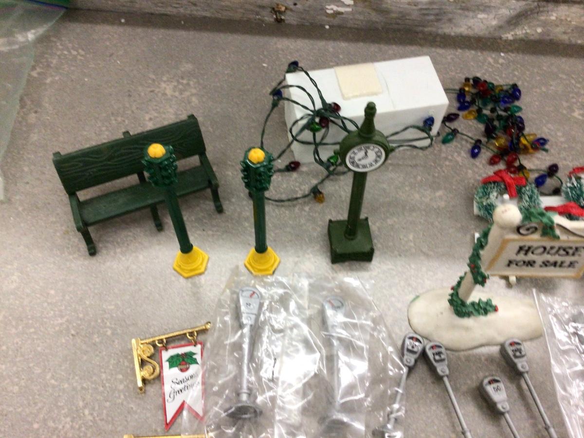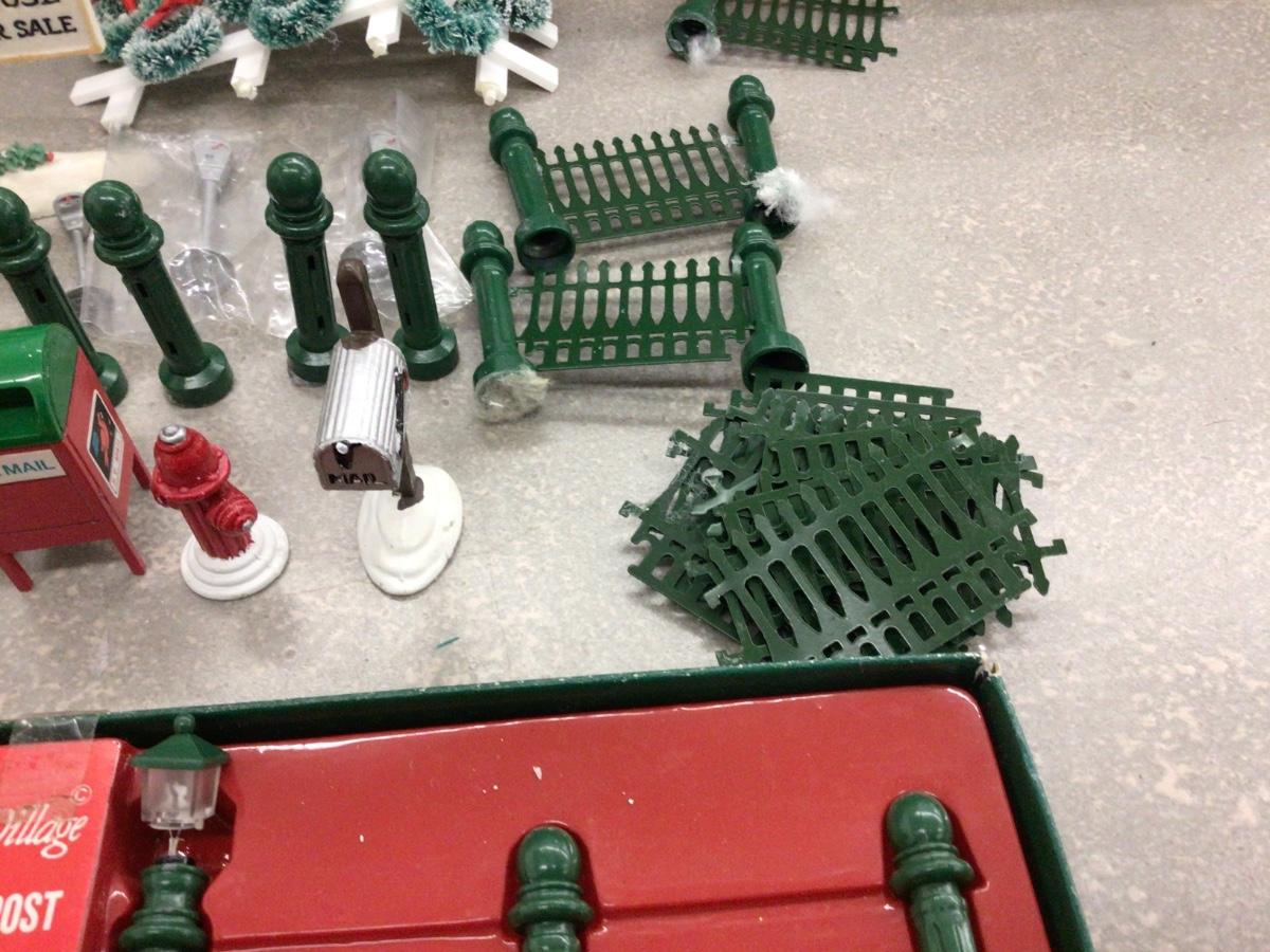 You get Dept. 56 fencing, posts, signs, wreathes, lights, clock,mail box, flags, birds fire hydrant, parking meters bench, and more.