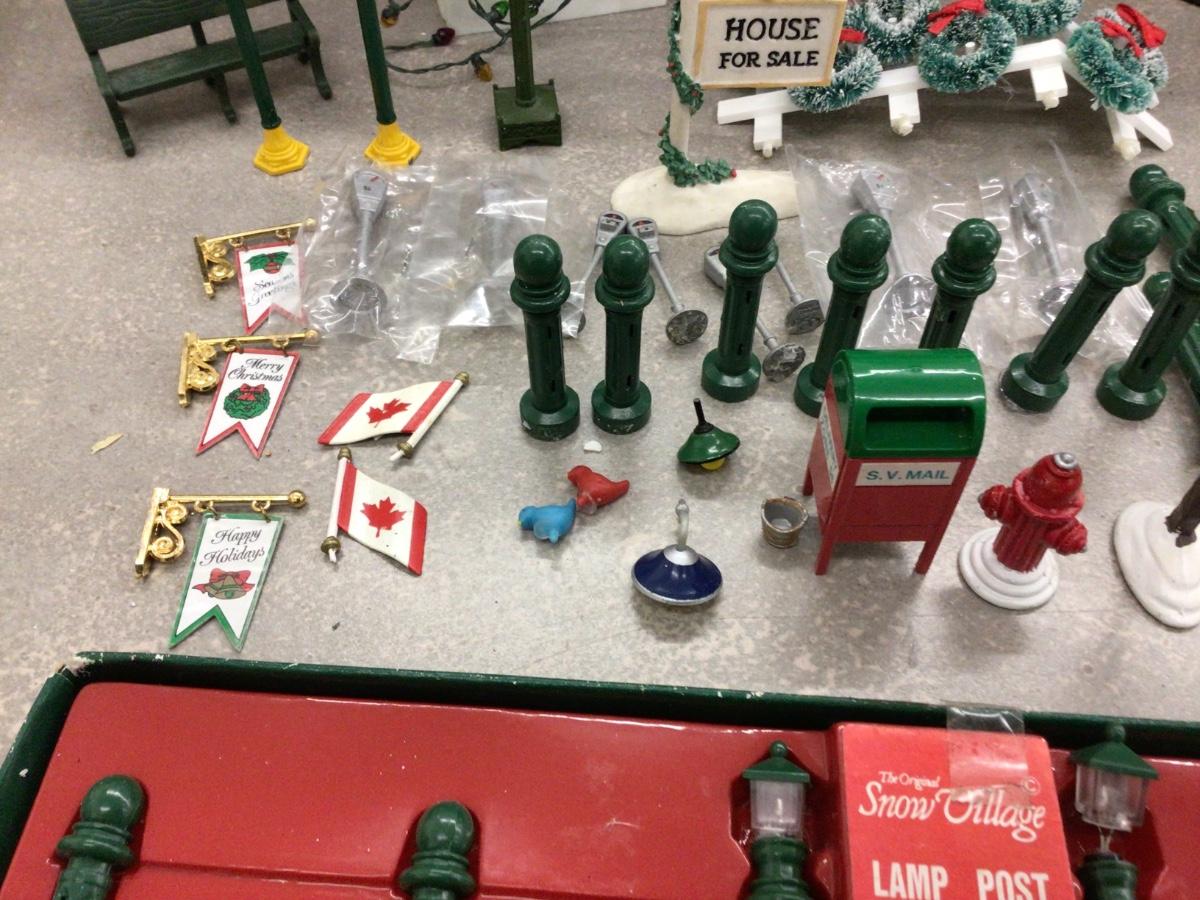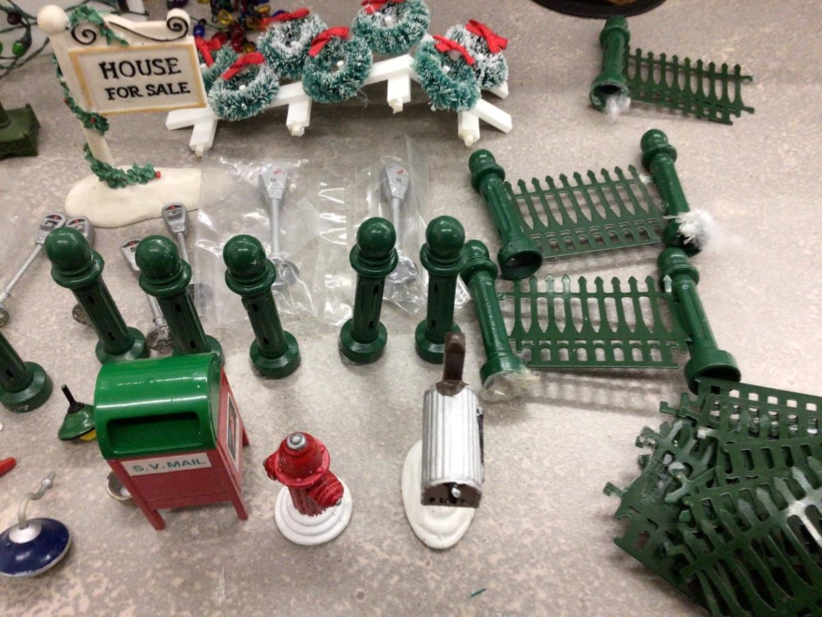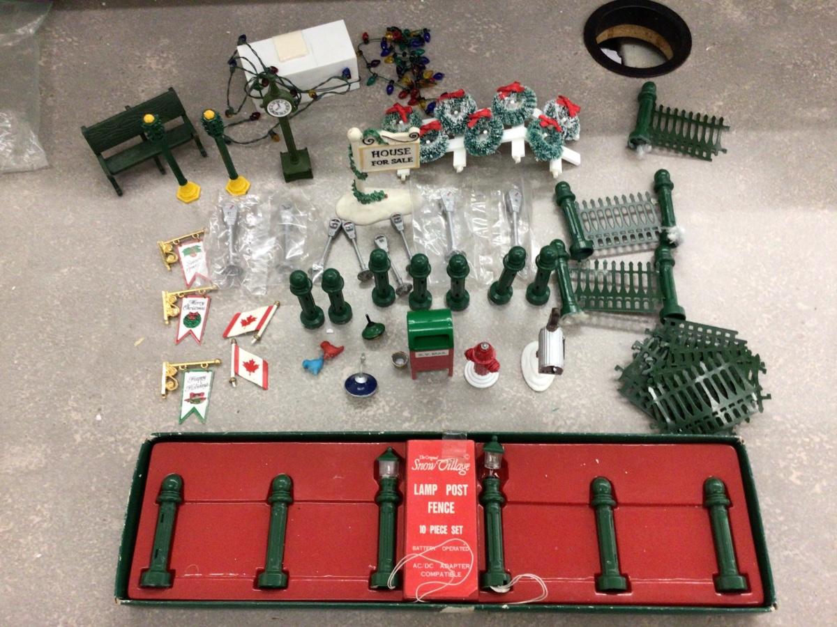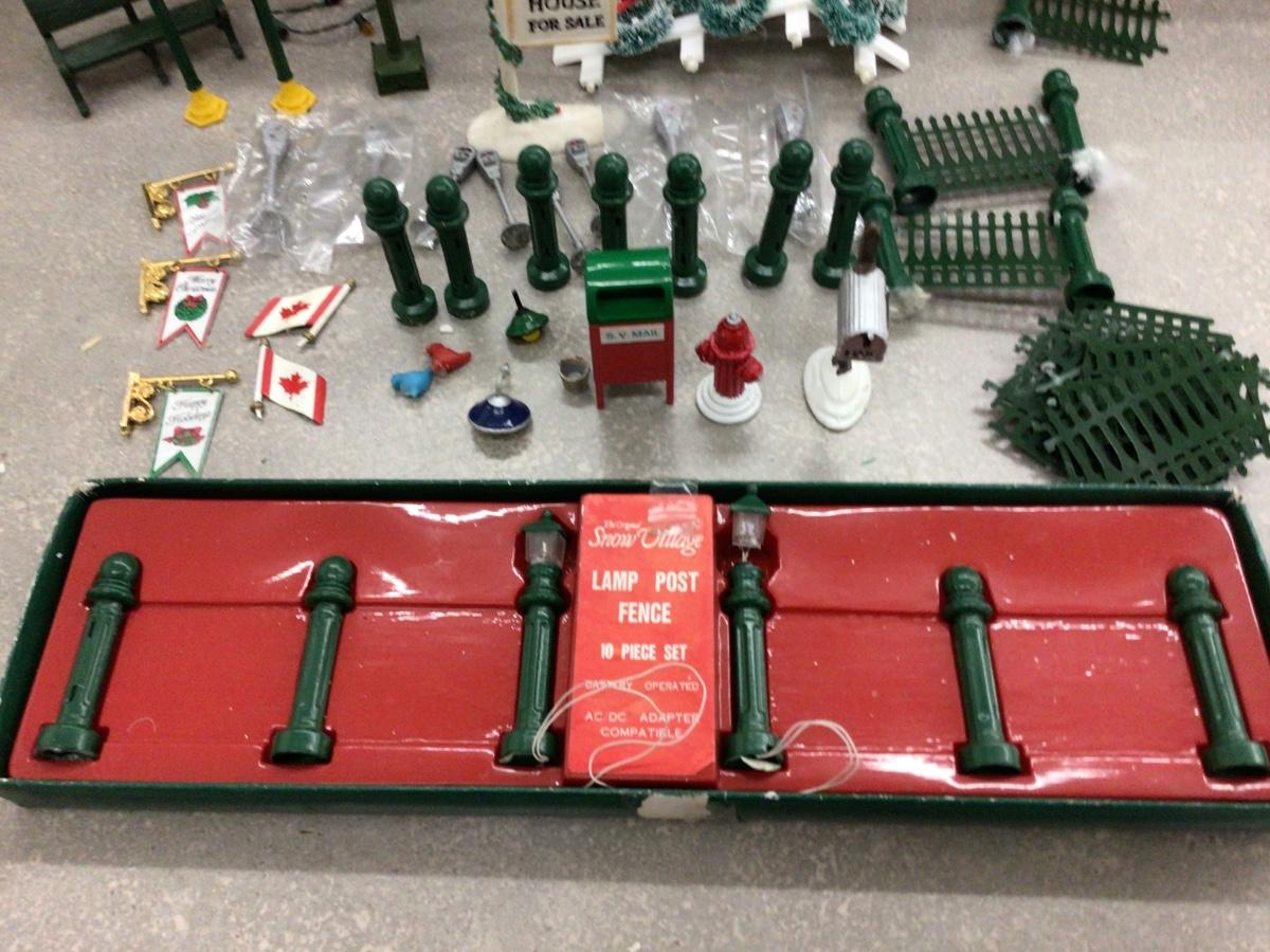 You get Dept. 56 fencing, posts, signs, wreathes, lights, clock,mail box, flags, birds fire hydrant, parking meters bench, and more.