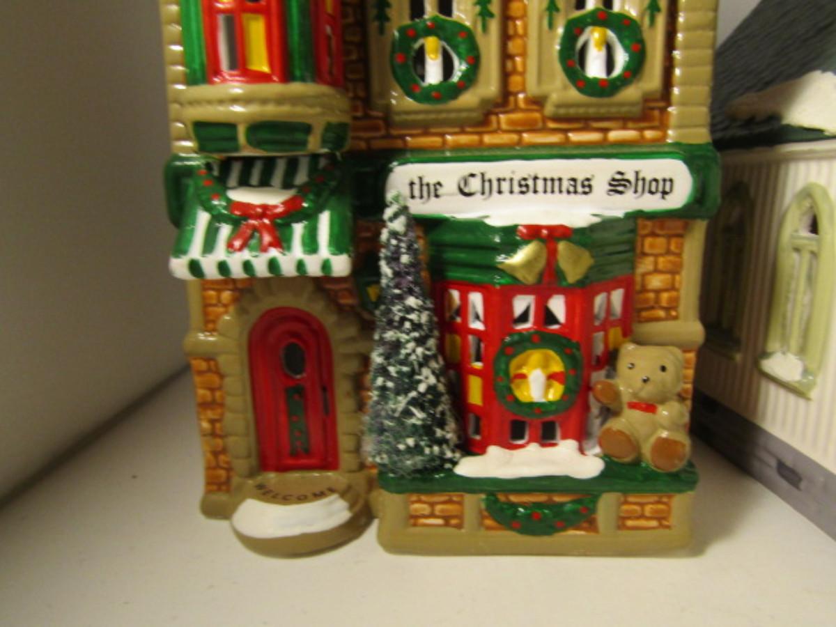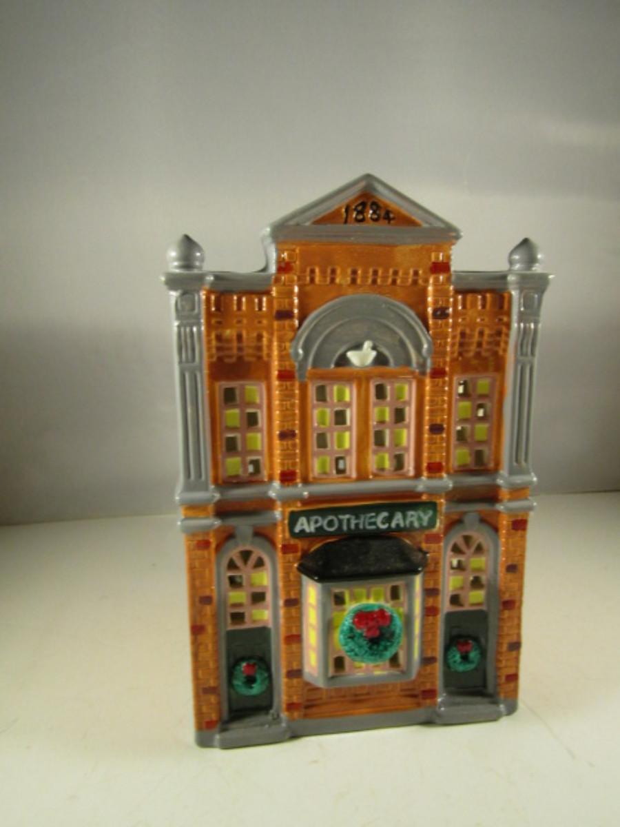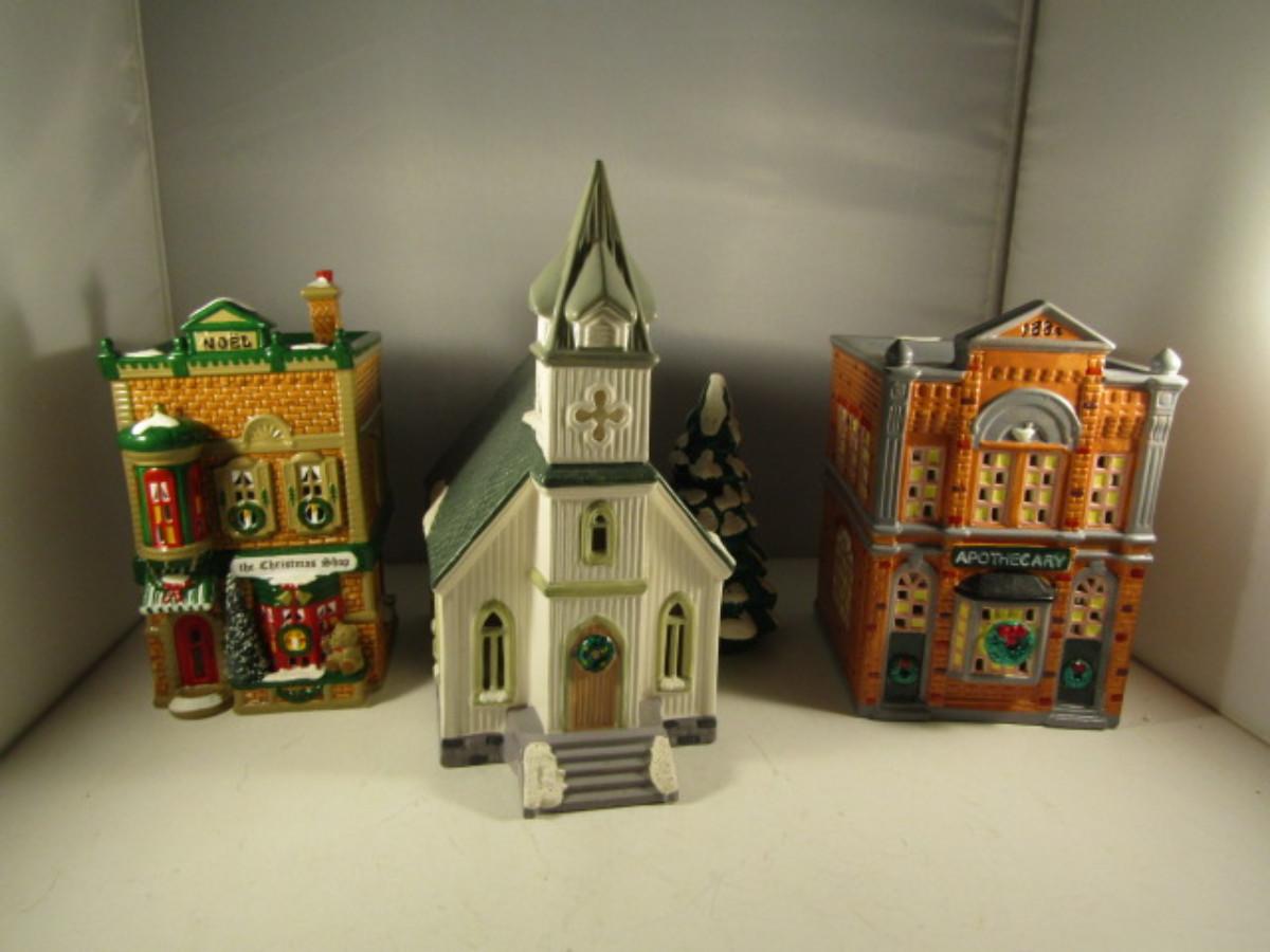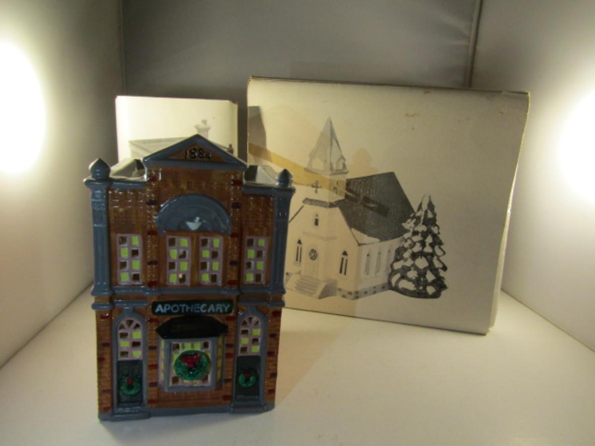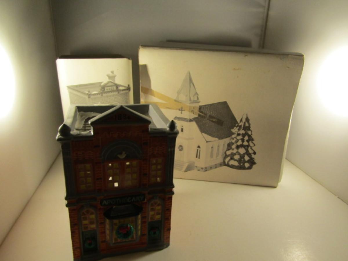 Dept. 56 Holiday Decor (#8). This listing includes: The Christmas Shop, All Saints, and the Apothecary. There is no cord or box for Apothecary. There is no cord for All Saints.