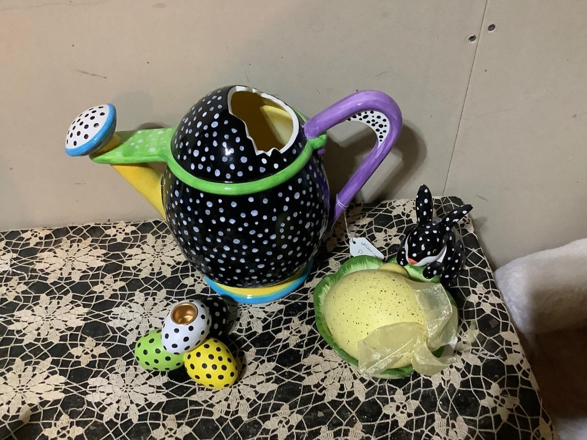 Dept 56 Large Tea Pot, Bunny Tray With Easter Eggs and Three Egg Candle Holder