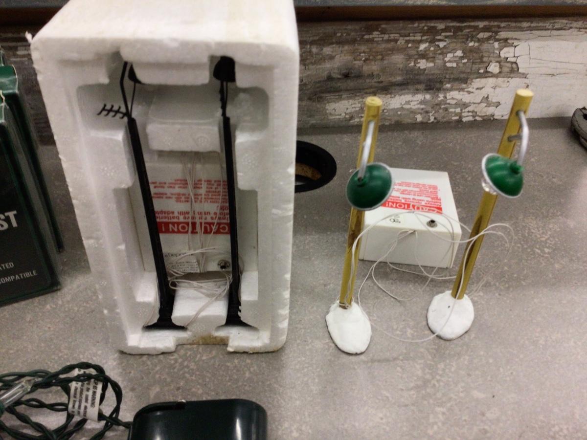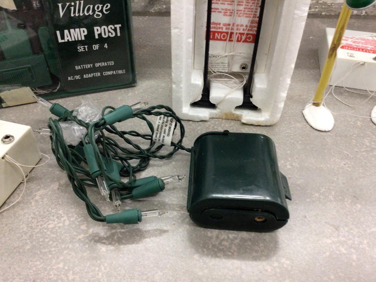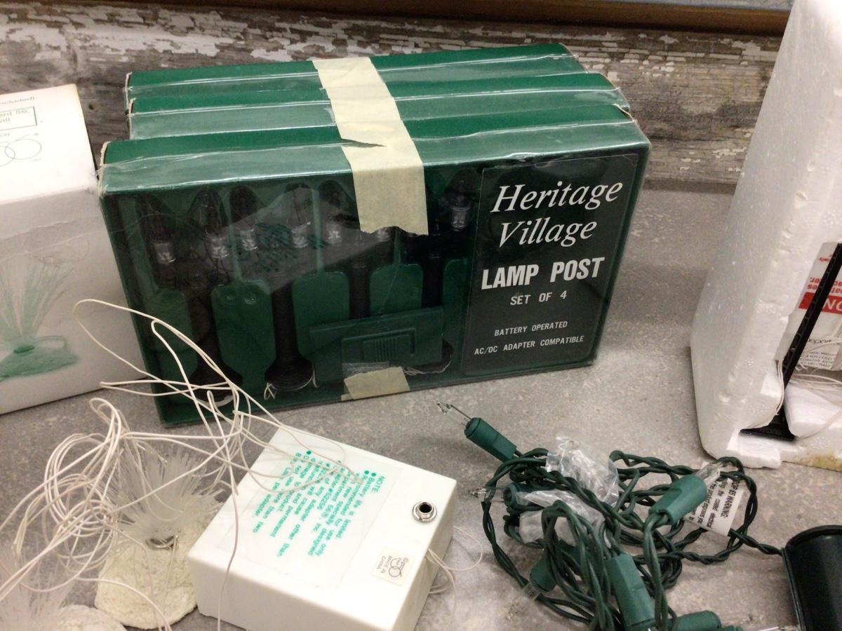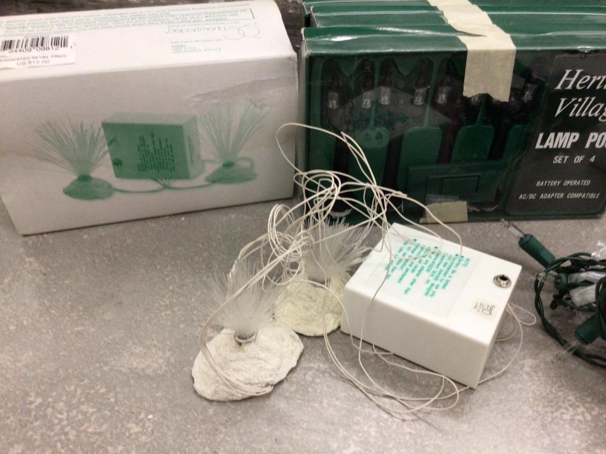 You get two sets Street Lamps set of two, three Street Lamp Sets of four., two fiber optic bushes light and string of Xmas lights. Everything is Dept. 56 Accessories except the string of lights.
