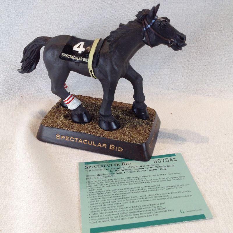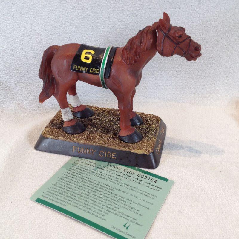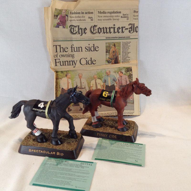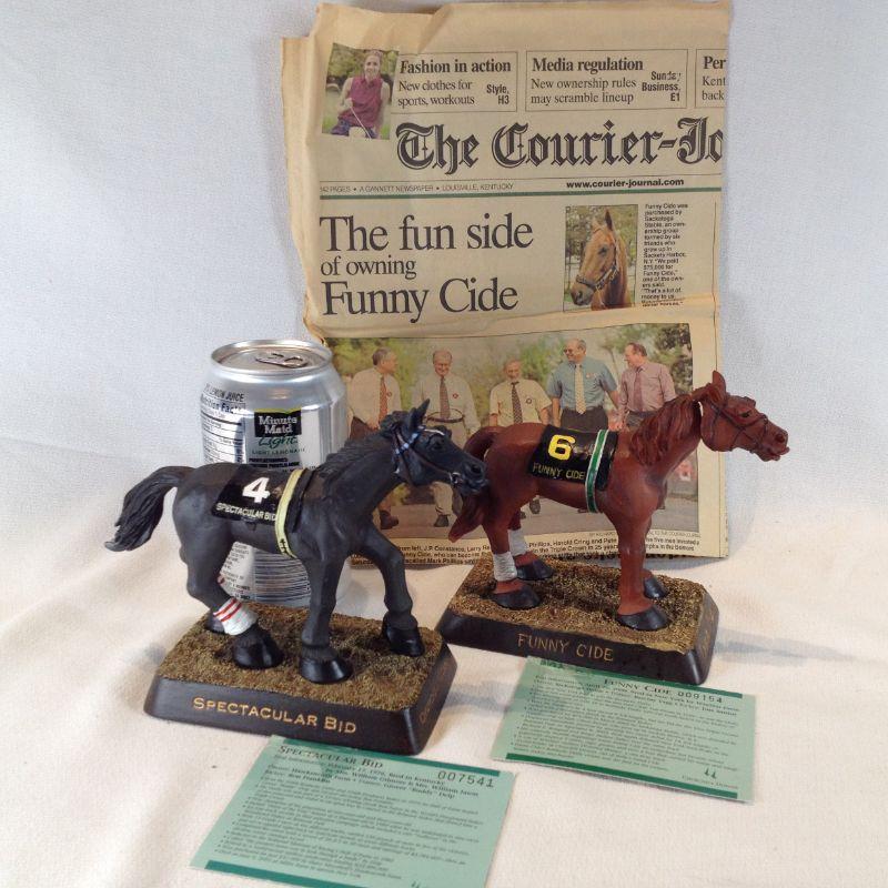These bobble heads includes "Spectacular Bid" - winner 1976, certificate #0007541 and "Funny Cide" - winner 2000, certificate # 009154 with a newspaper article from the Courier-Journal - June 1, 2003 on Funny Cide. Nice addition for derby party decor or a great addition for any Derby collector. This has a starting bid/reserve of $10.