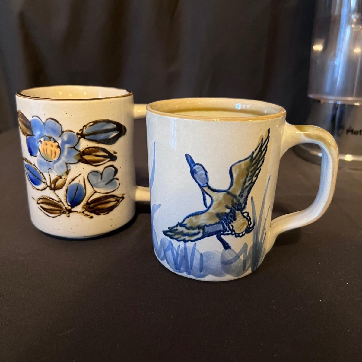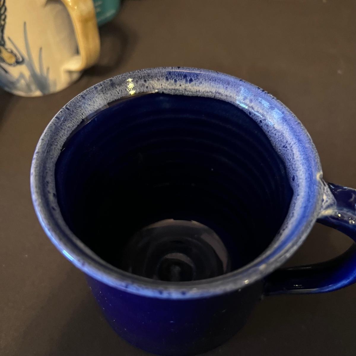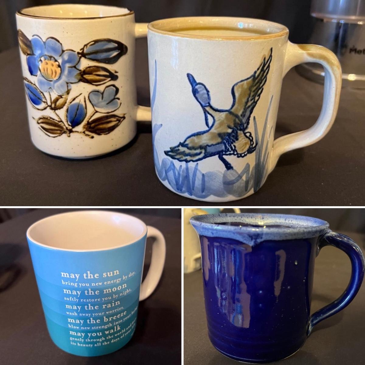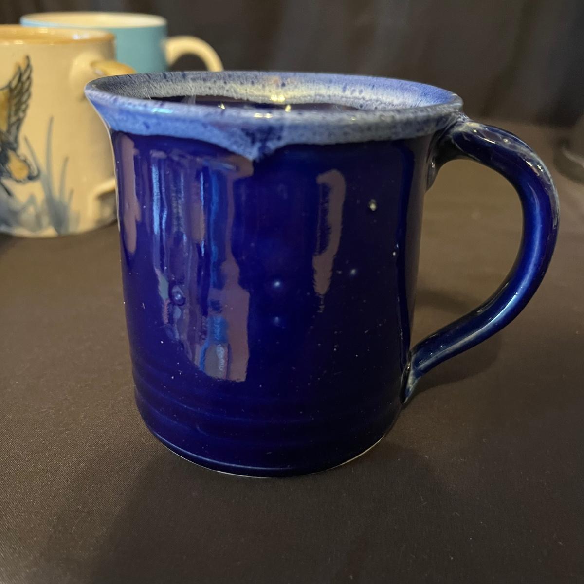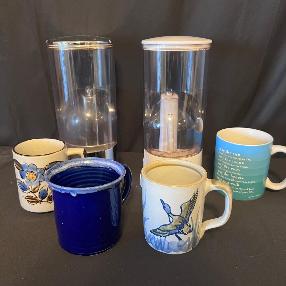 An assortment of mugs includes a cobalt blue glazed mug by Derrick Garrou of Black Mountain. Lot also includes two Metari plastic coffee dispensers.