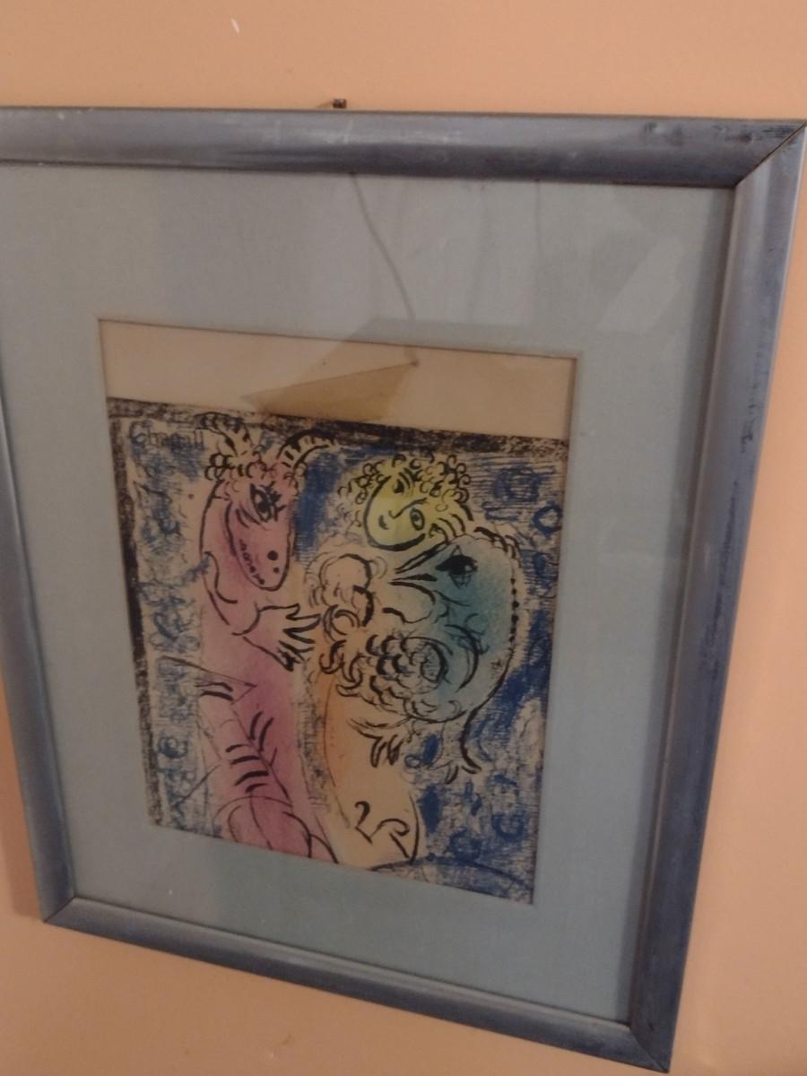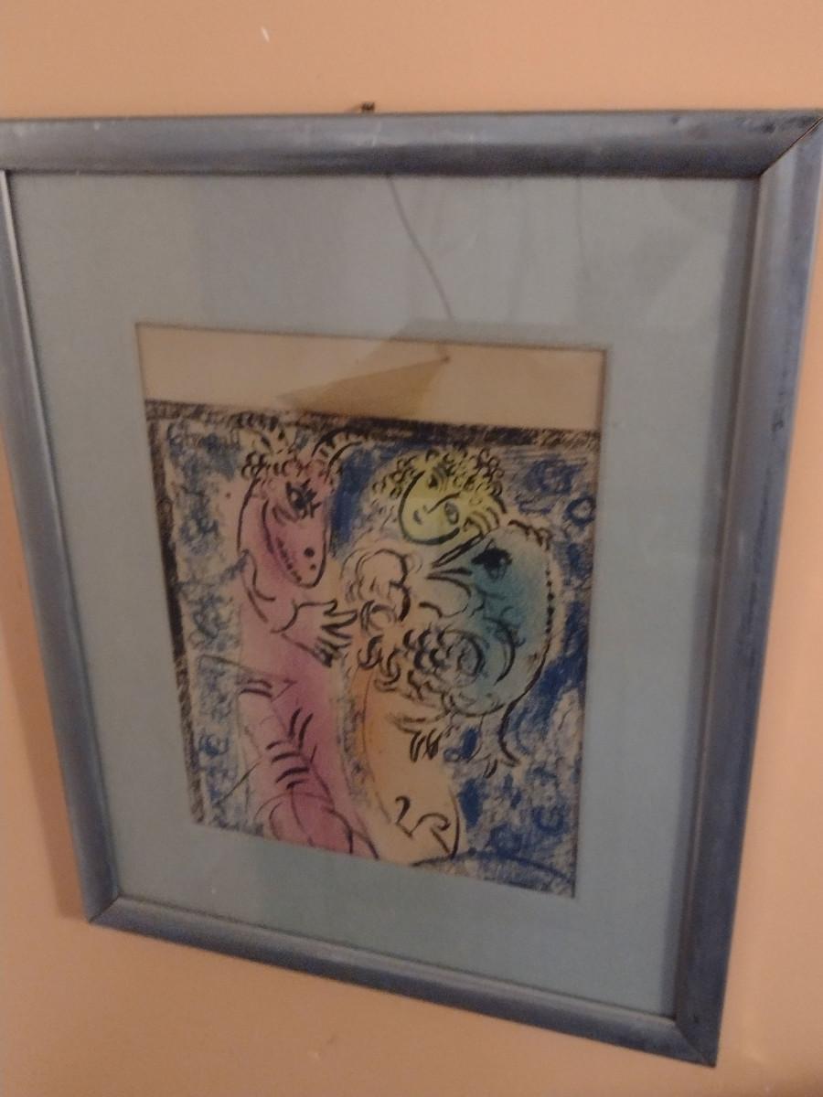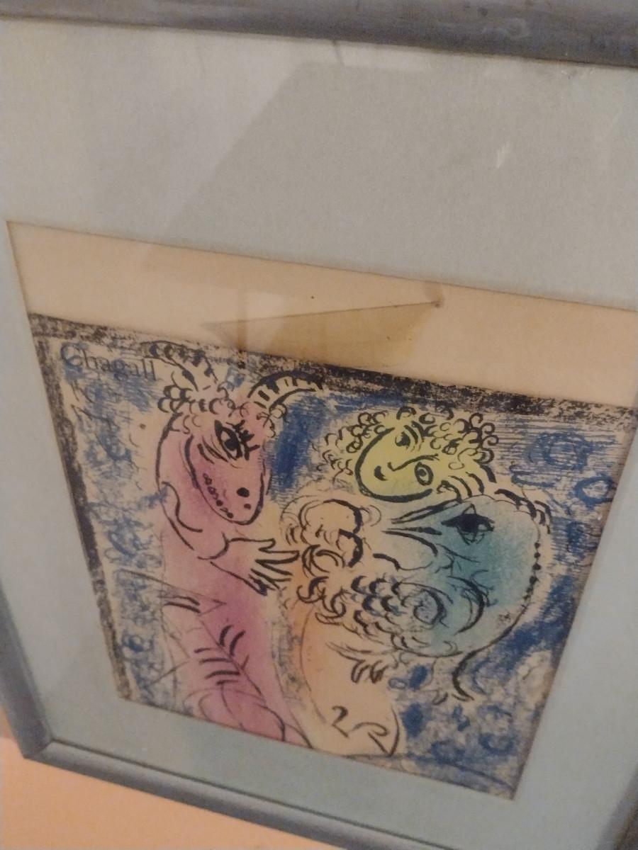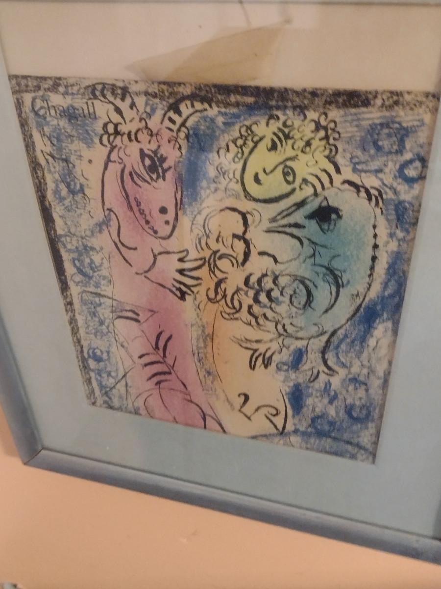 "Derriere le Miroir" by Marc Chagall Print- Framed Under Glass- Approx 17 1/2" x 22". Item has slipped in frame and needs to be rearranged.